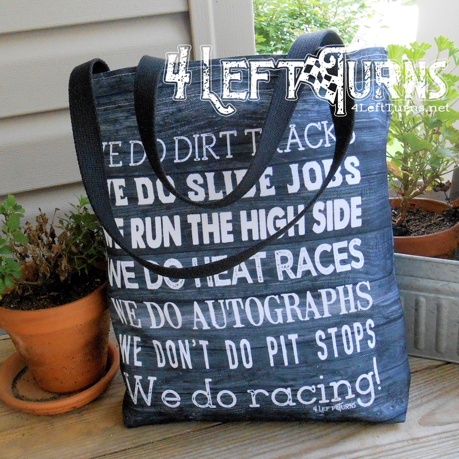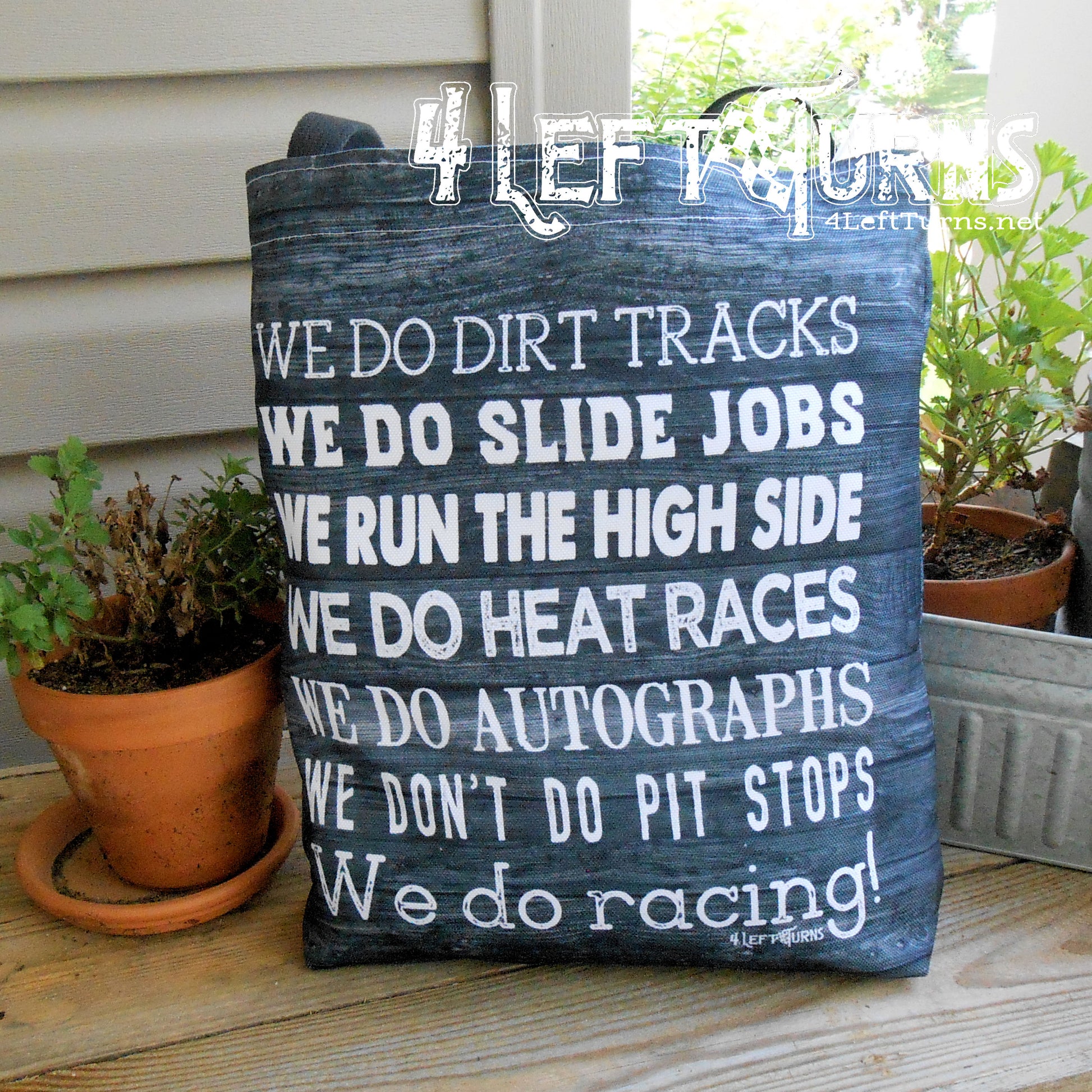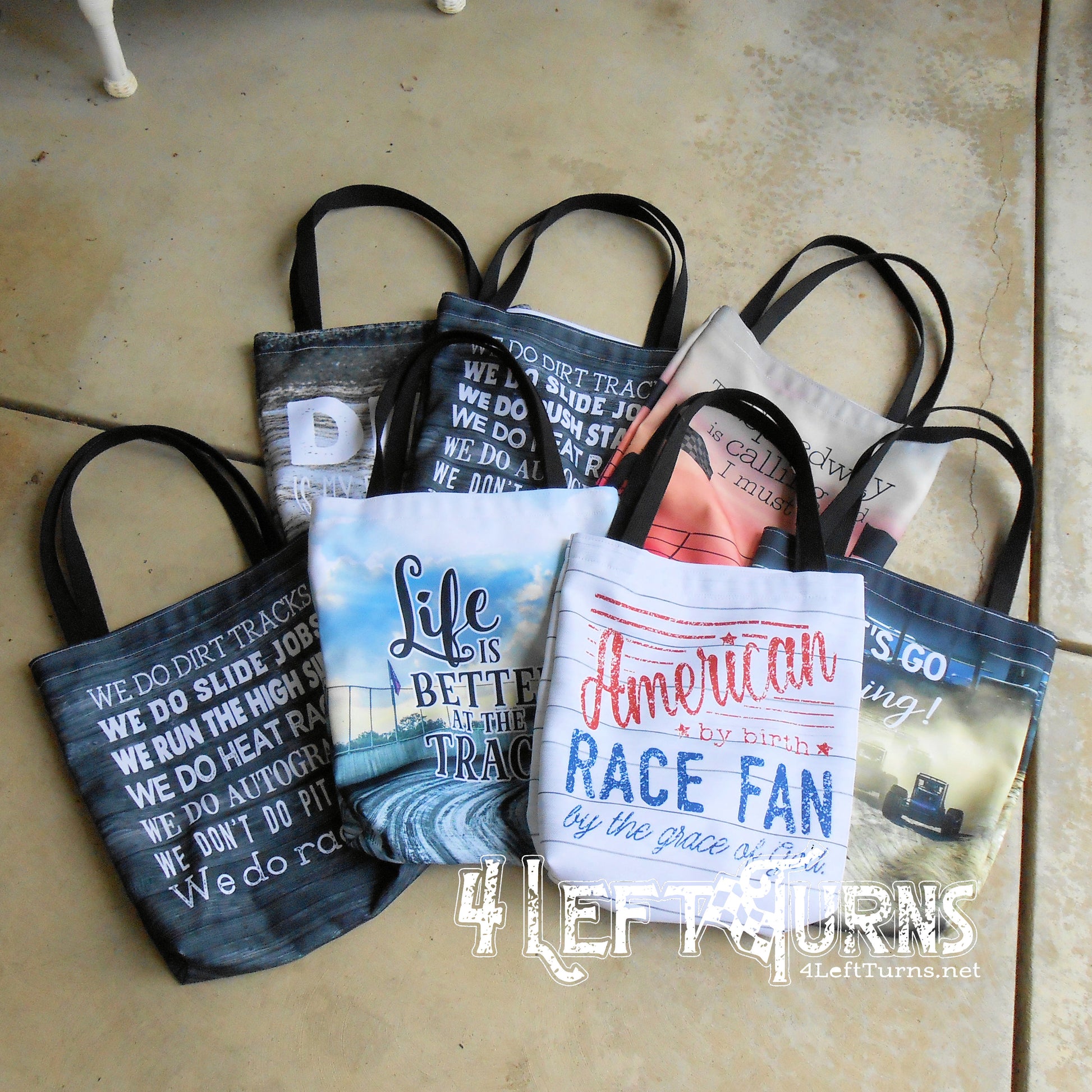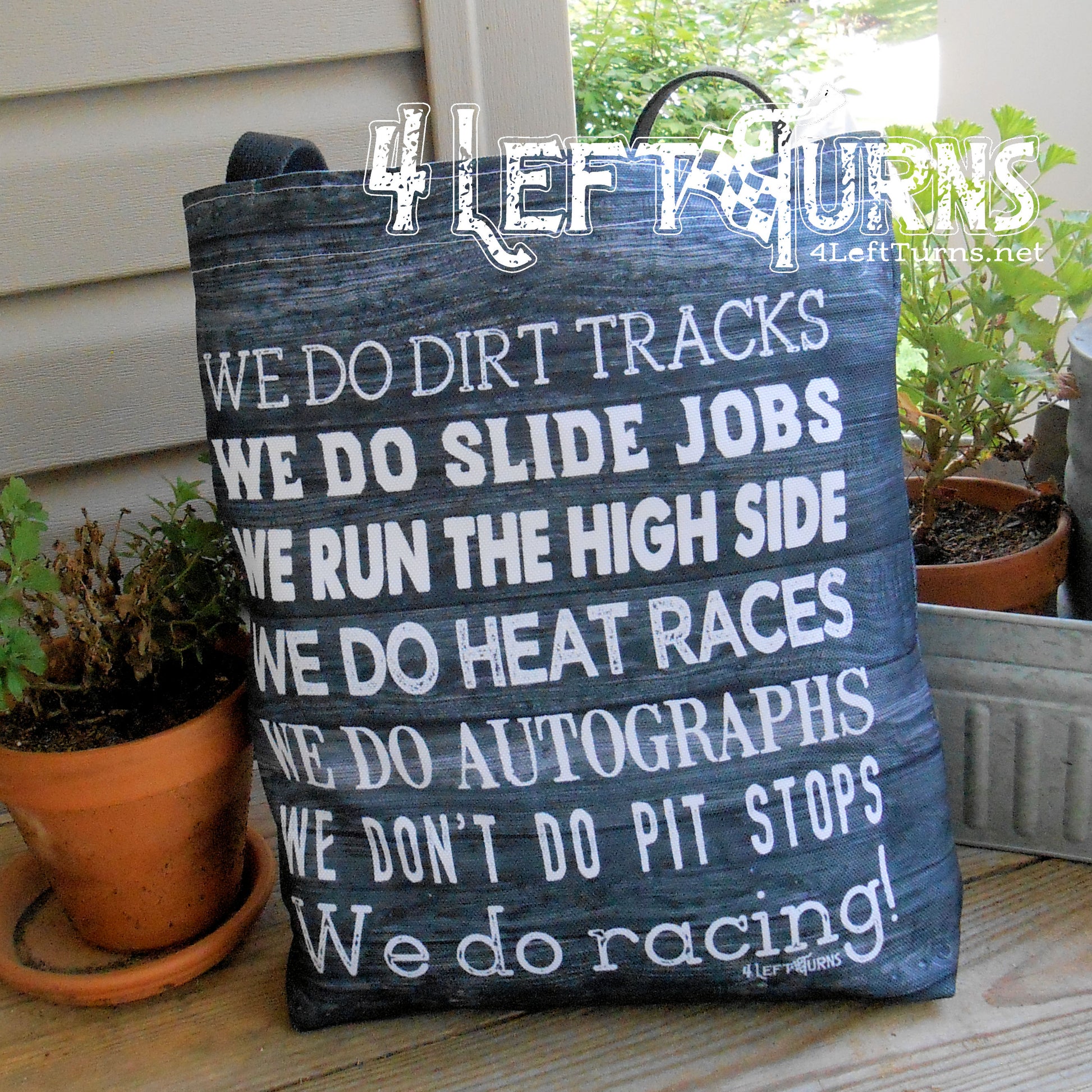 If racing is your bag, the 4 Left Turns tote is for you! Each bag is printed in rich, vibrant color. Four of our designs use the photography of Greg and Stacy Stanek of G & S Stanek Photography.