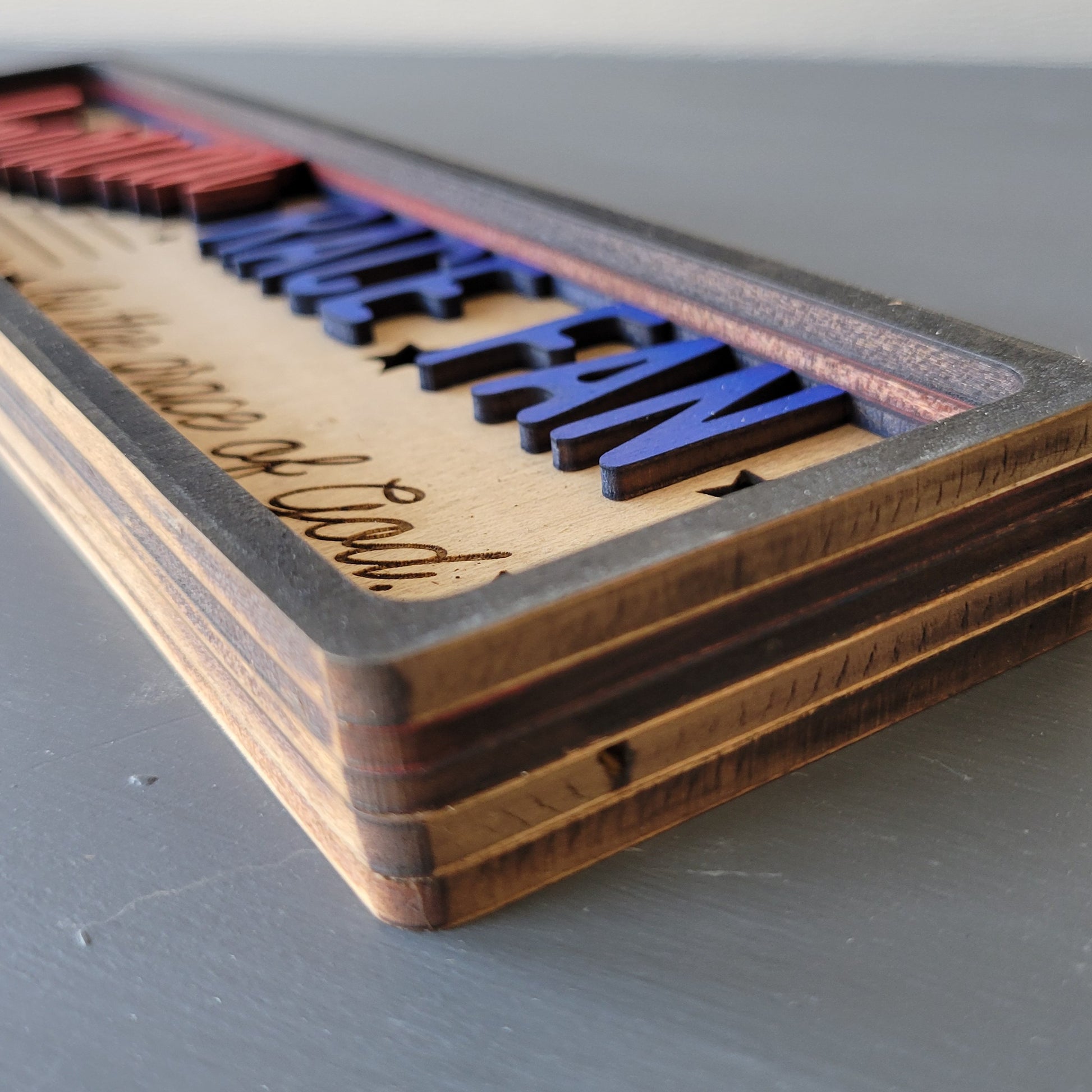 Our stacked wood signs are made of laser cut and engraved layers. This one is five layers, making it about 7/8-inch thick. The layers are painted and glued together. The thickness of the piece makes it easily stand on it's own. The size is perfect for a shelf or windowsill, any place that just needs a little something.