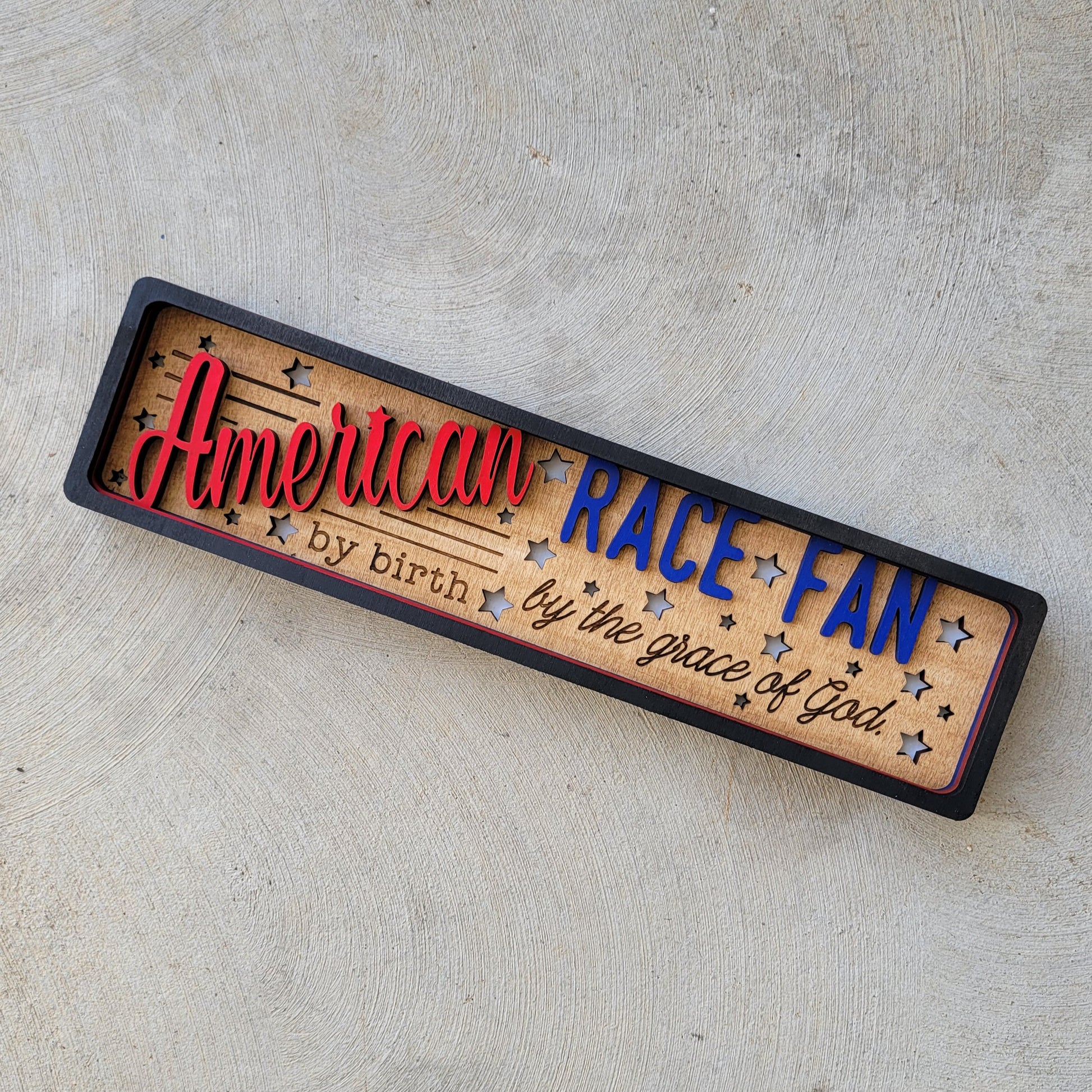 American by Birth Race Fan by the Grace of God Stacked Wood Sign
