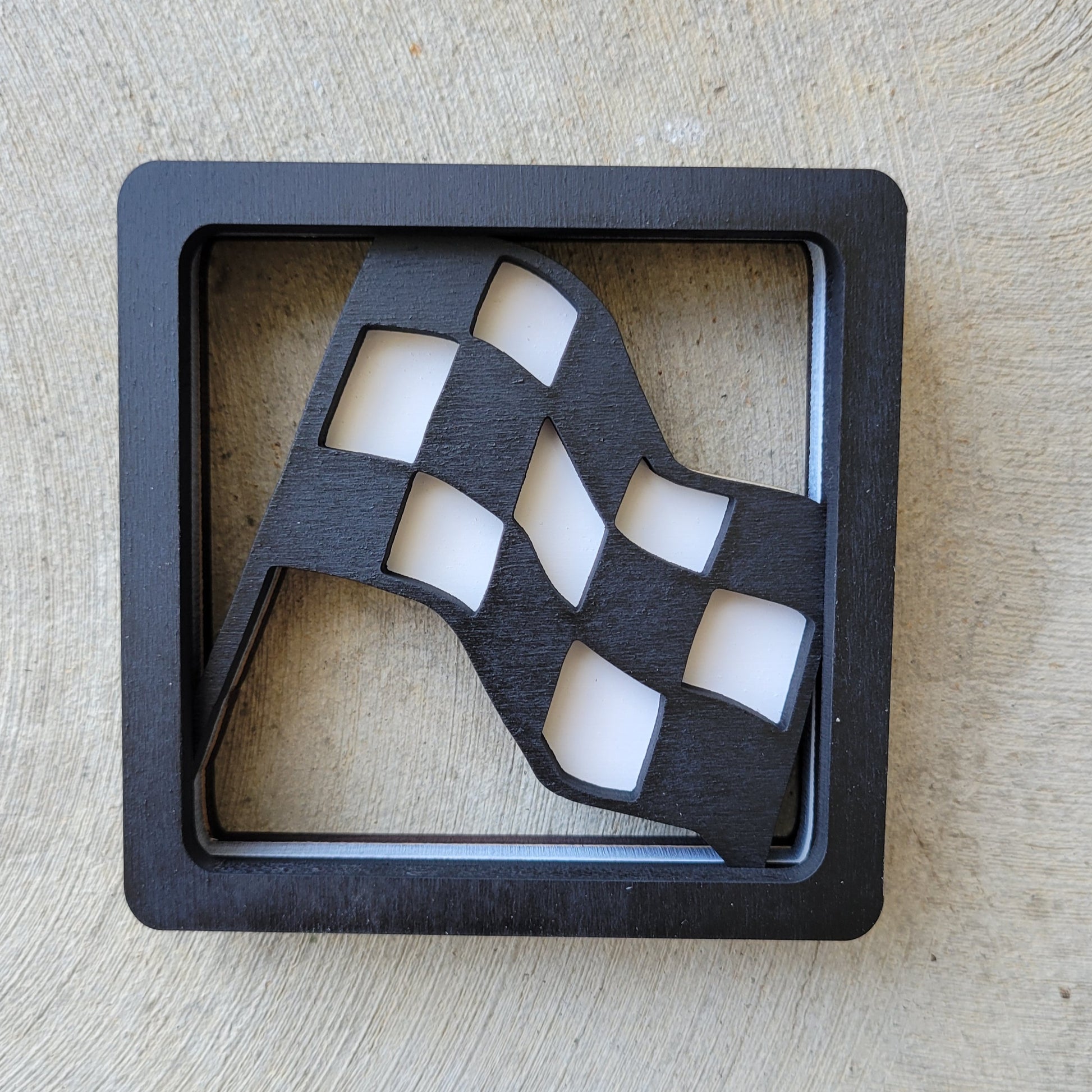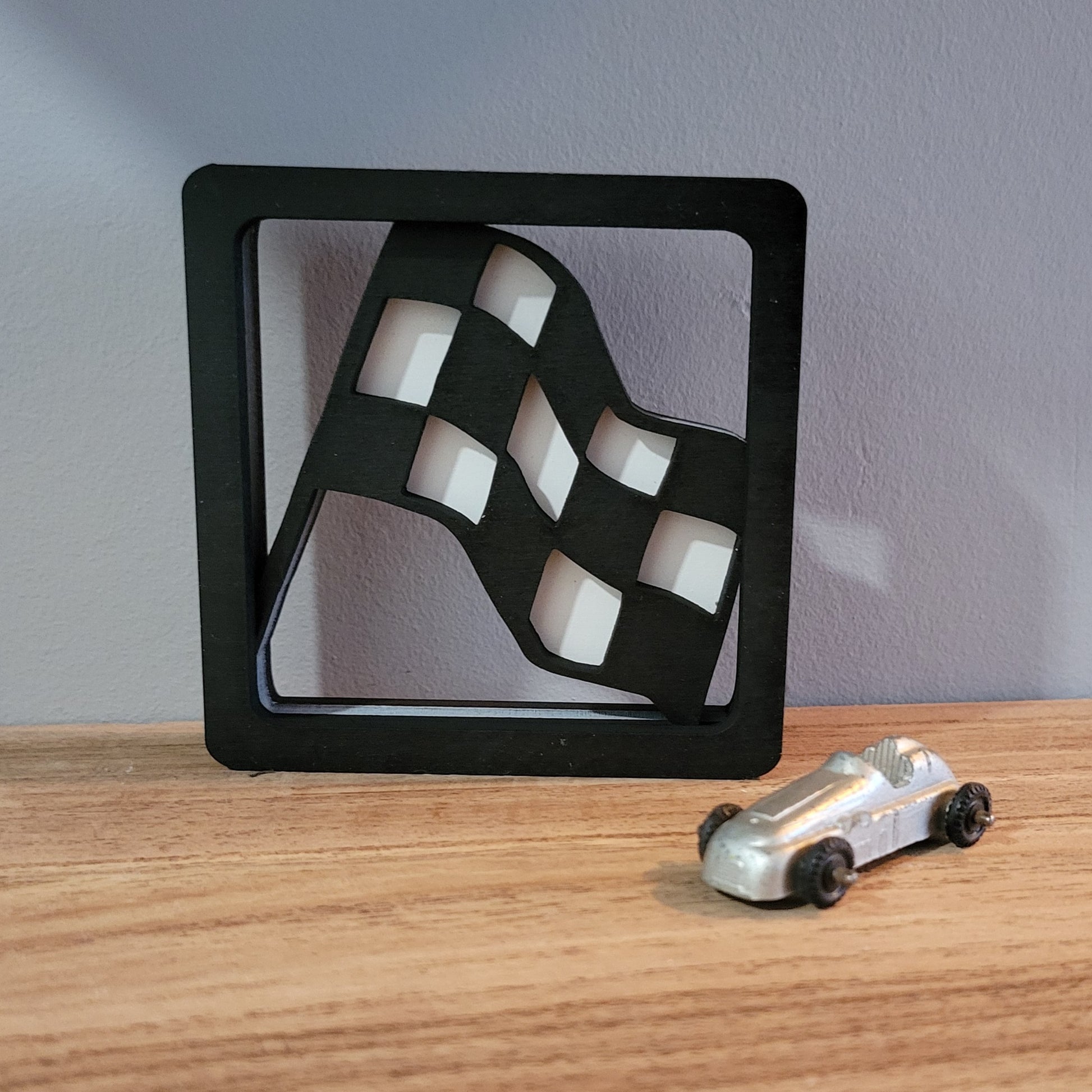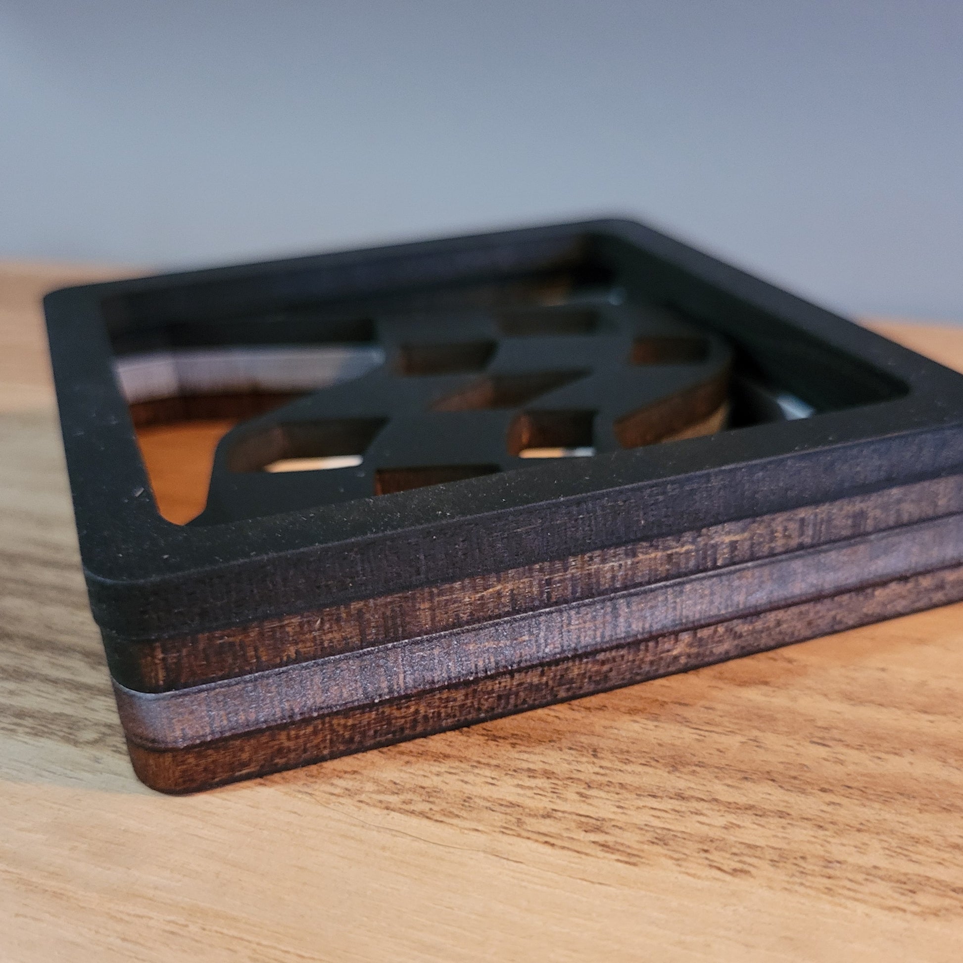 Our stacked wood signs are made of laser cut and engraved layers. This one is four layers, making it about 7/8-inch thick. The layers are painted/stained and glued together. The thickness of the piece makes it easily stand on it's own. The size is perfect for a shelf or windowsill, any place that just needs a little something.
