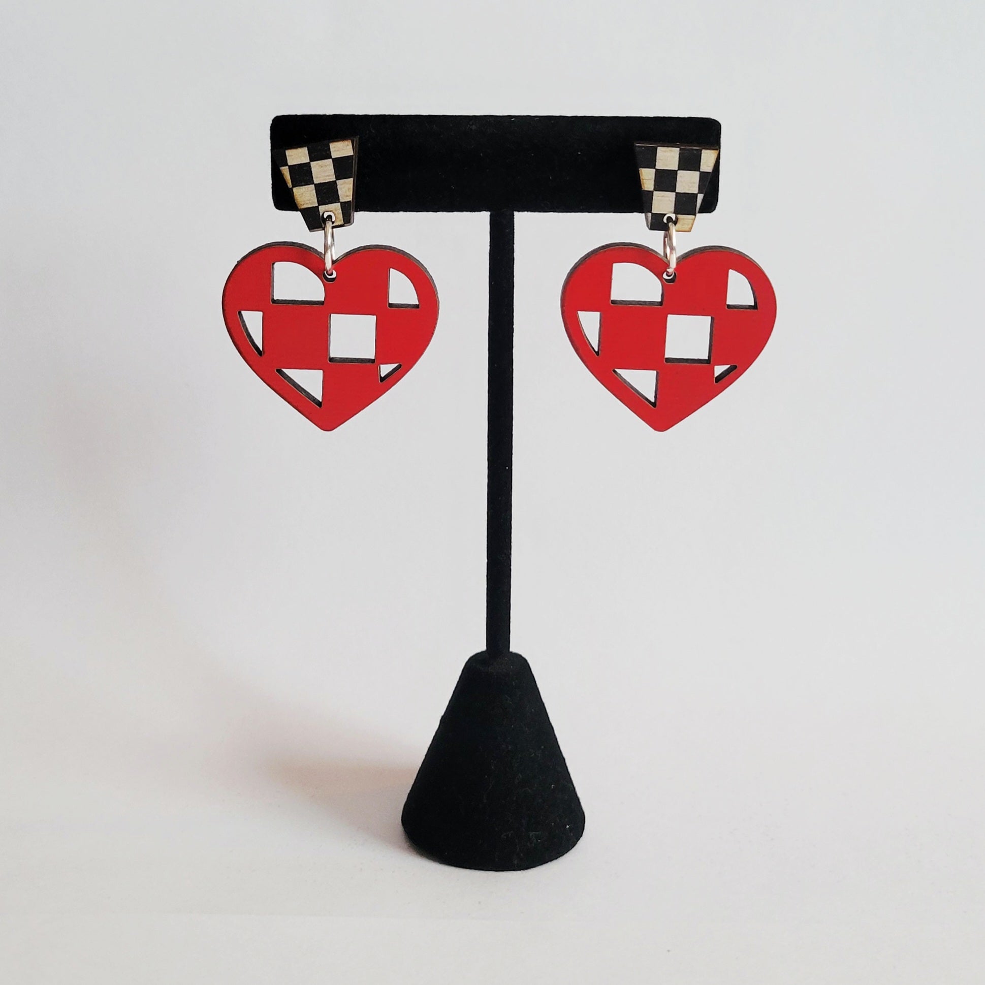 Our Checkered Heart Silhouette Earrings are made of pre-painted 1/8" MDF and cut on our laser. They are available in any of the colors shown. They measure about 1-1/8" in length, and width. These are very lightweight. The post is hypoallergenic stainless steel. We do not recommend that they get wet.