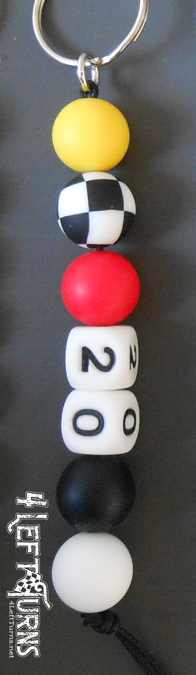 Choose your two colors (one bead each) and we'll combine them with black and white and wavy checkered flag beads to complete your key fob.