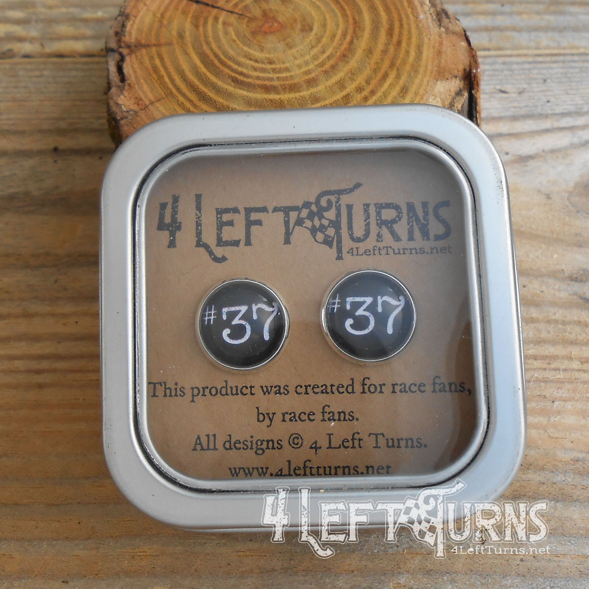 Choose from black or white background, with the opposite color numbers/lettering. Post earrings come in a gift tin.