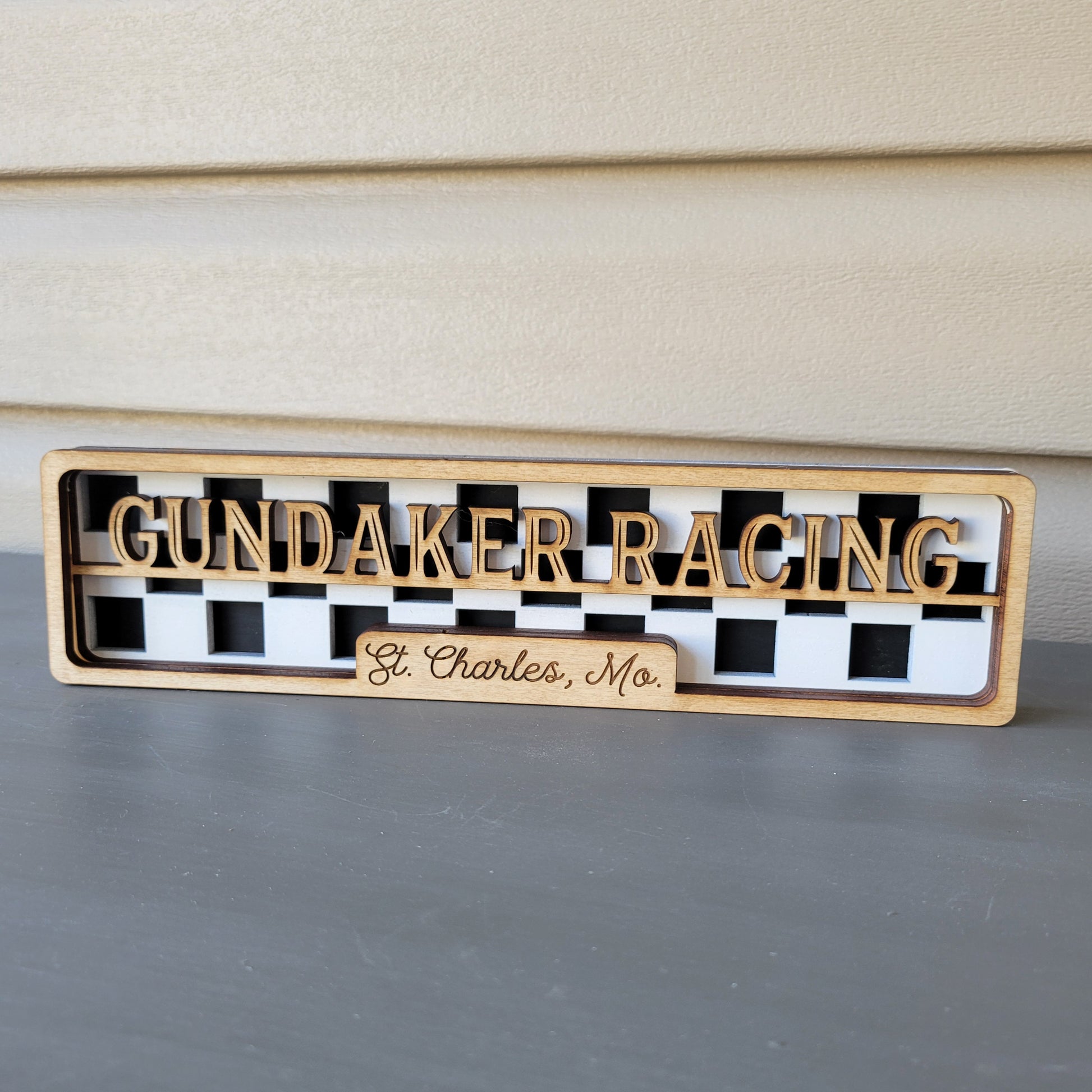 This is our first custom lasered stacker sign. It contains four layers, a black background, a white checkered layer, a custom name and another custom layer. You get to choose what those top two layers say. We went with a race team, and home town, but you can choose a last name and a wedding date, or two first names with an ampersand, and a last name in front. It's really up to you. Please keep in mind that the more letters you use, the smaller they will be in order to fit in the spaces, Whatever you enter in the boxes is EXACTLY what we will put on your sign. Be sure to check spelling, capitalization and punctuation before completing your order. We will not refund an order due to customer error.