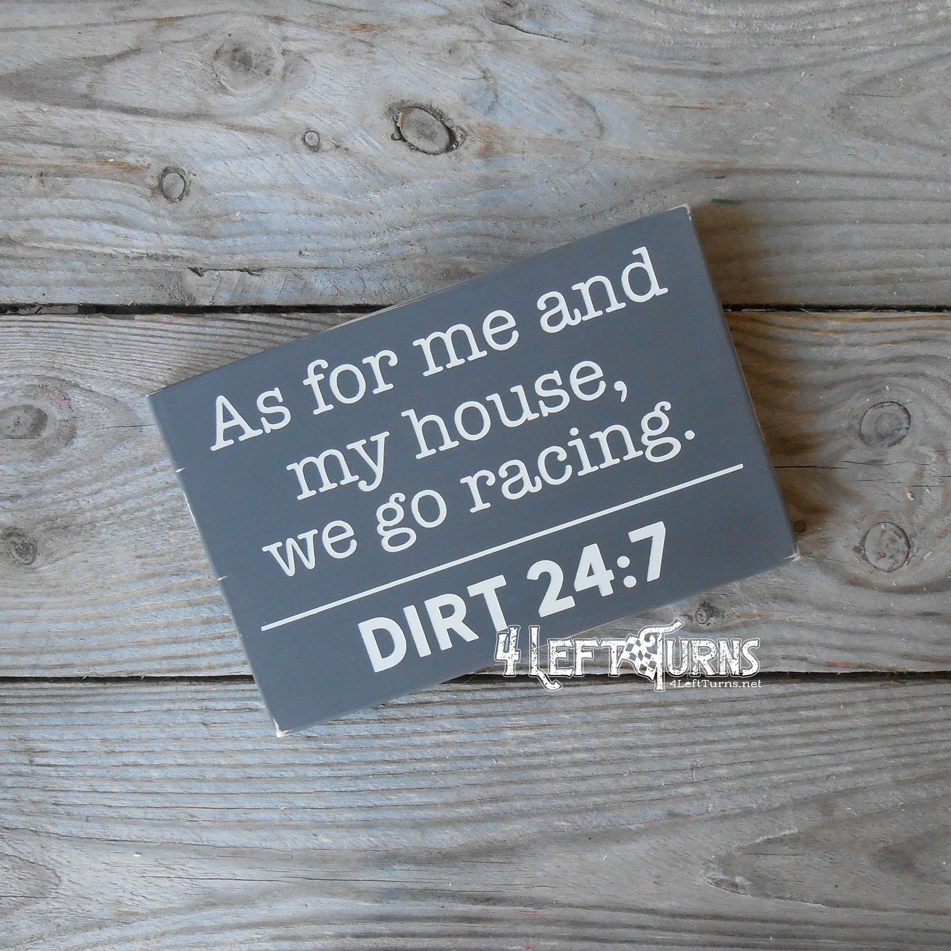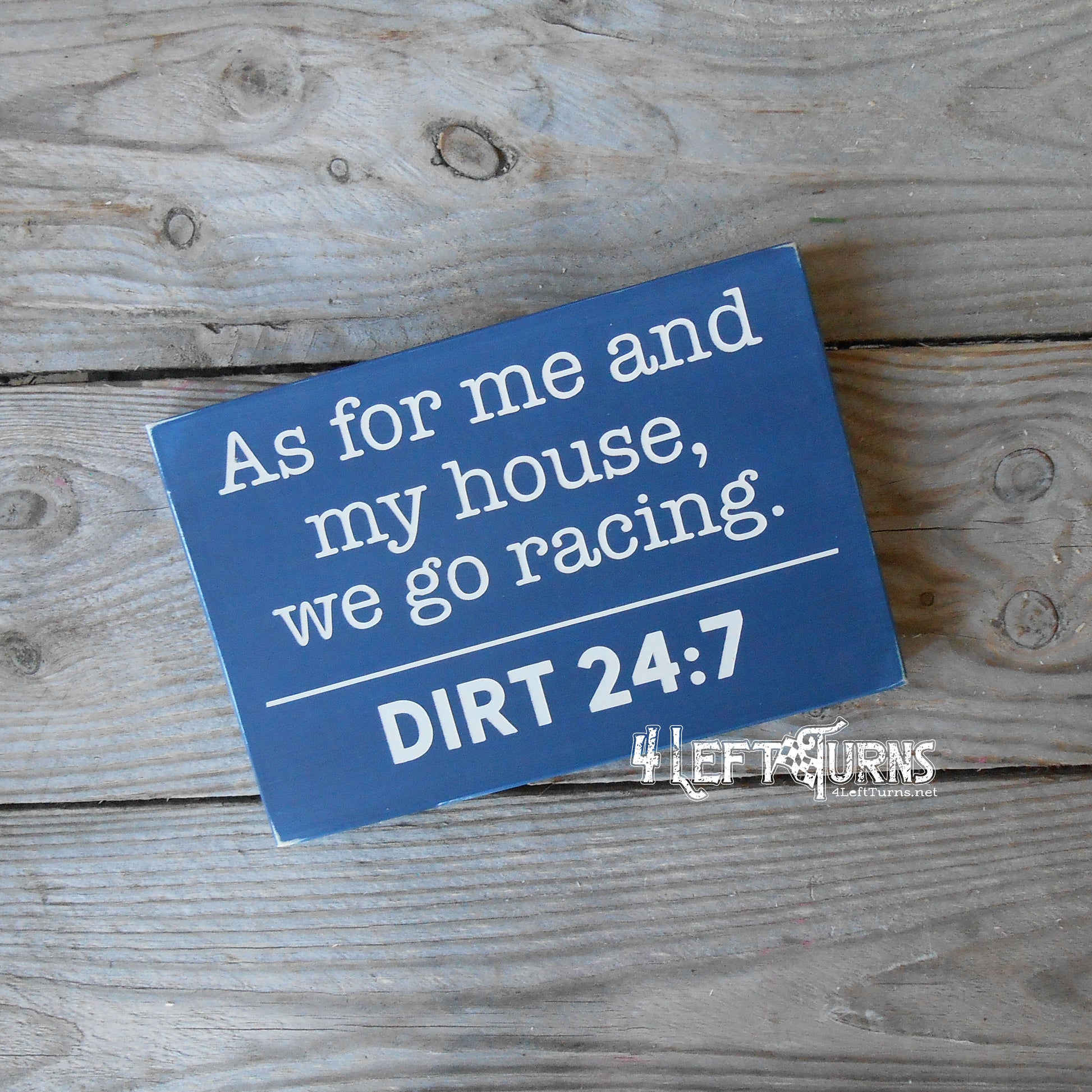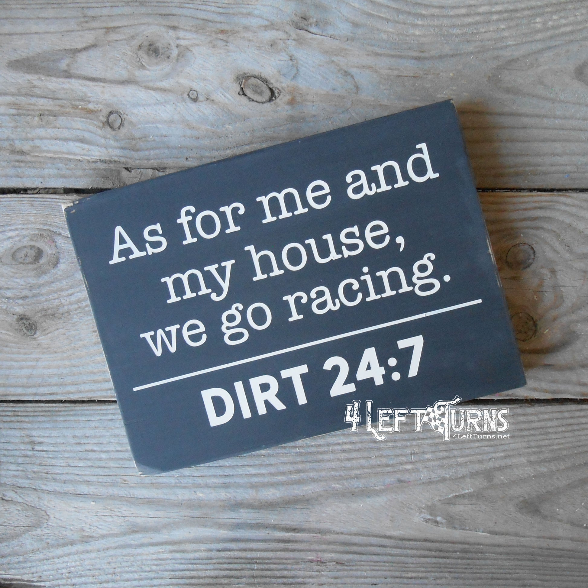 This original 4 Left Turns design is painted on a one-inch thick wood plank, in your choice of colors. It comes in two sizes, measuring 10 x 7.25 or 8 x 5.25 inches. All sizes are approximate. Our signs are distressed for a time worn look and sealed for protection. For indoor use only.