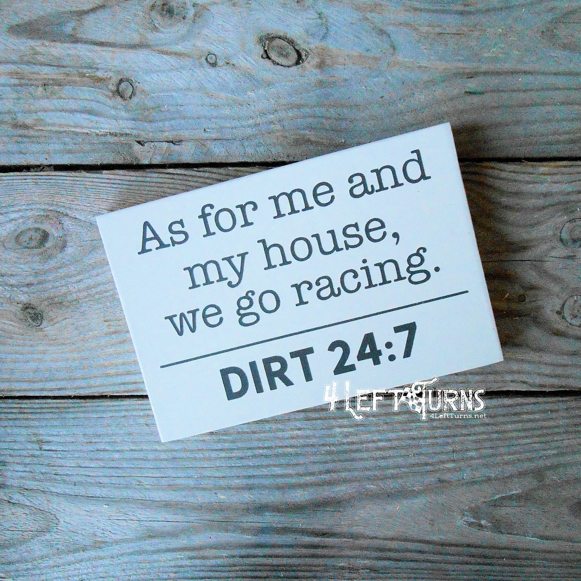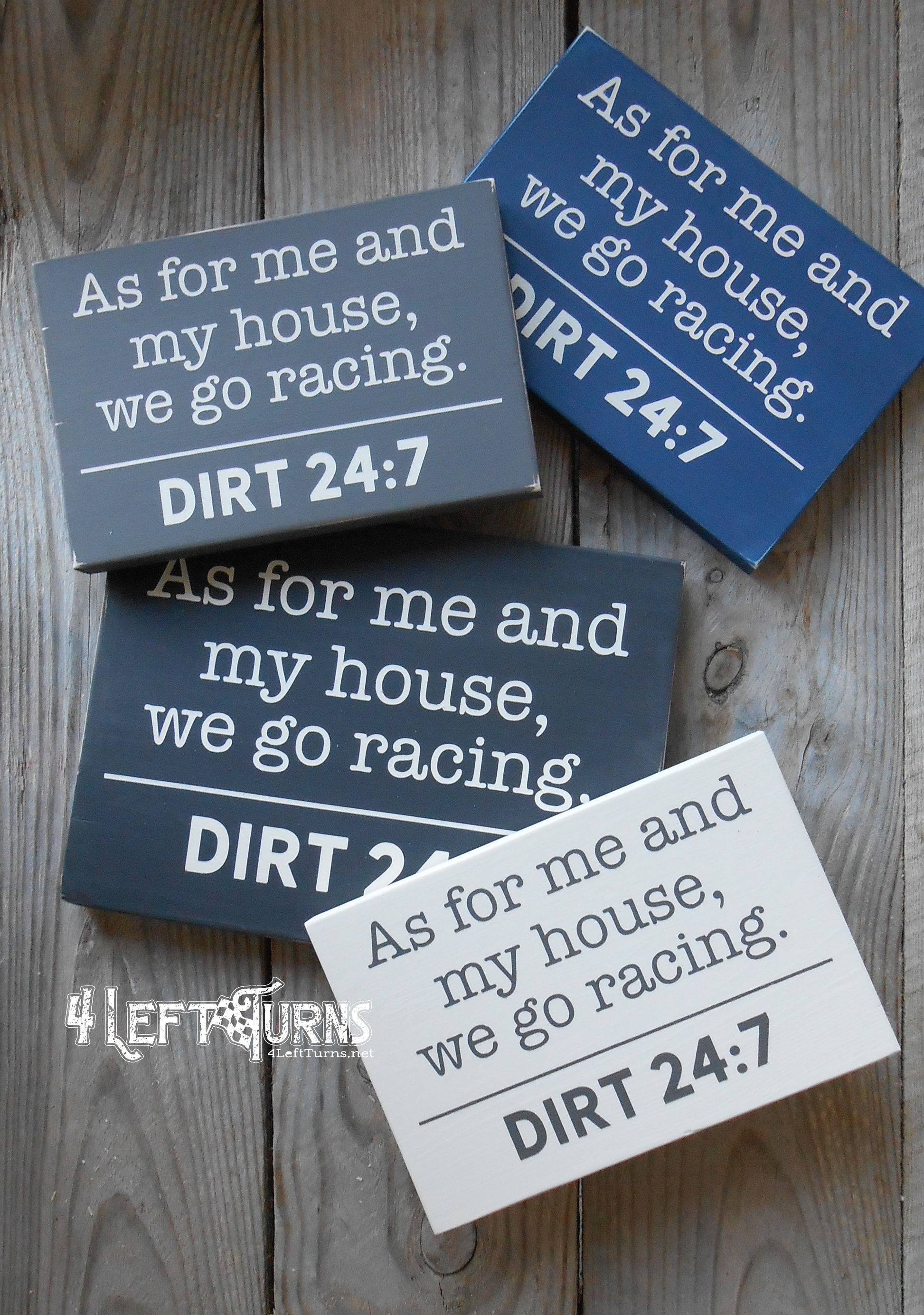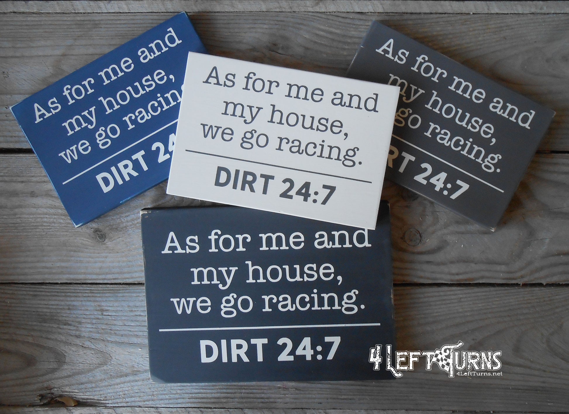 Web site and all designs, images and products ©4 Left Turns. All rights reserved. All 4 Left Turns items are made to order. Please allow 5-7 days production time, possibly more during busy seasons. All orders will ship via USPS First Class or Priority, depending on the item(s). Once your order has been prepared for shipment, you will receive notification with a tracking number.