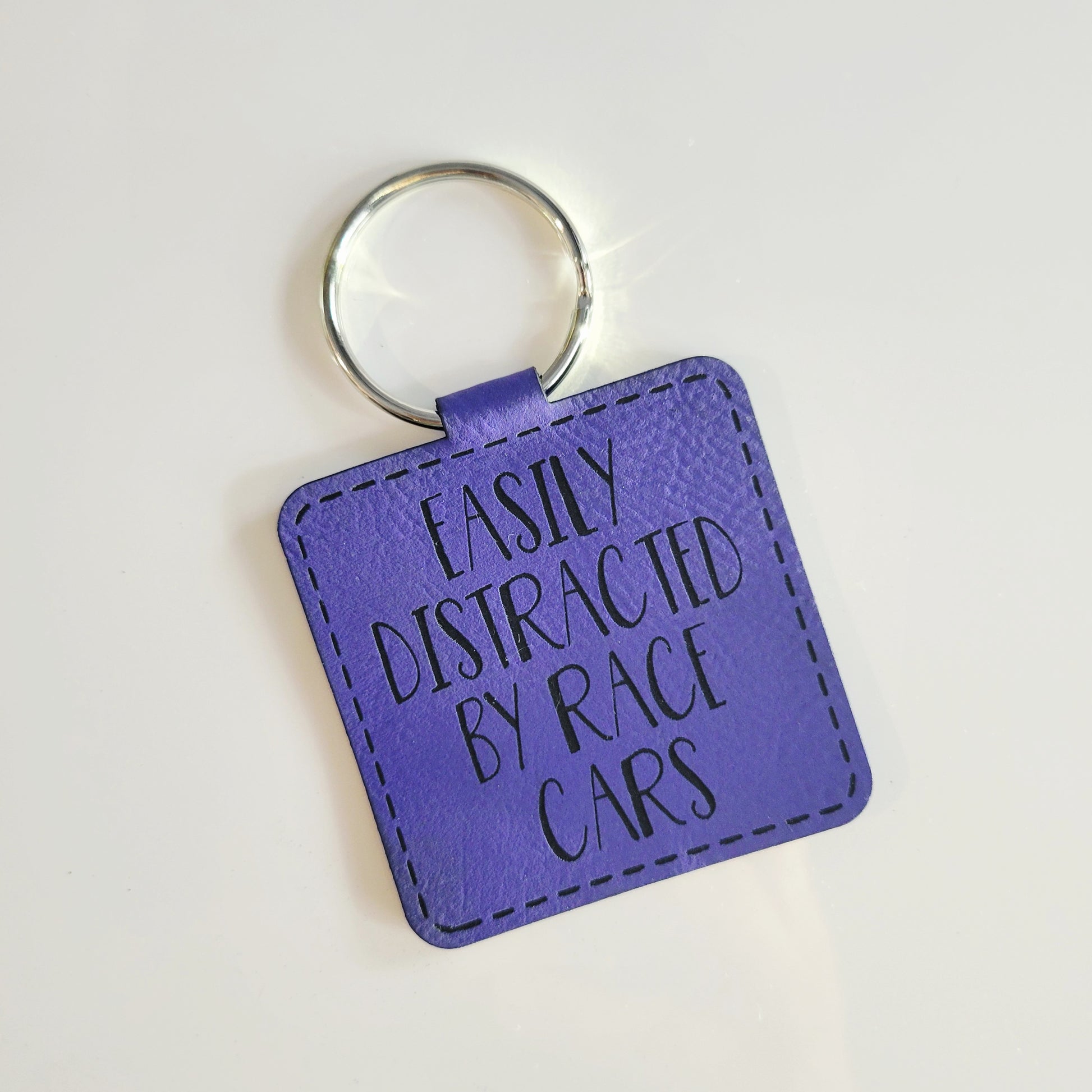 Our Easily Distracted by Race Cars leatherette key ring is a great expression of everything we love about our sport. This two sided key ring has the same design on both sides. The leatherette part measures about 2.25" wide and tall. Split ring is 1.25".