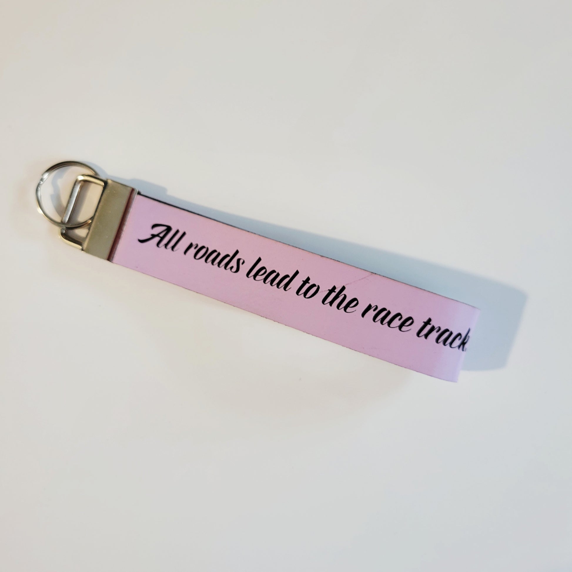 Our leatherette wristlet key ring is a great expression of everything we love about our sport. This two sided key ring has the same design on both sides. The leatherette part measures about 1" wide and 5" long.
