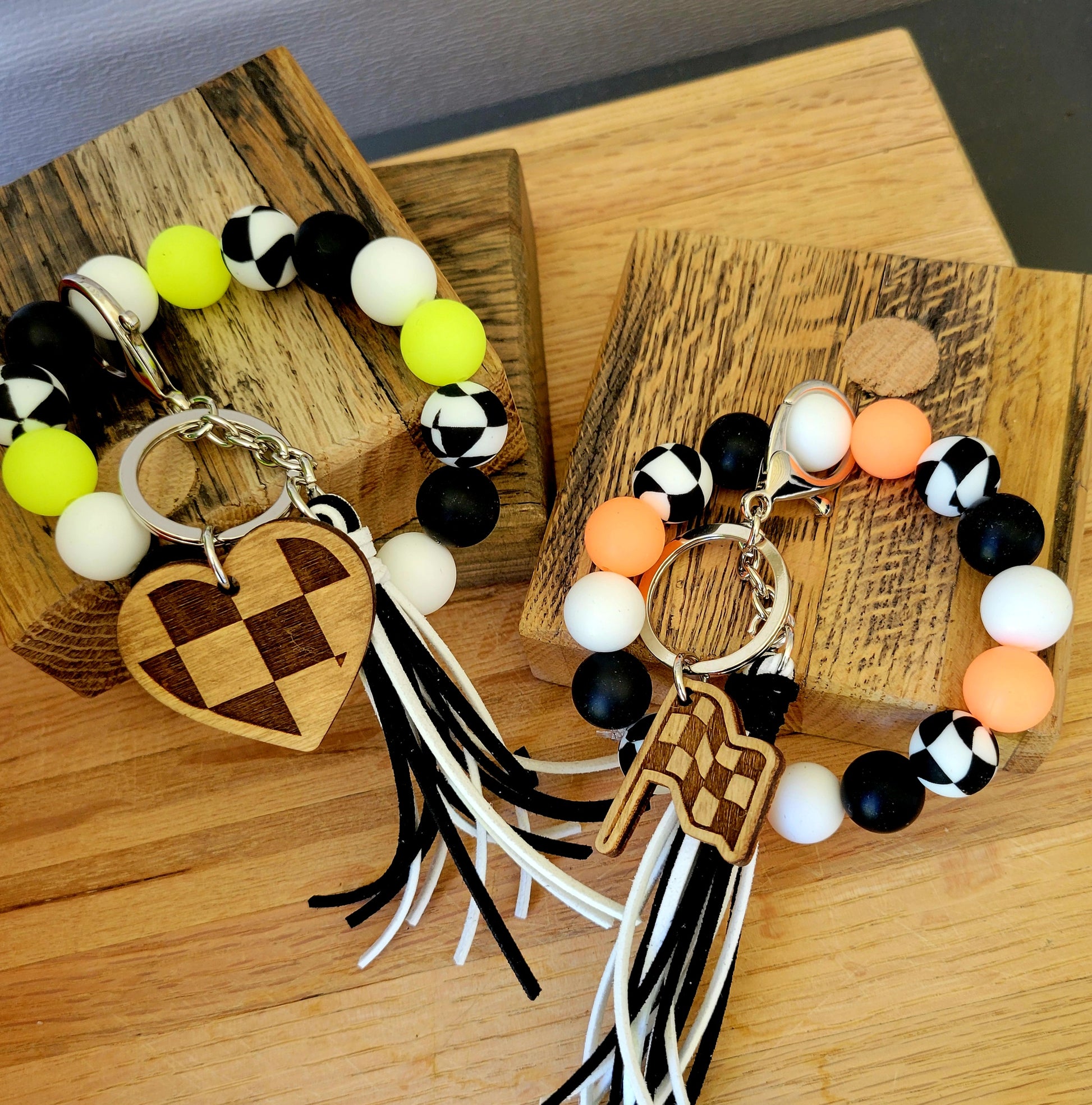 Glow-in-the-Dark Neon Wavy Checkered Flag Silicone Bead Wristlet Bracelet Key Ring with Charm