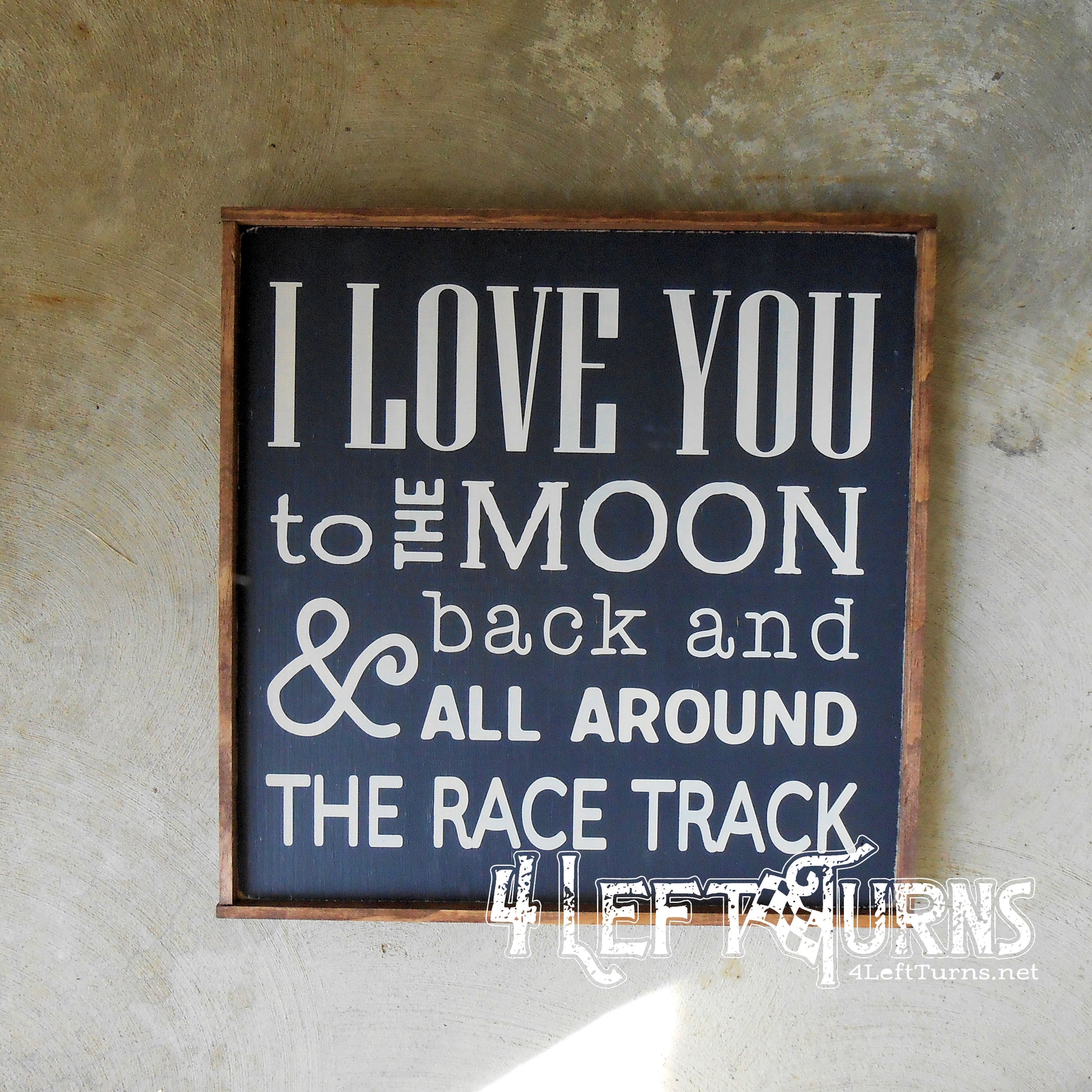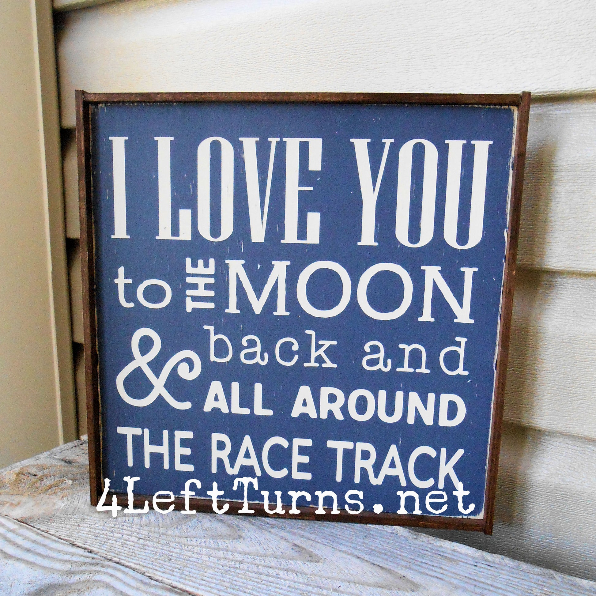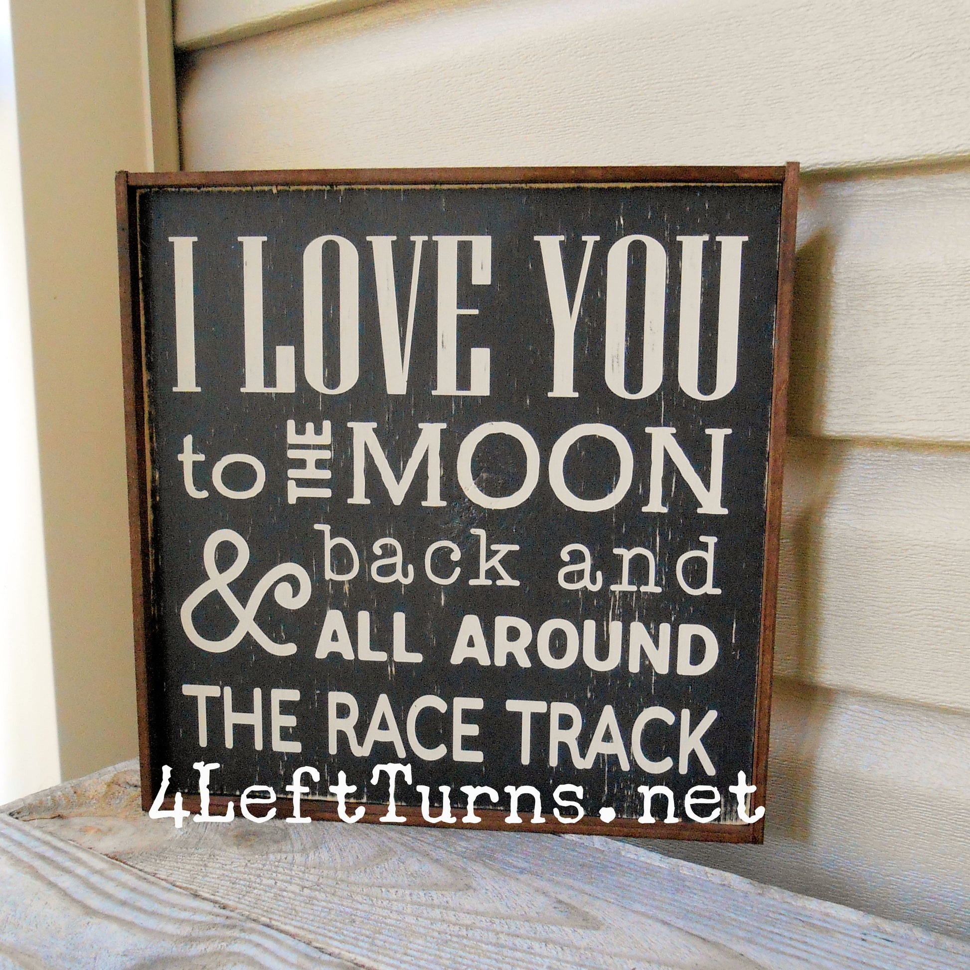 This original 4 Left Turns design is painted on a 9.25 x 9.25-inch wood plank, in your choice of colors. Our signs are distressed for a time worn look and sealed for protection. Available with stained frame or unframed with painted edges. For indoor use only.