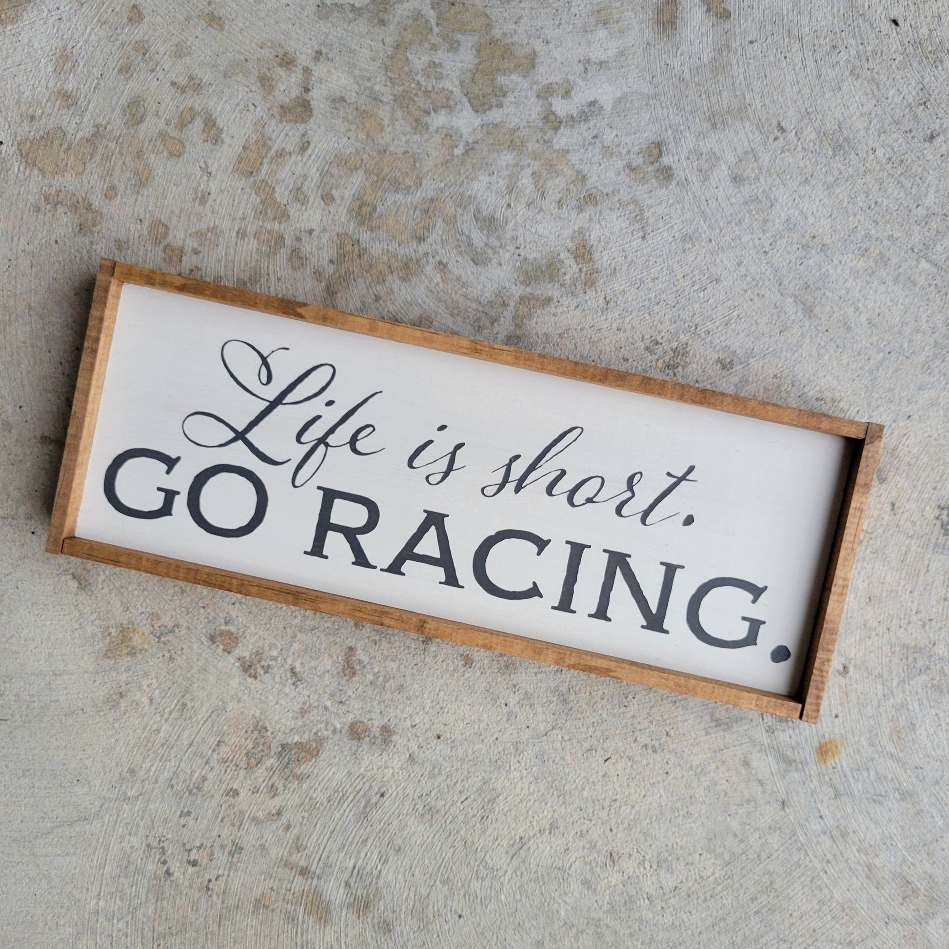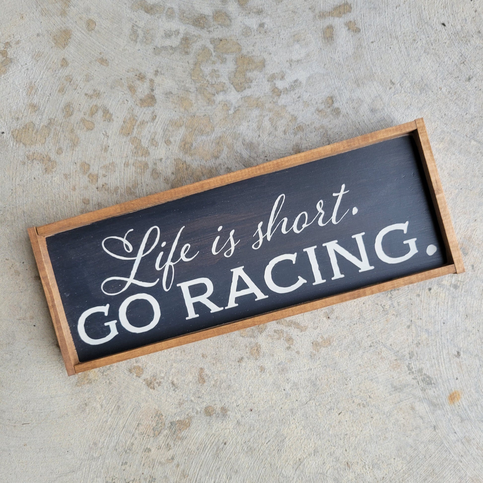 This sign measures approximately 10.5 inches by 4 inches tall. It is painted on solid pine and framed with a stained wood trim.