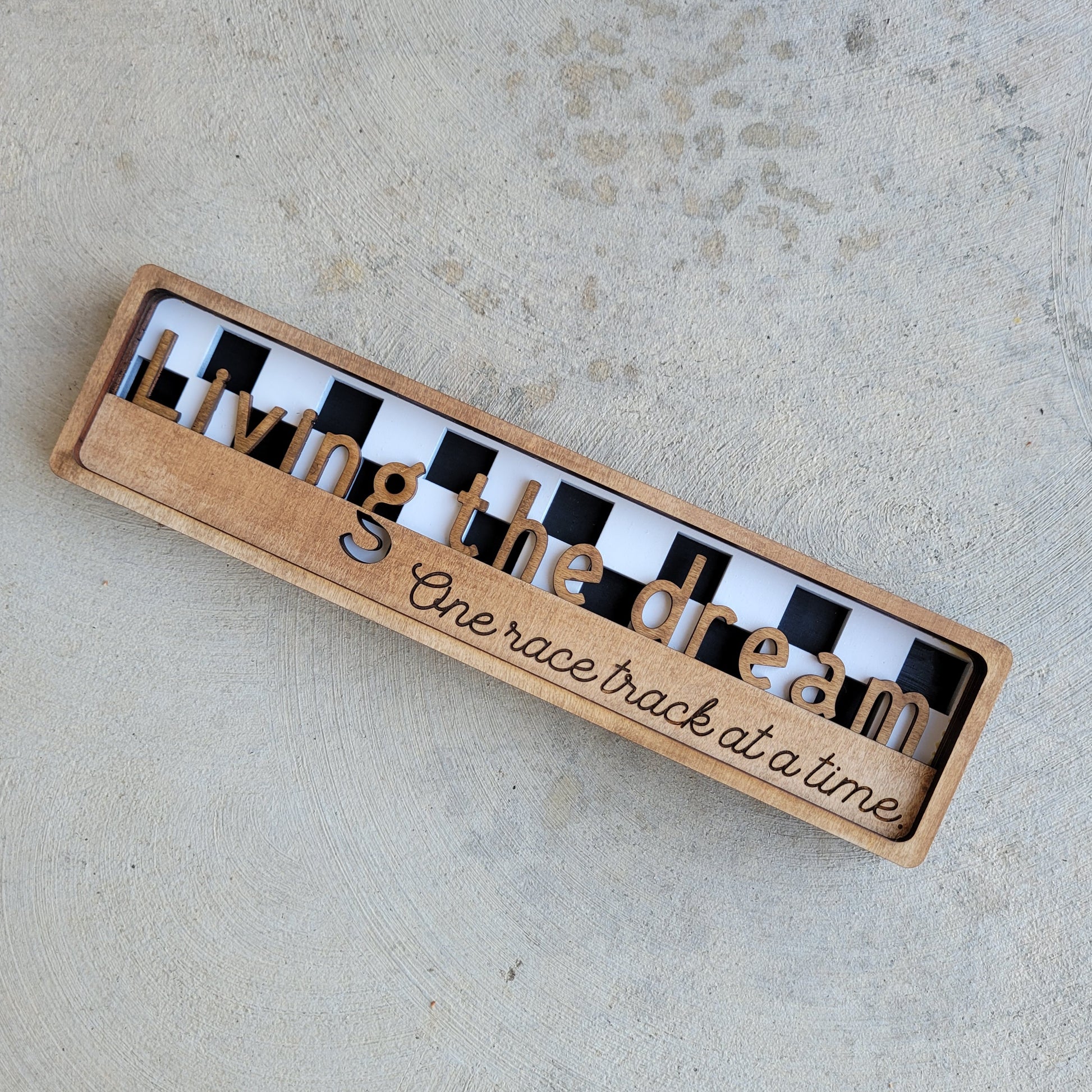 Our stacked wood signs are made of laser cut and engraved layers. This one is four layers, making it about 7/8-inch thick. The layers are painted and glued together. The thickness of the piece makes it easily stand on it's own. The size is perfect for a shelf or windowsill, any place that just needs a little something.