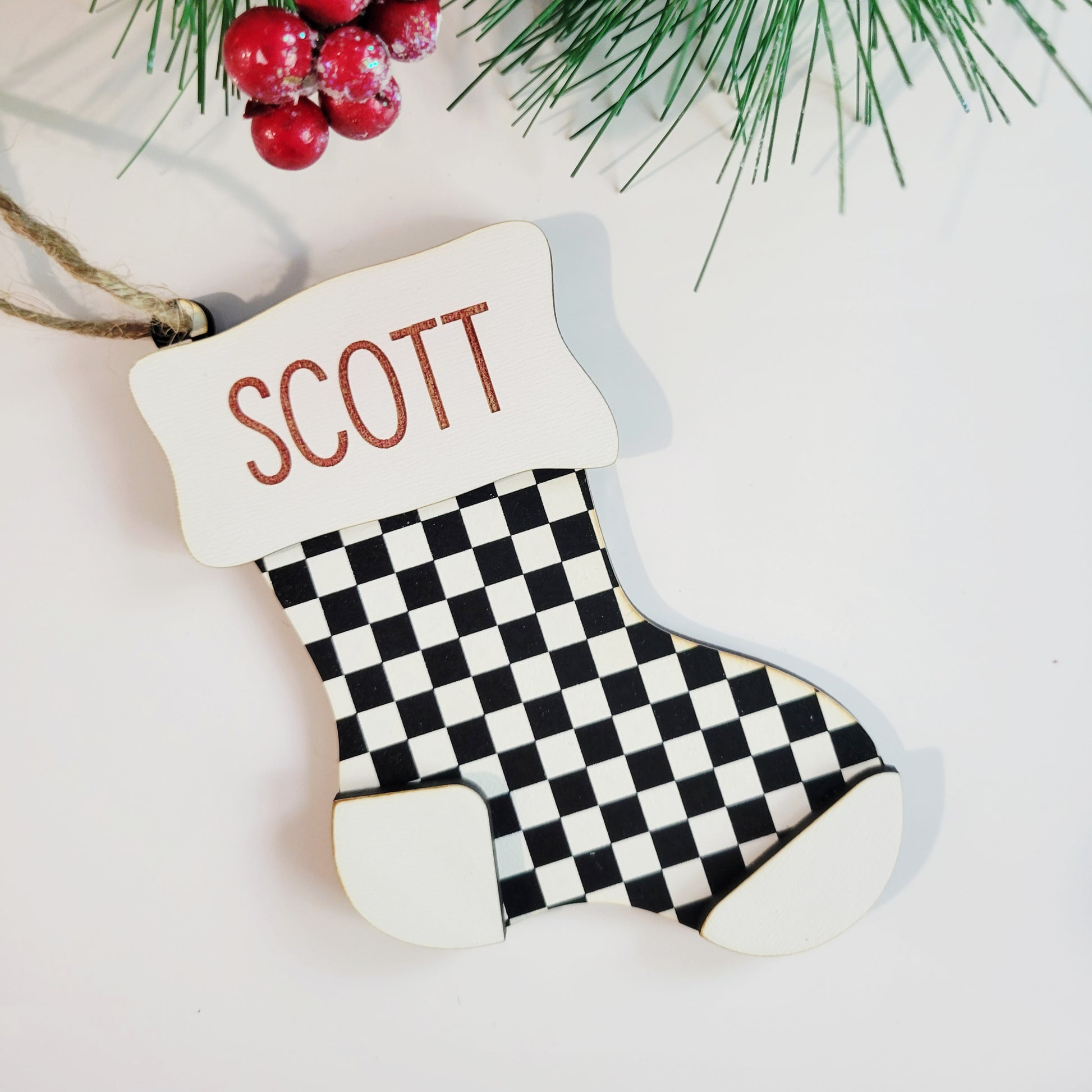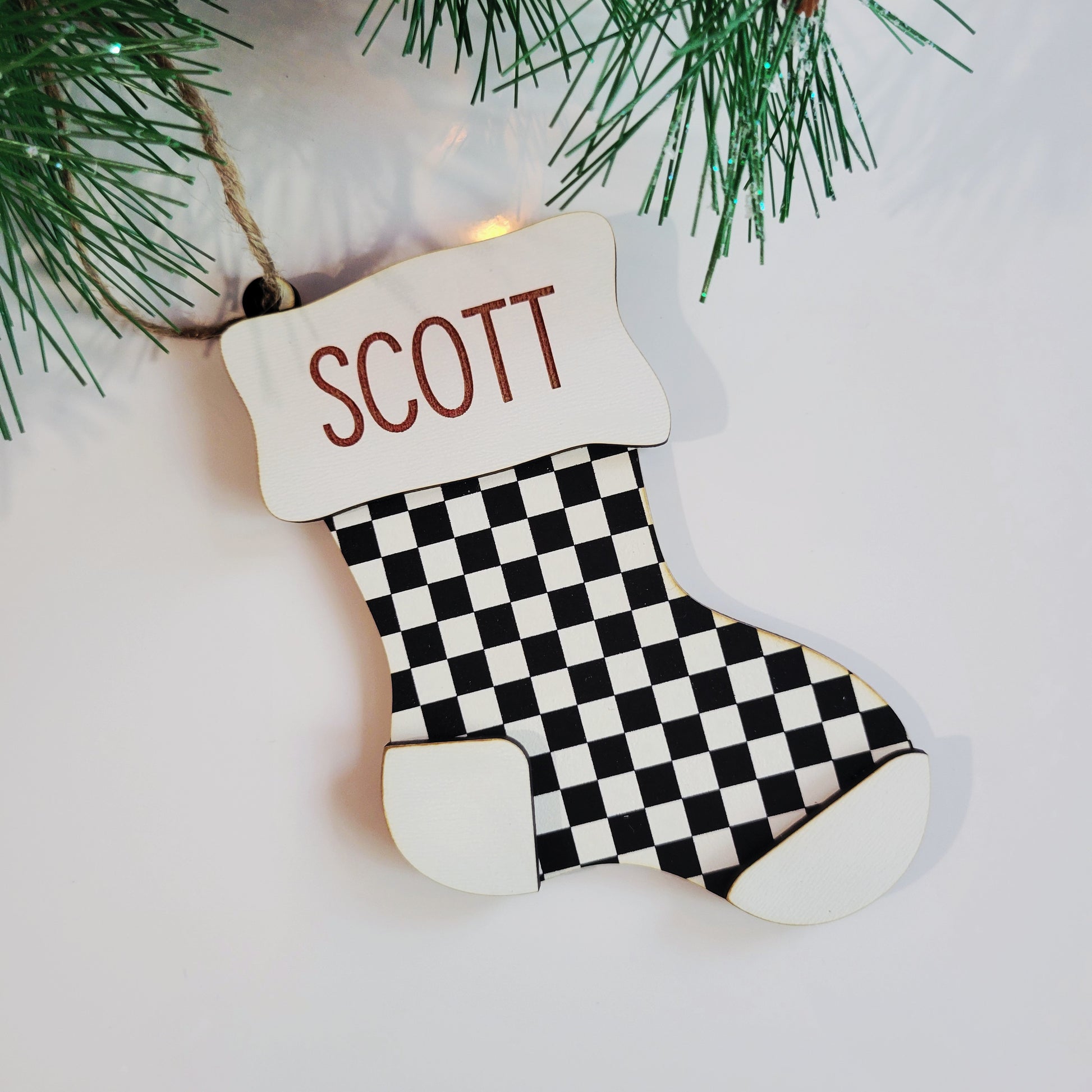 A custom ornament every racer will love! This Christmas stocking ornament is ready for your personalization. It consists of two layers of wood, with a laser engraved topper and twine for hanging.