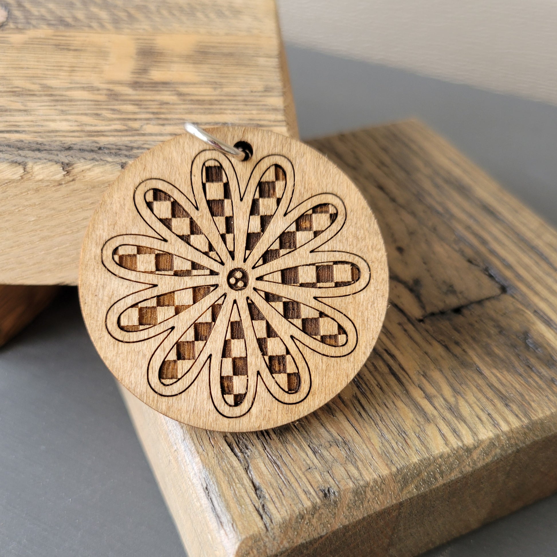 Charms are made of stained wood. Round ones measure about two inches across, flag is about on and one-eighth inch across. Each comes with a split ring for adding to your wristlet or lanyard.