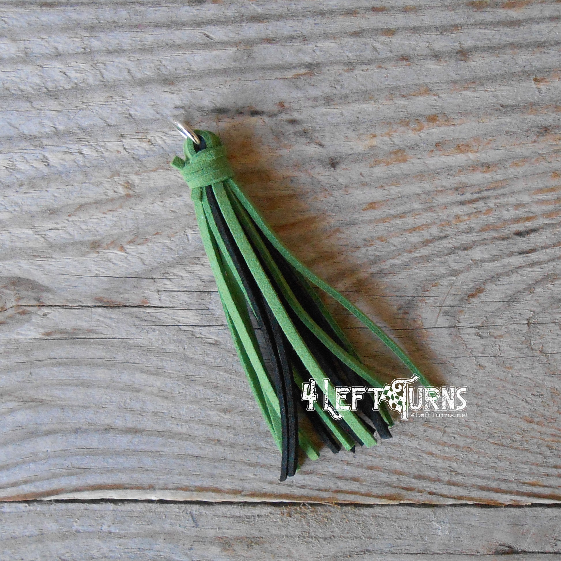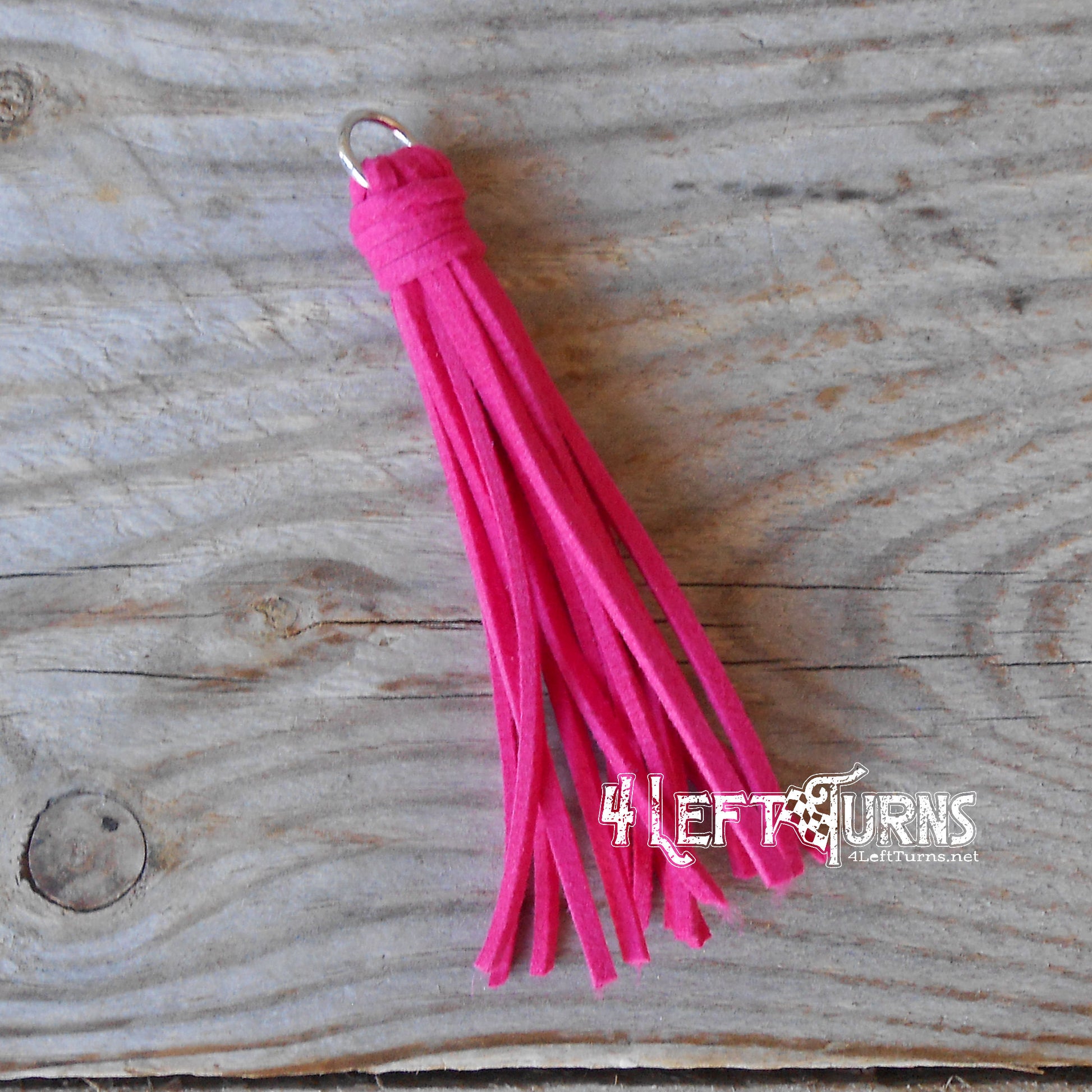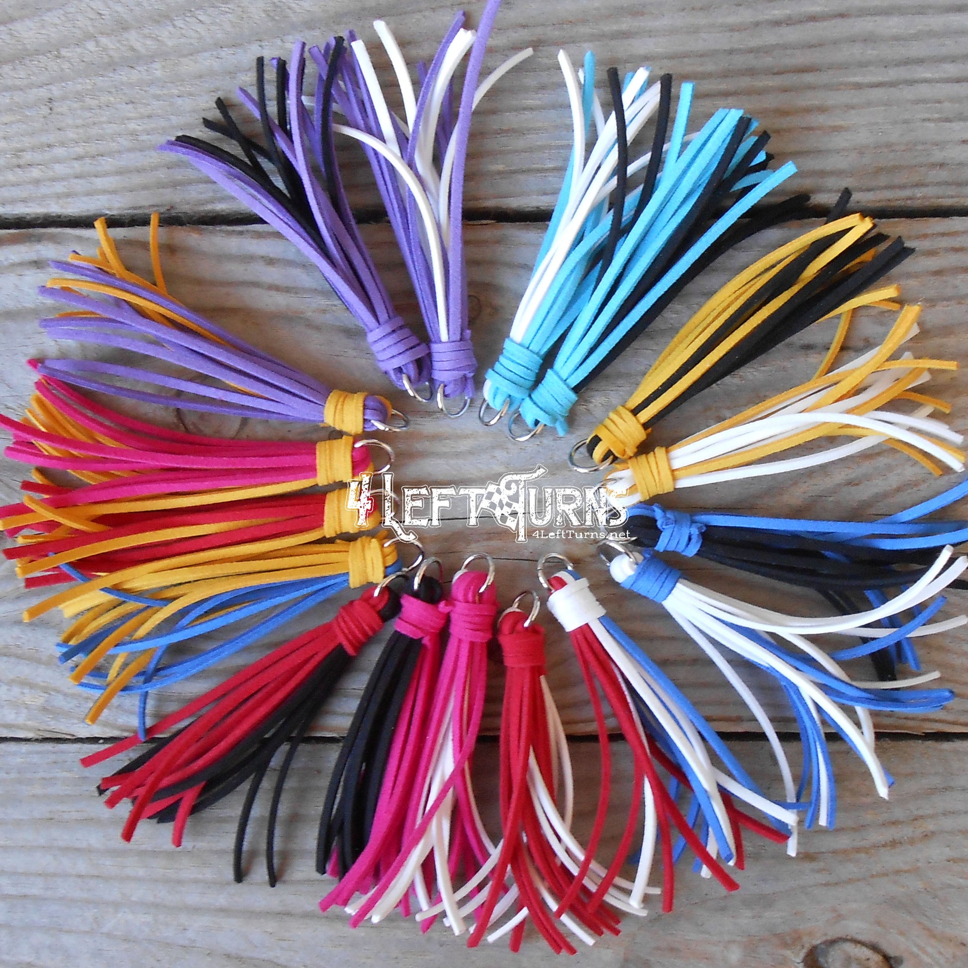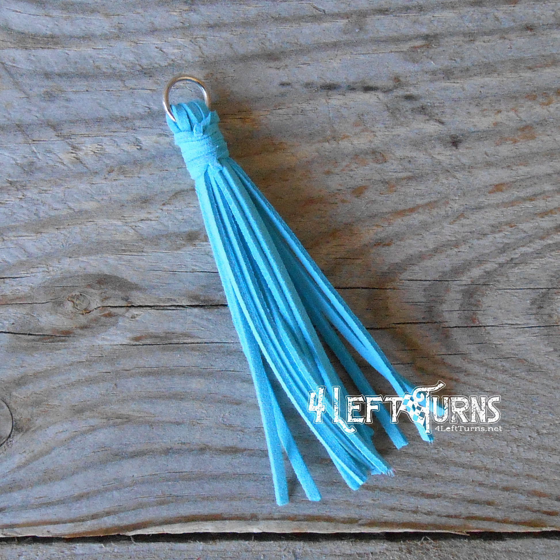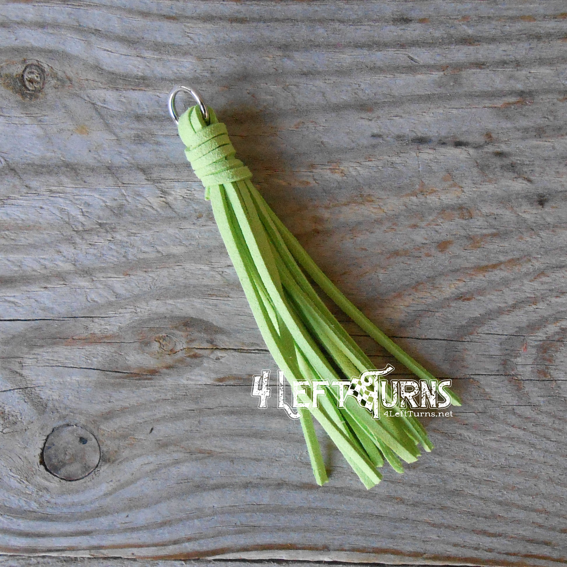 Tassles measure approximately four inches long and are made of vegan leather. Each comes with a ring for adding to your wristlet, key fob or lanyard.