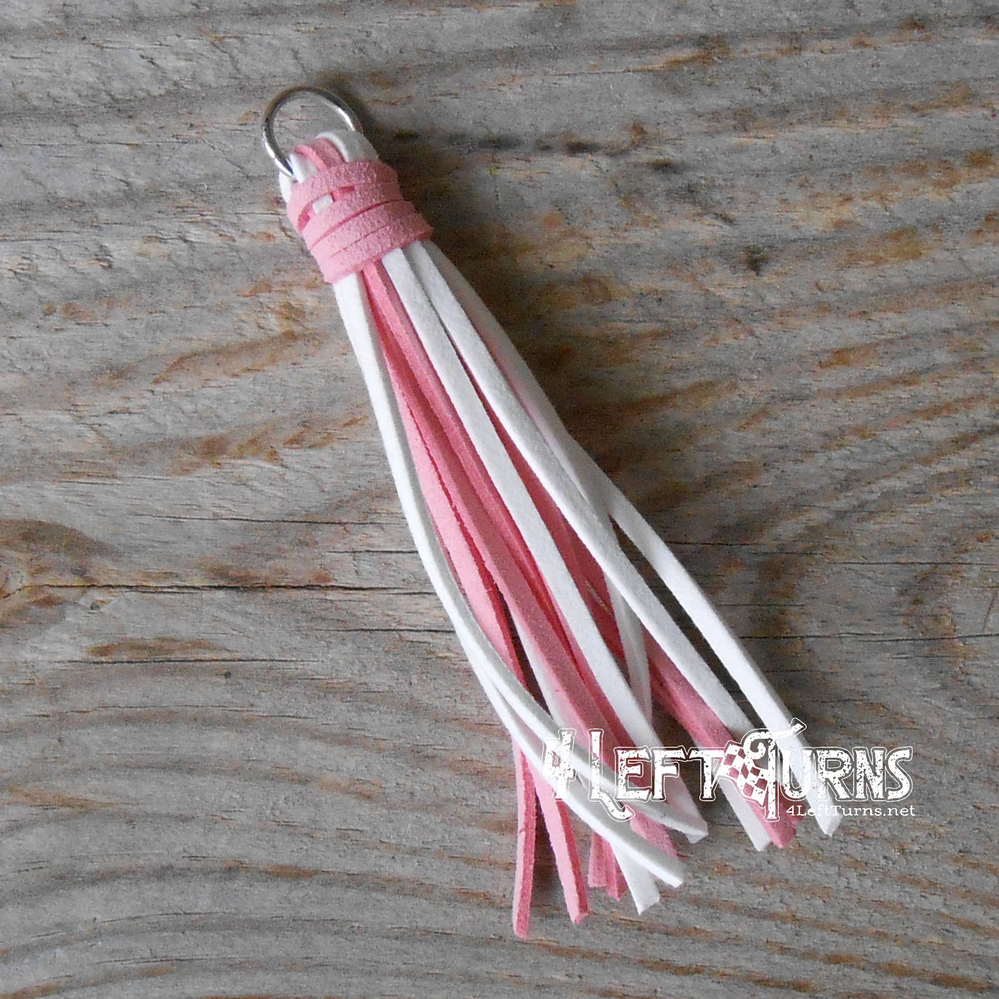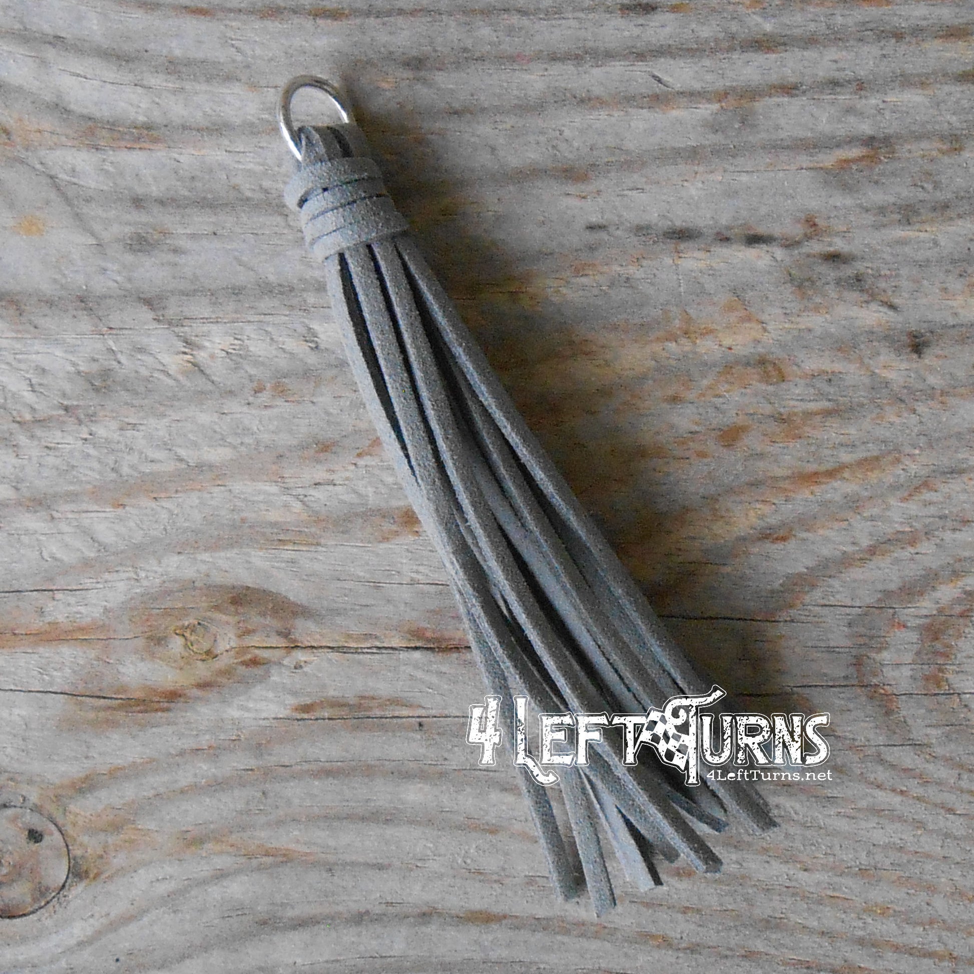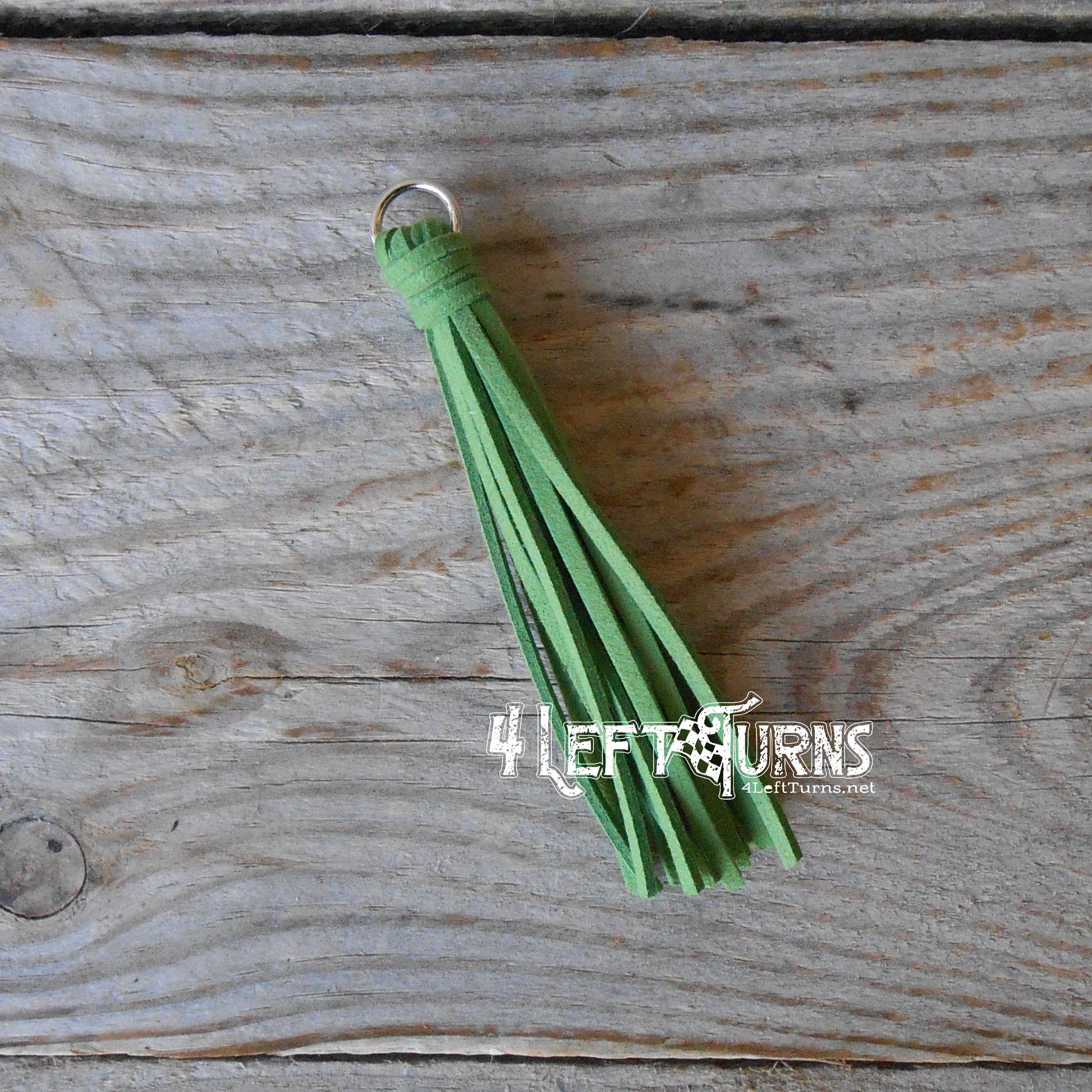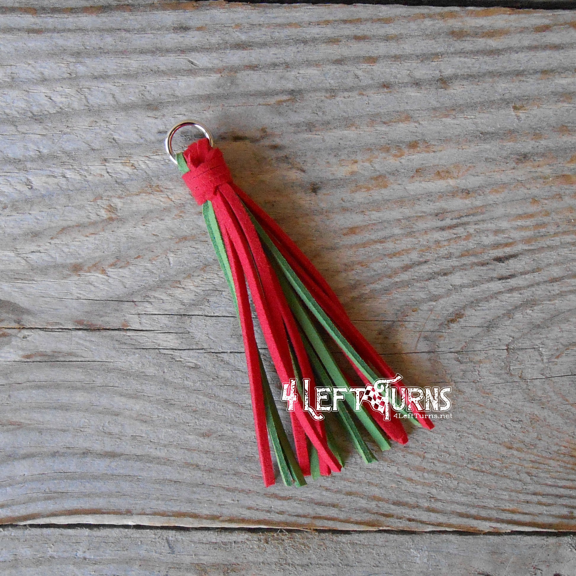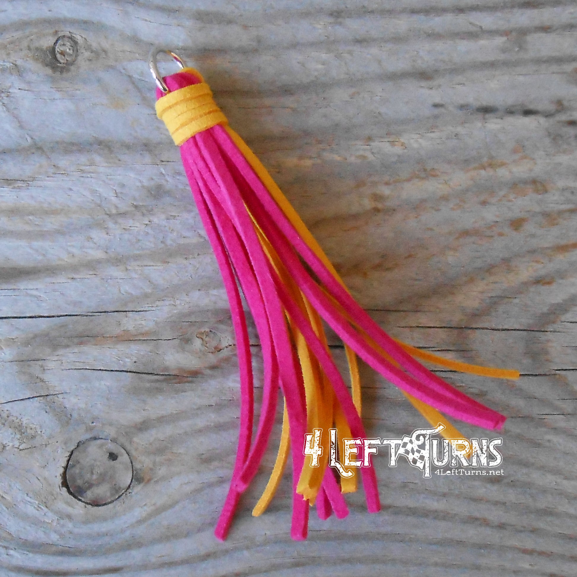 Tassles measure approximately four inches long and are made of vegan leather. Each comes with a ring for adding to your wristlet, key fob or lanyard.