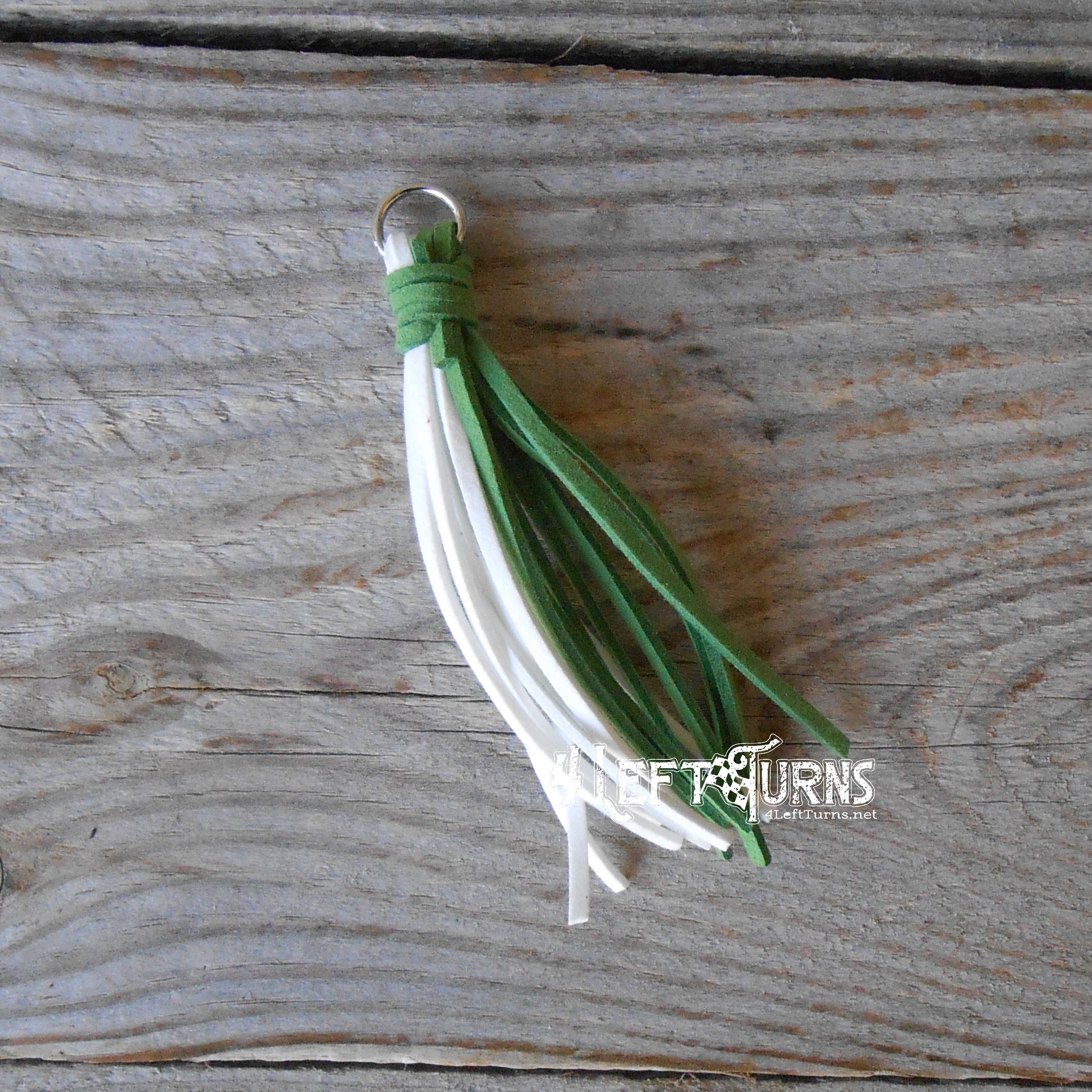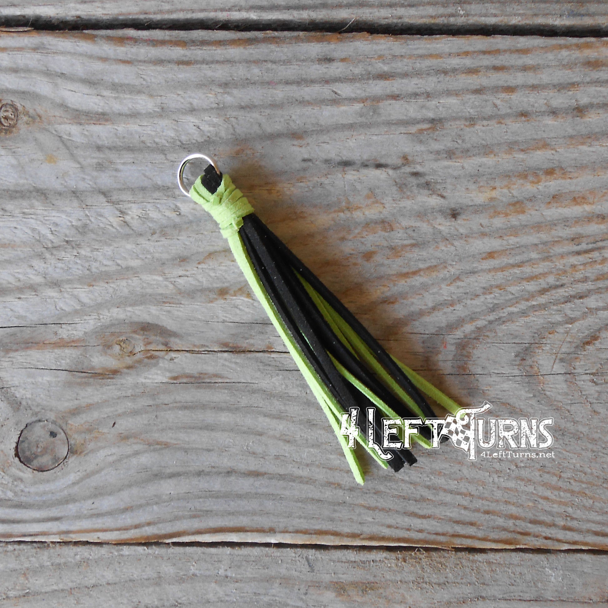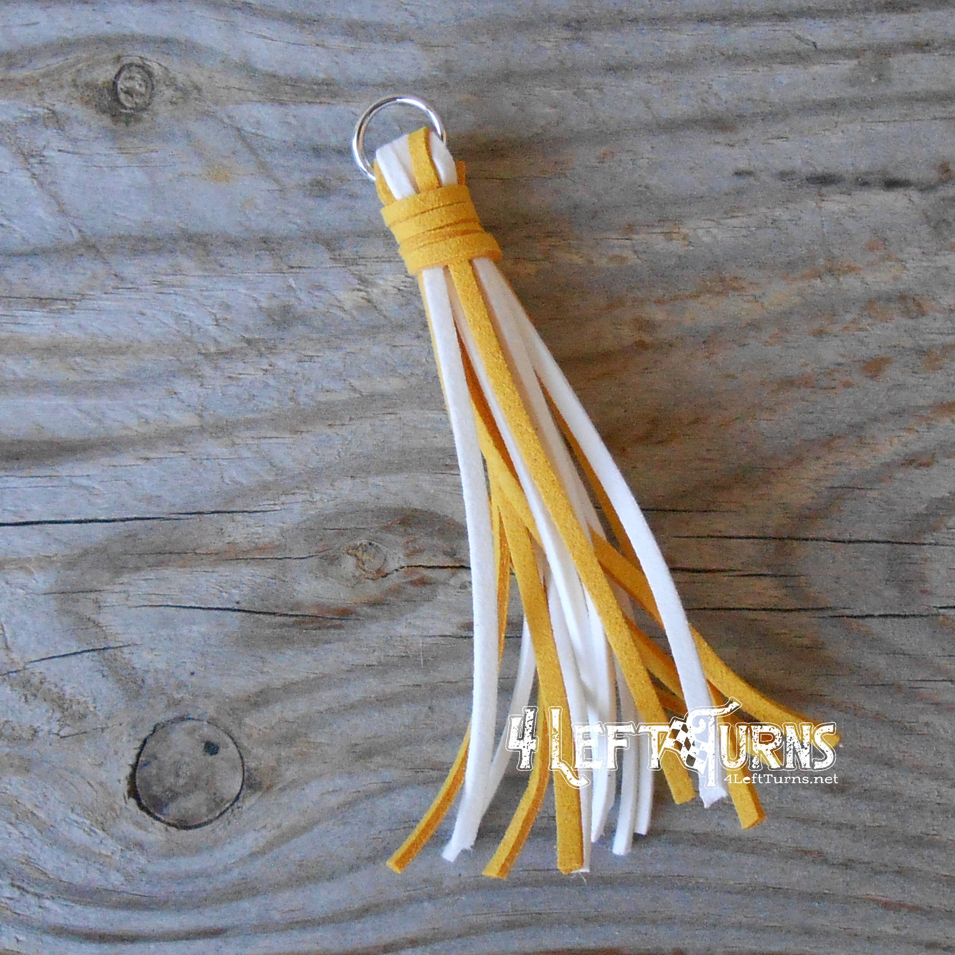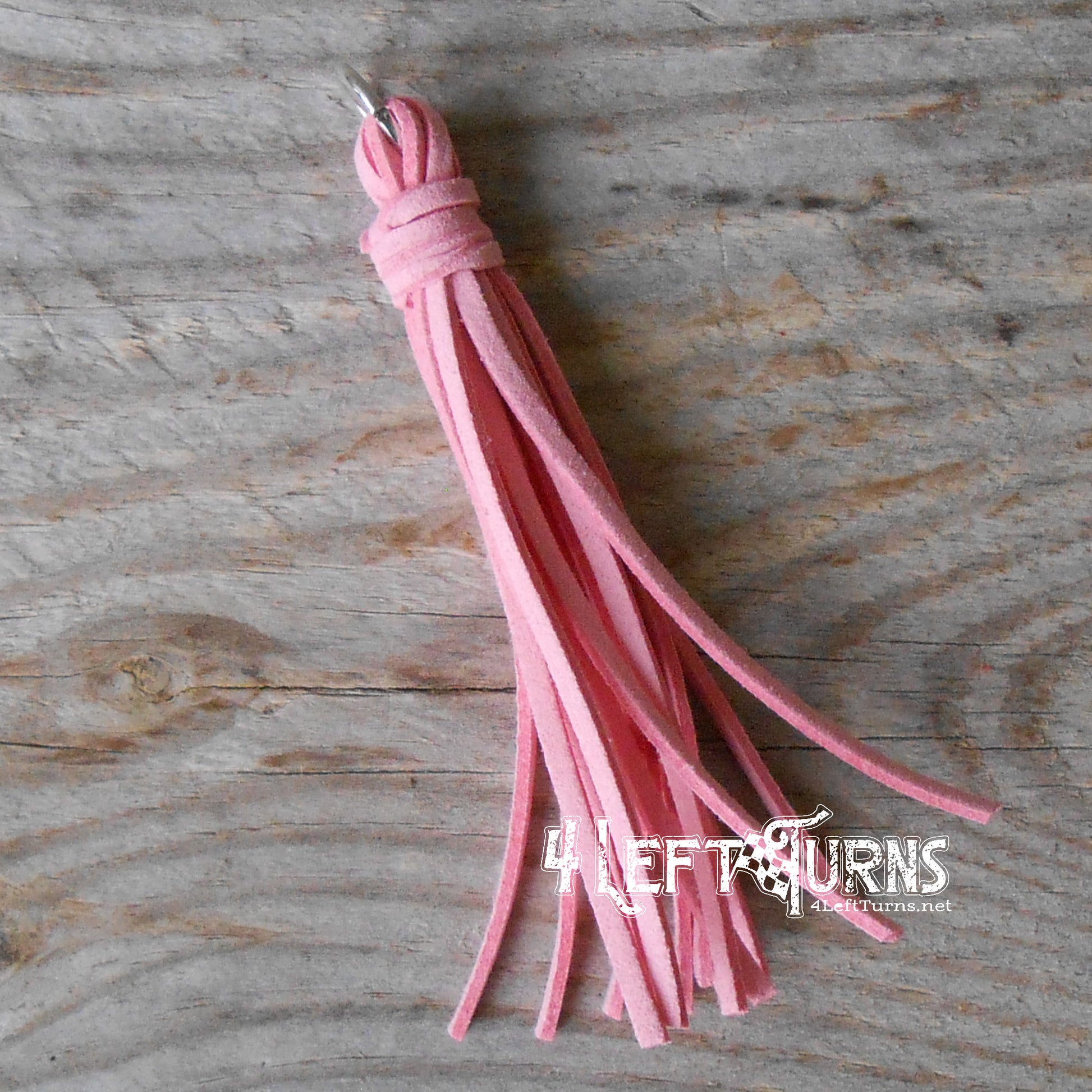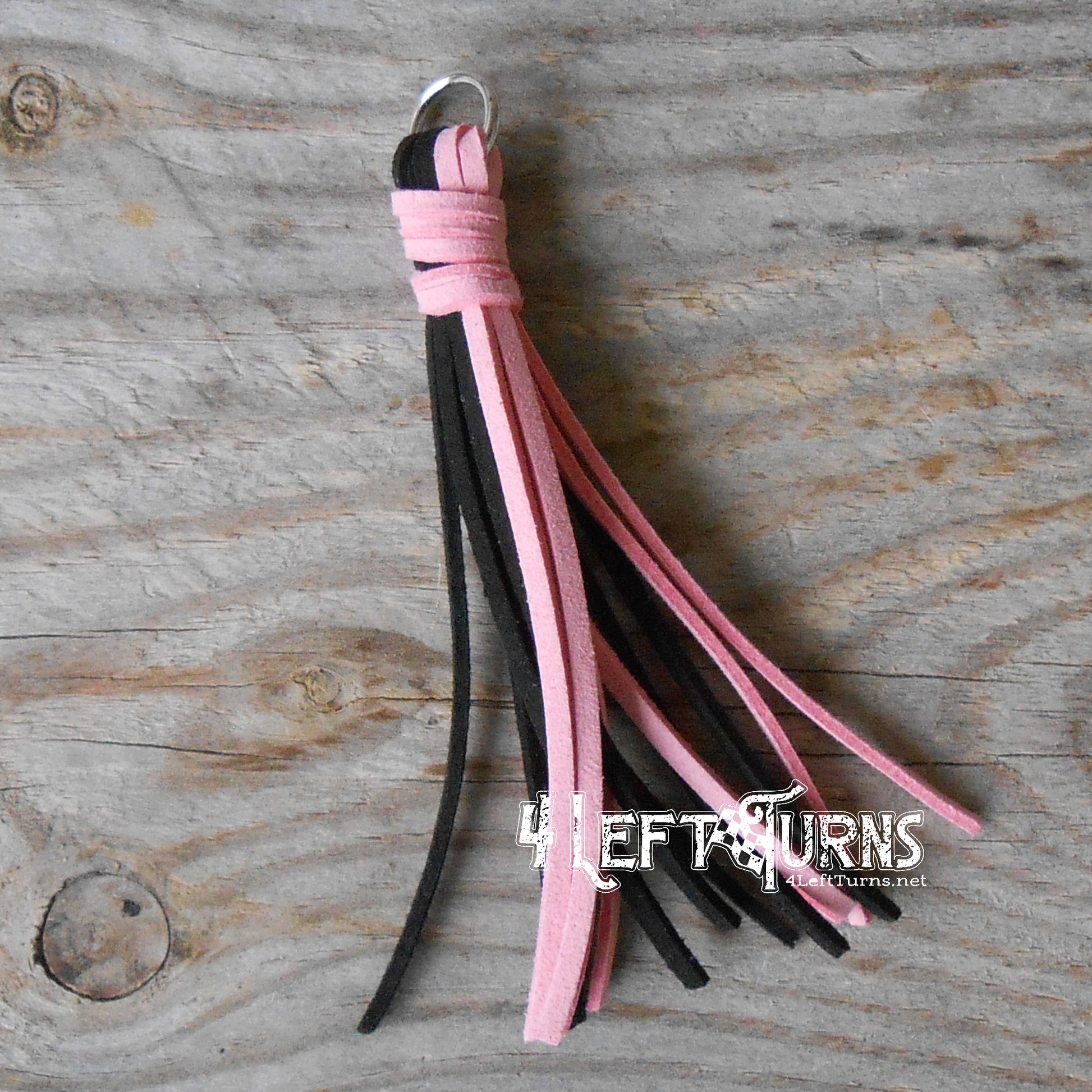 Tassles measure approximately four inches long and are made of vegan leather. Each comes with a ring for adding to your wristlet, key fob or lanyard.