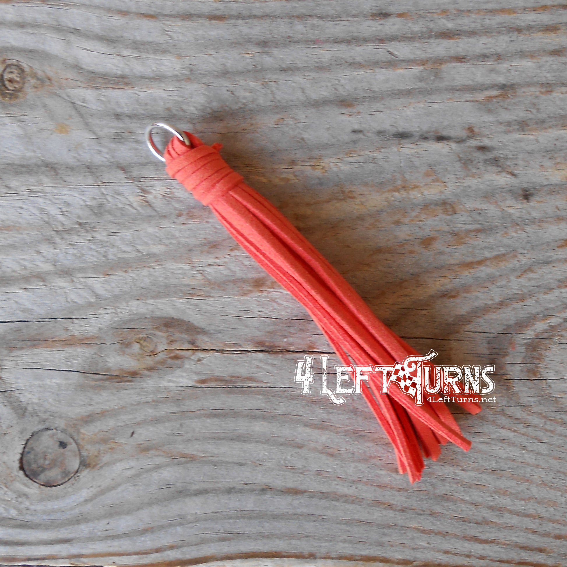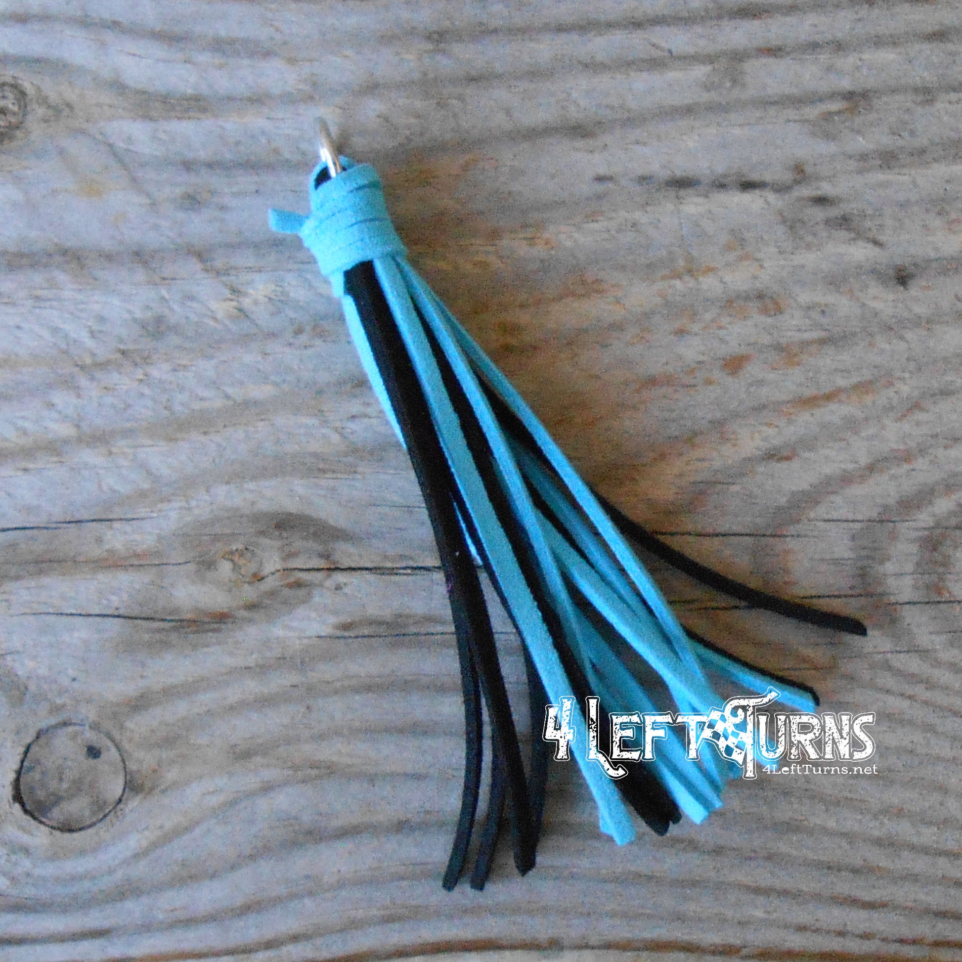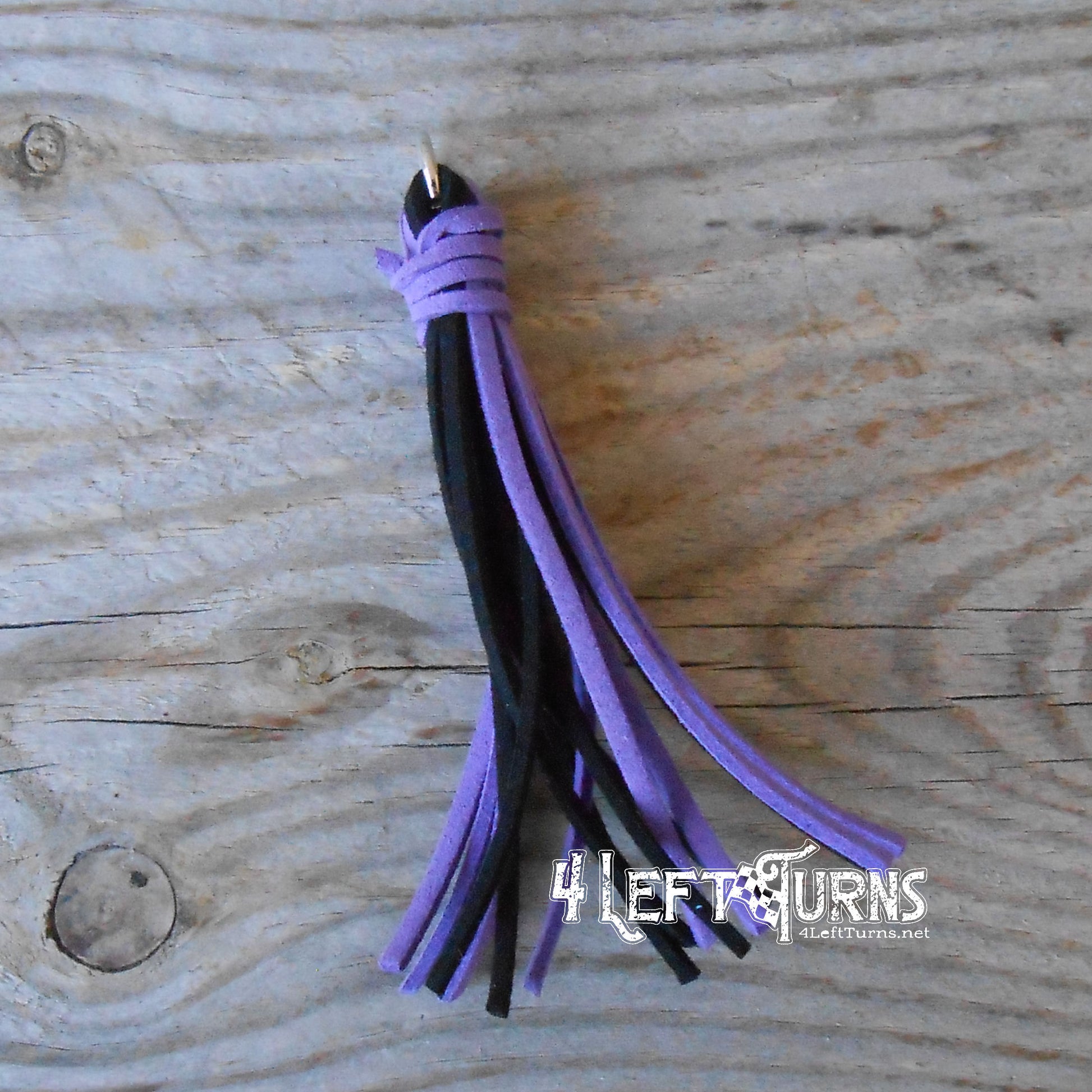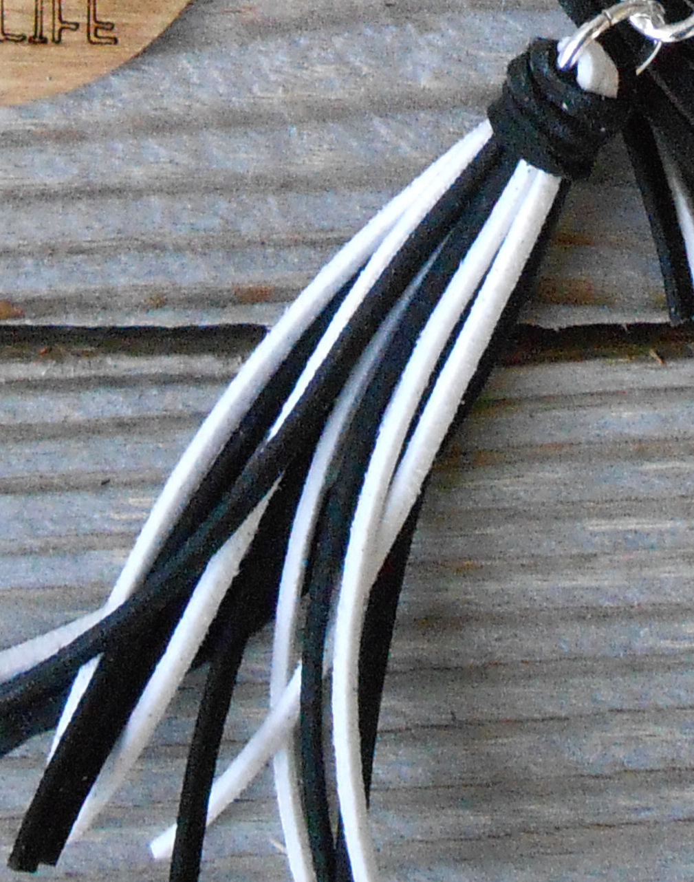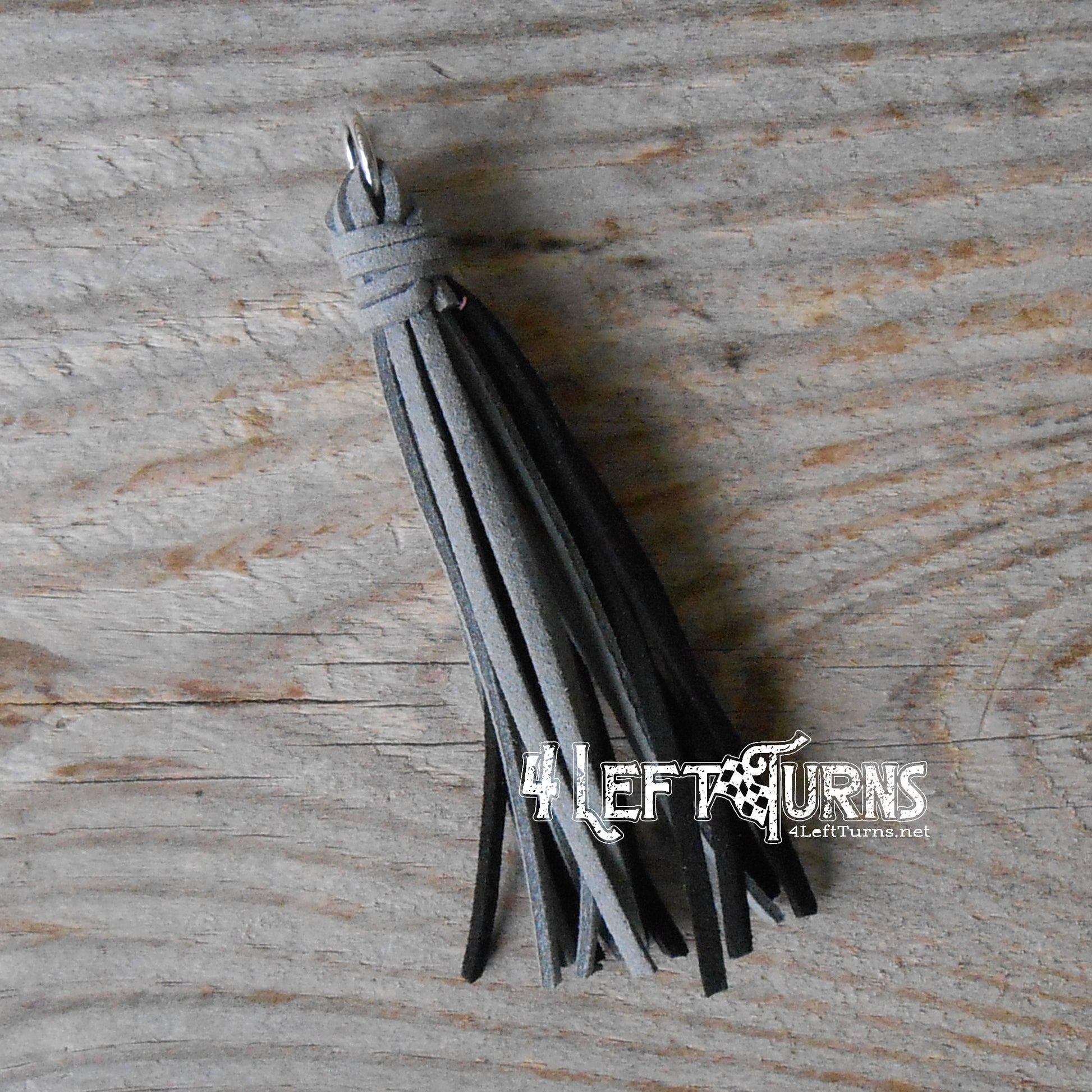 Tassles measure approximately four inches long and are made of vegan leather. Each comes with a ring for adding to your wristlet, key fob or lanyard.