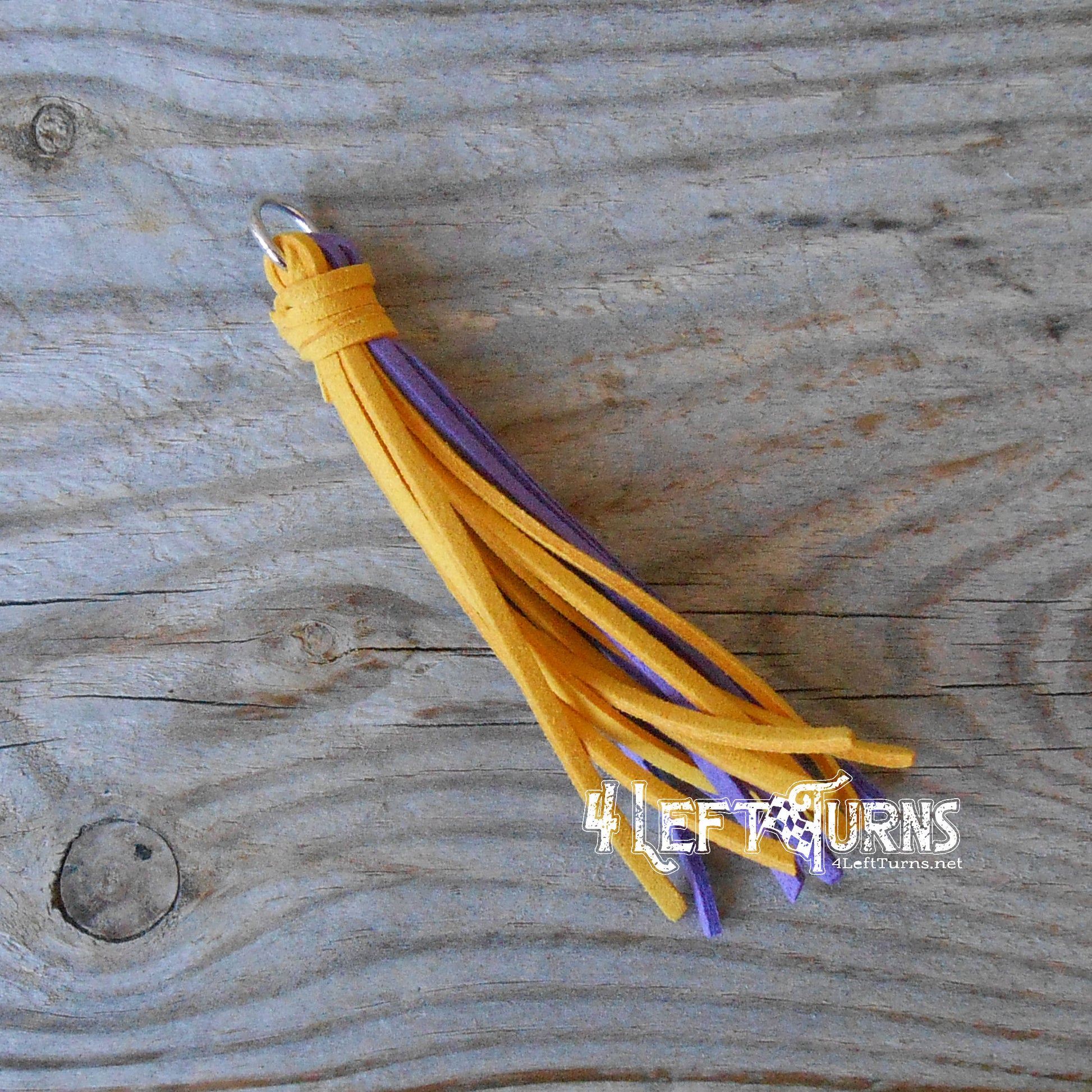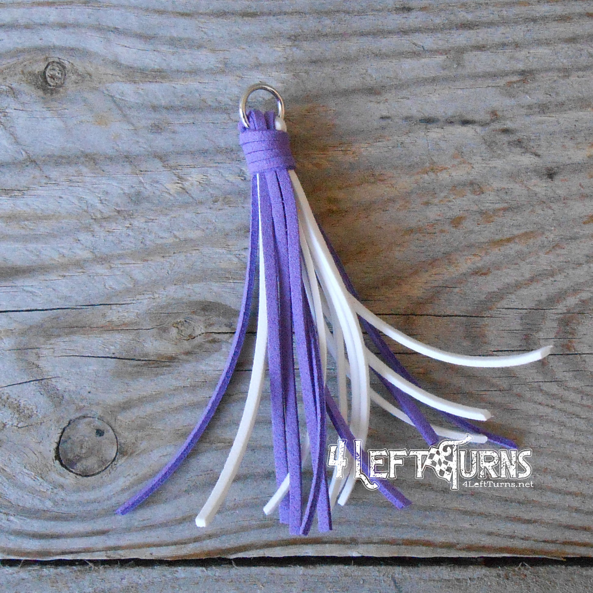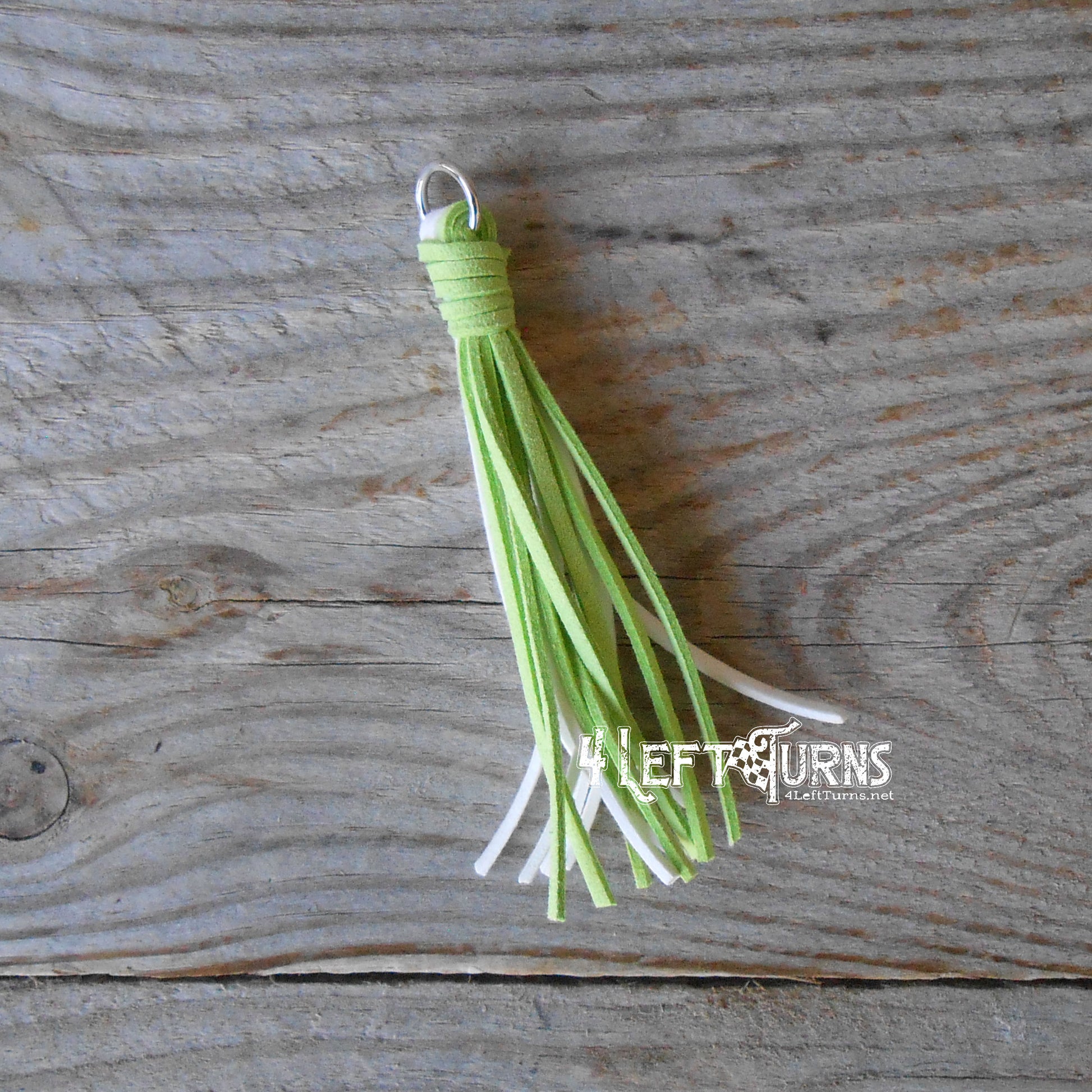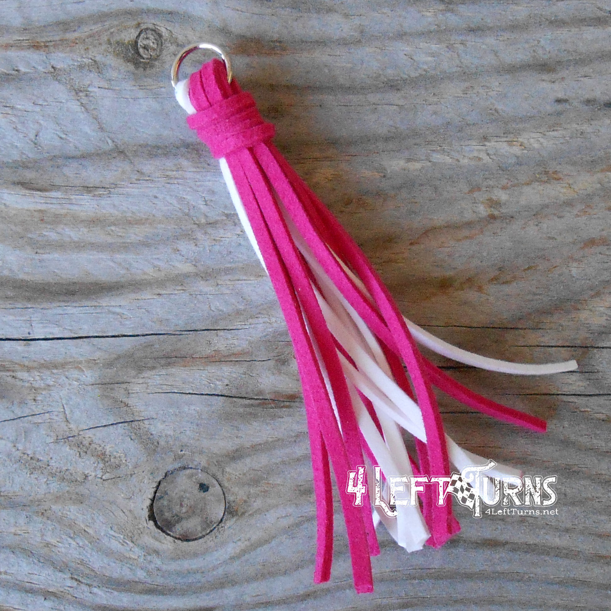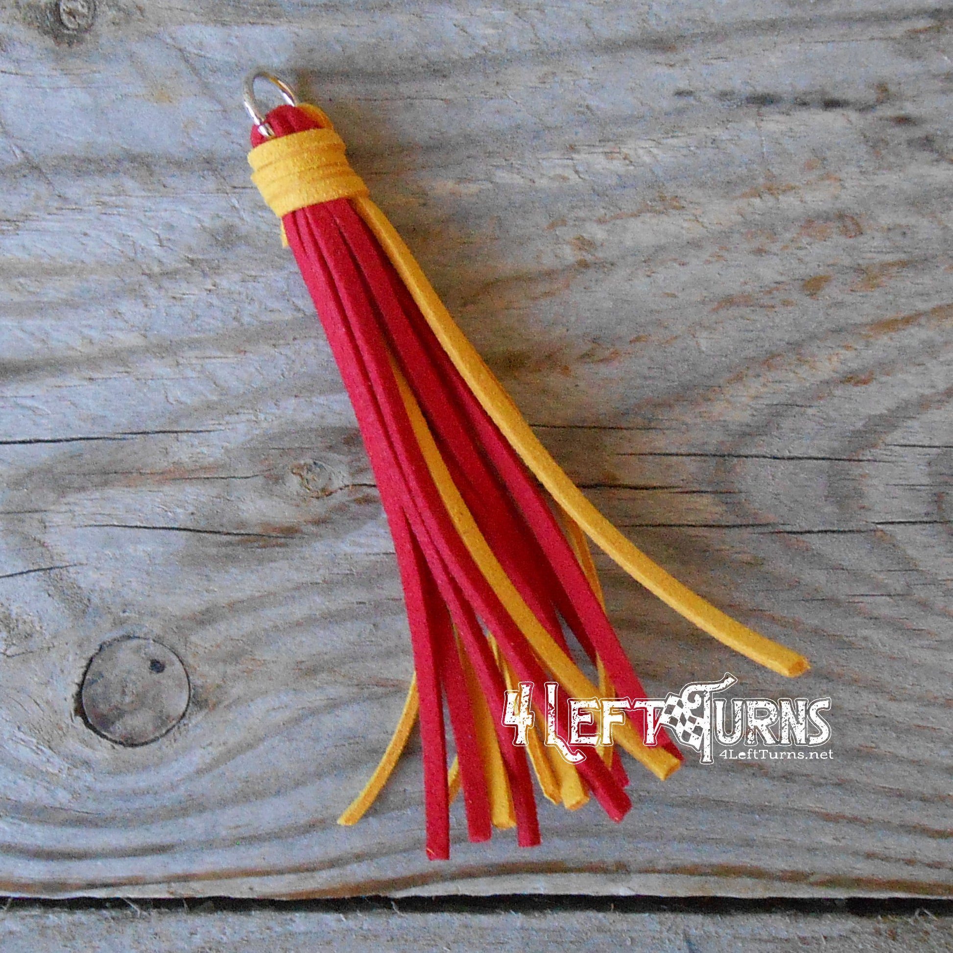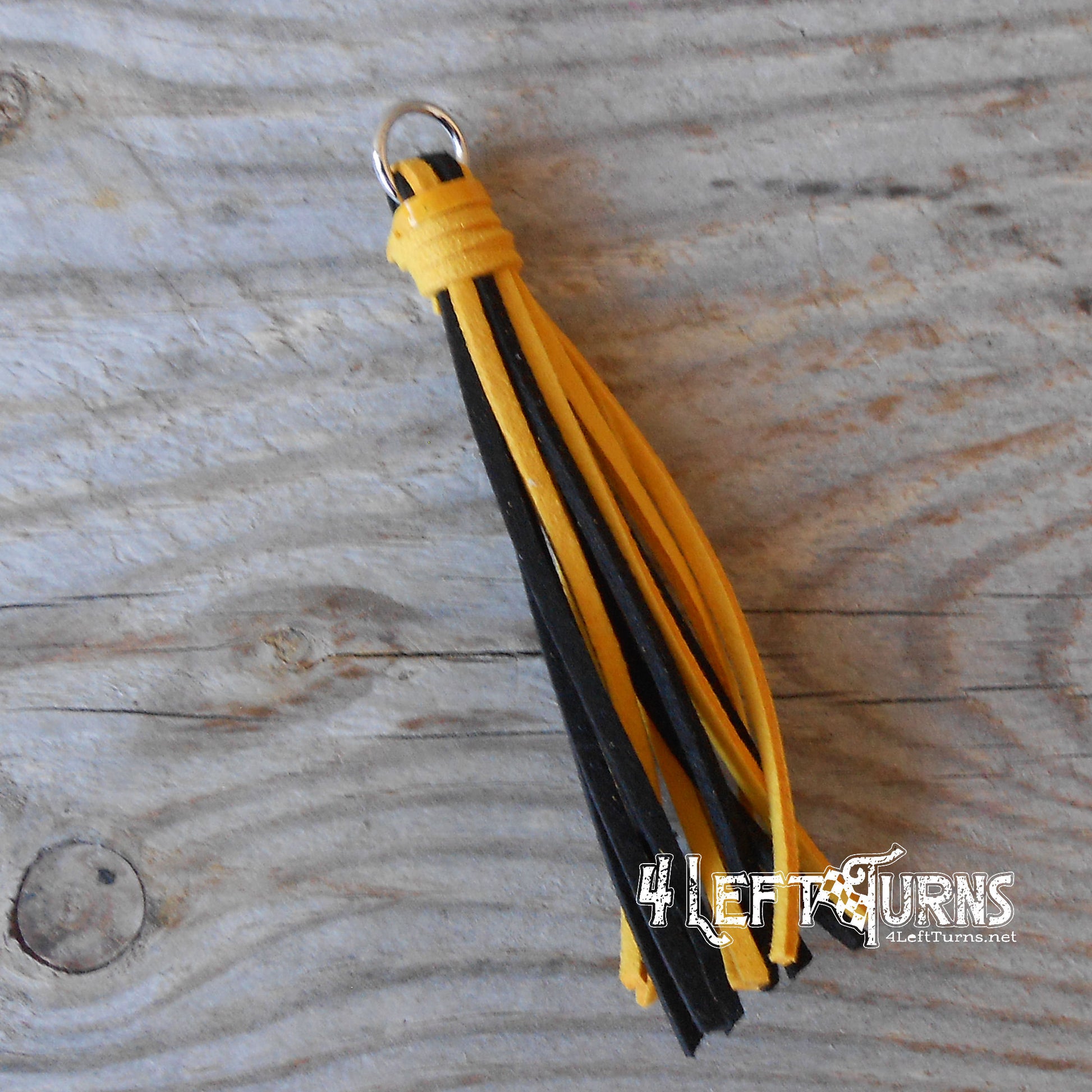 Tassles measure approximately four inches long and are made of vegan leather. Each comes with a ring for adding to your wristlet, key fob or lanyard.