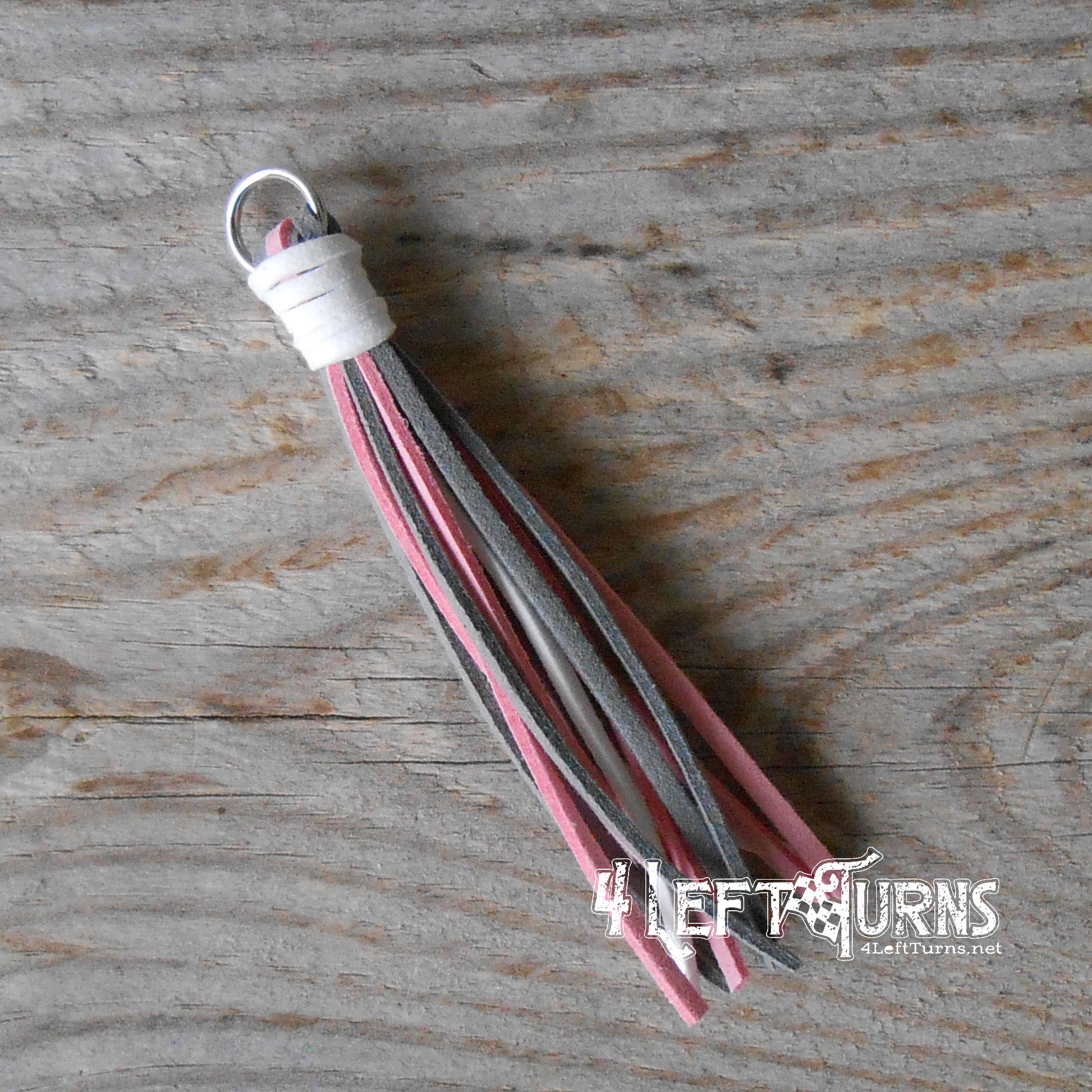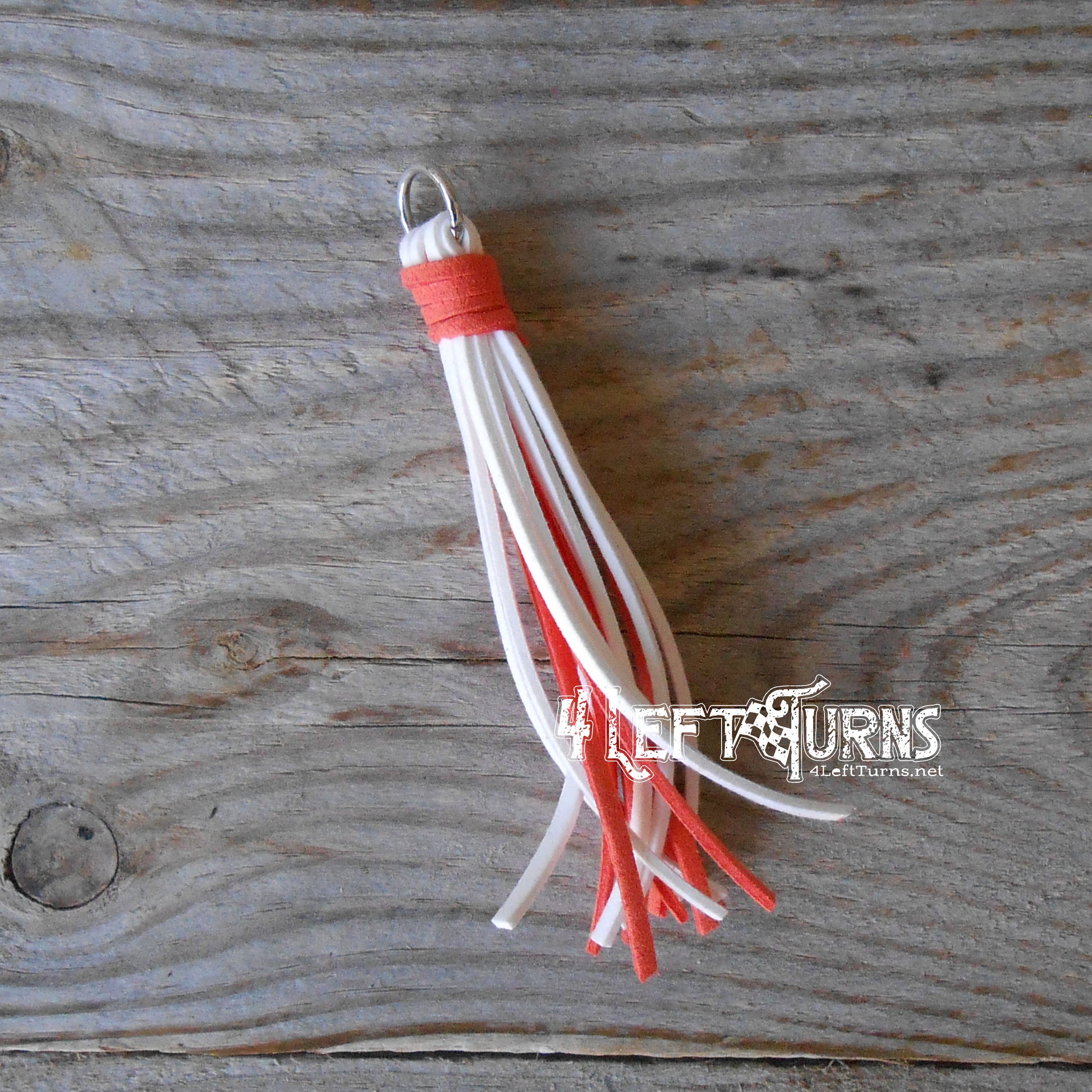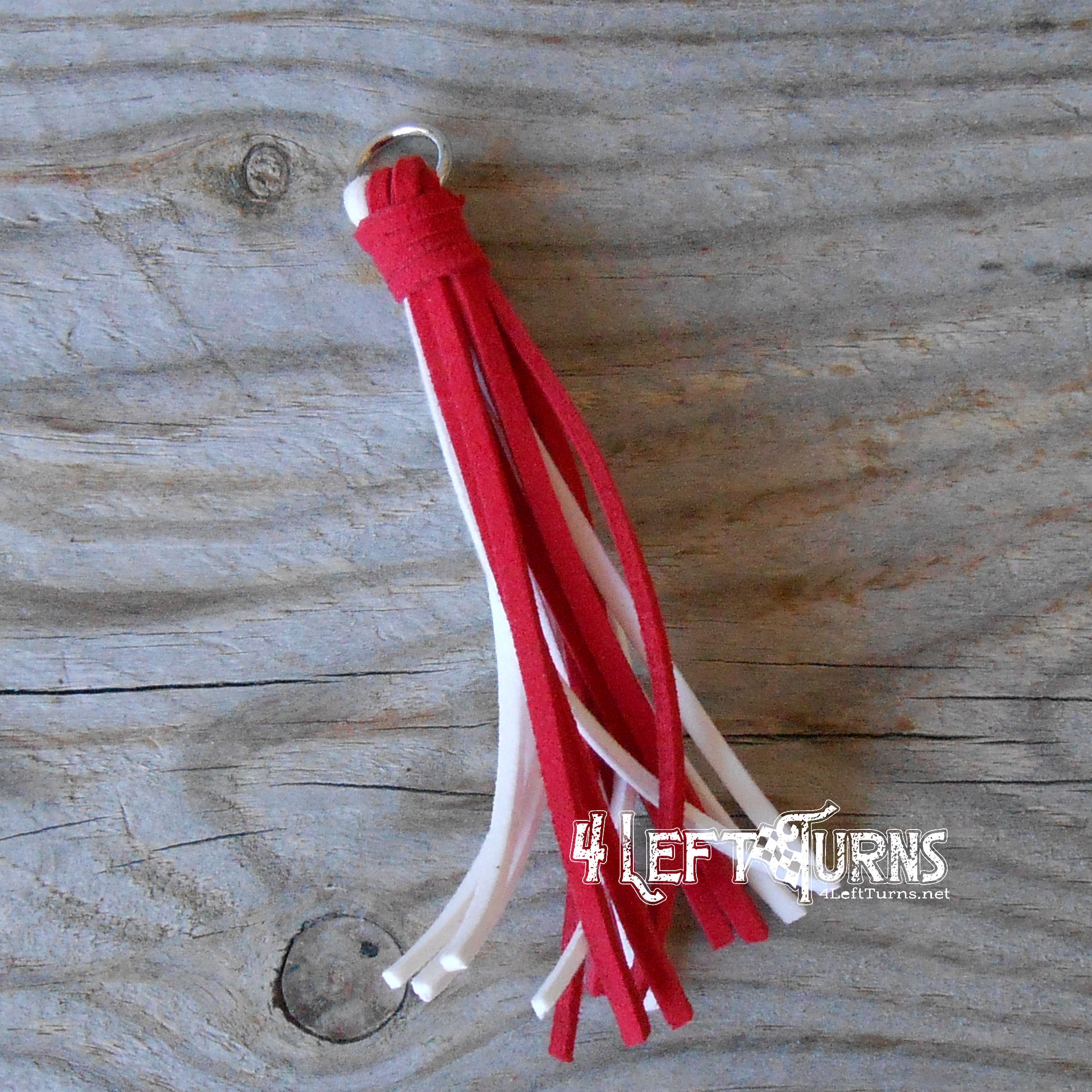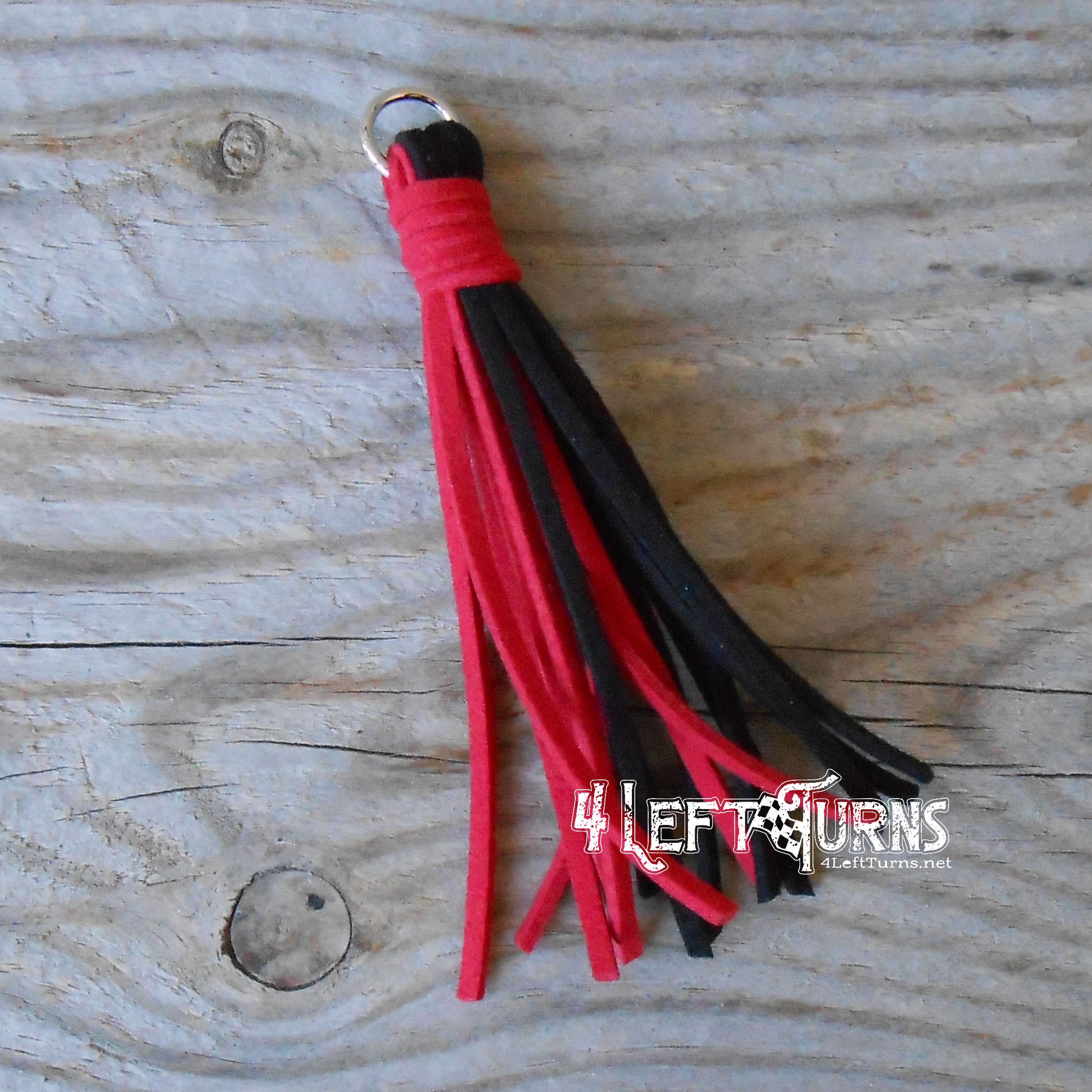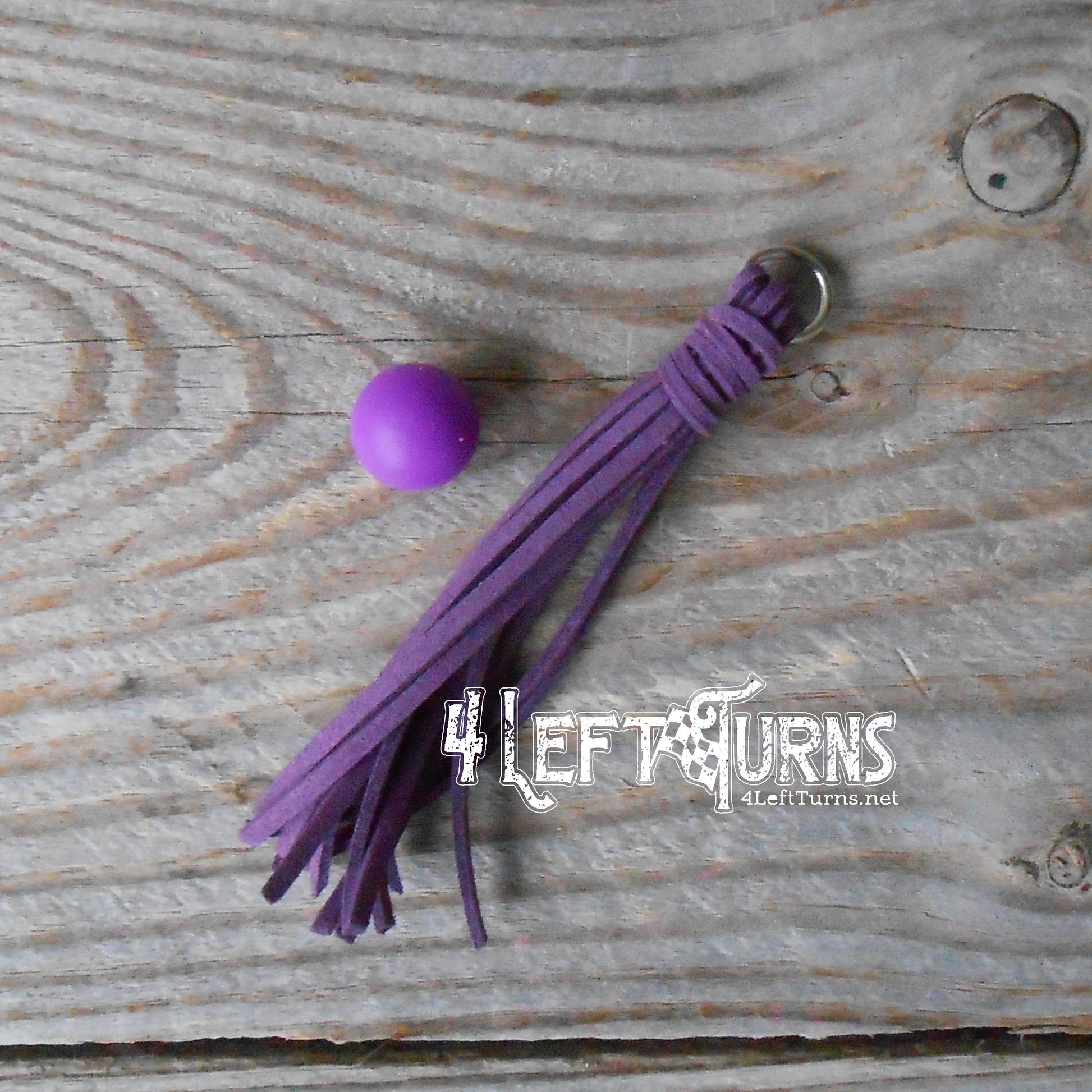 Tassles measure approximately four inches long and are made of vegan leather. Each comes with a ring for adding to your wristlet, key fob or lanyard.
