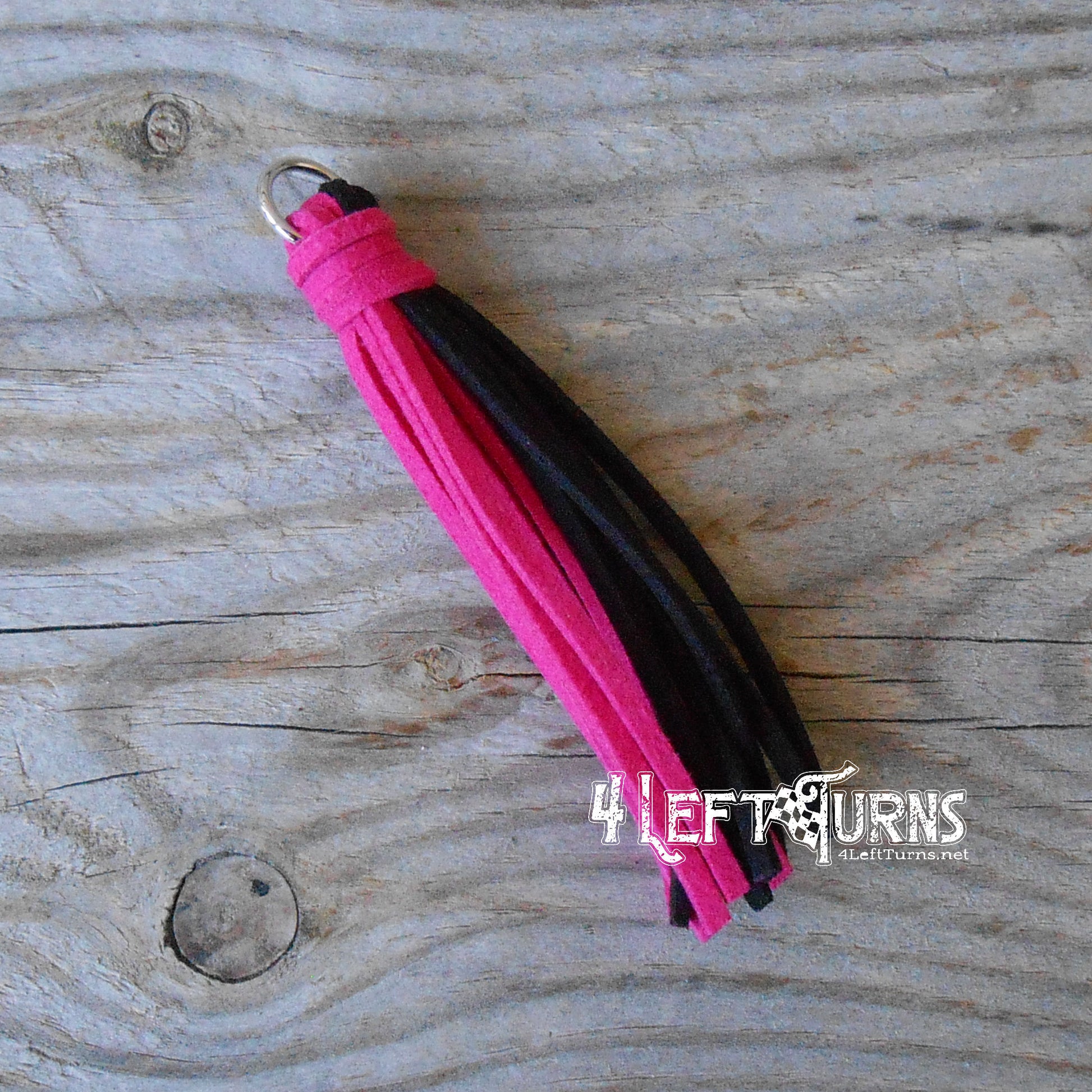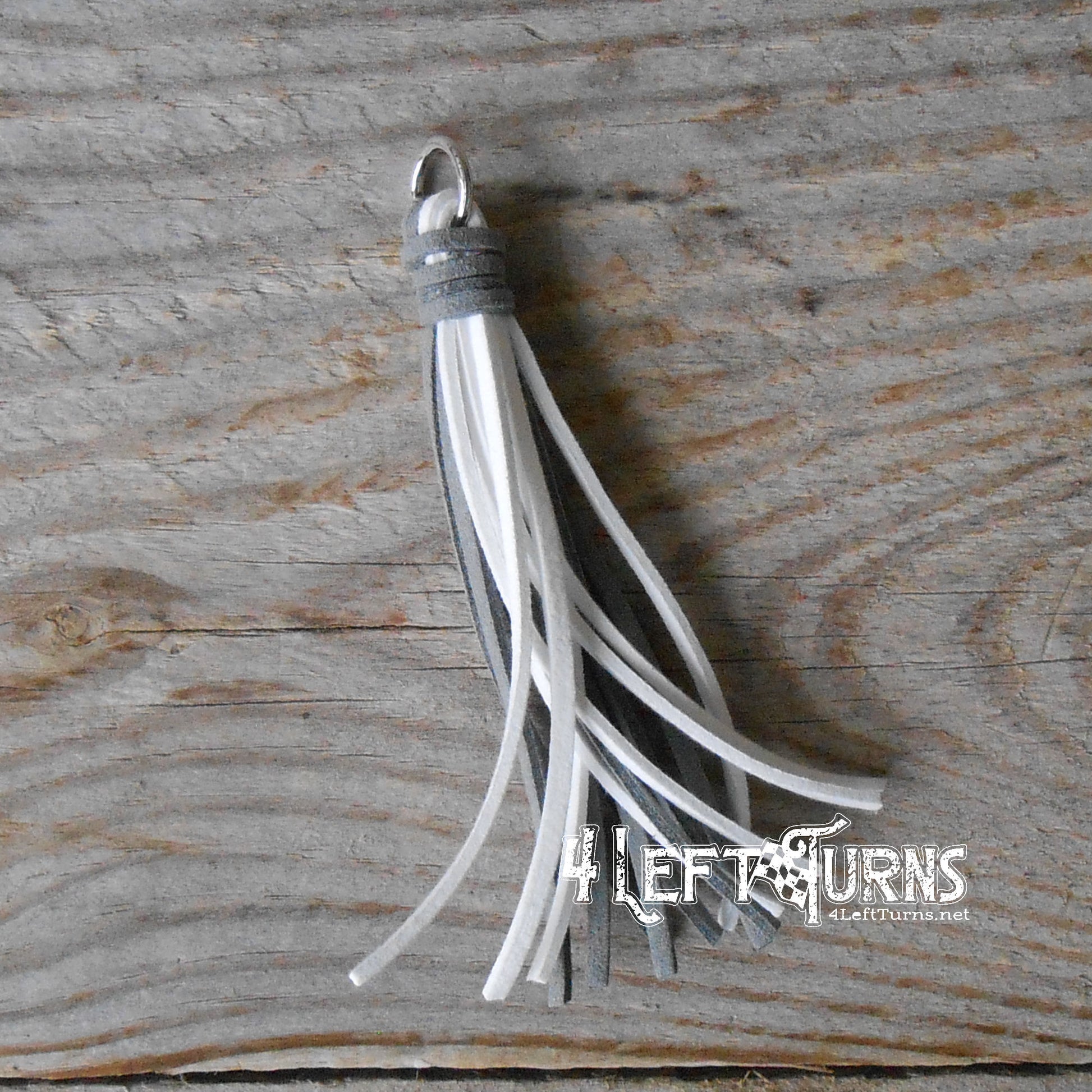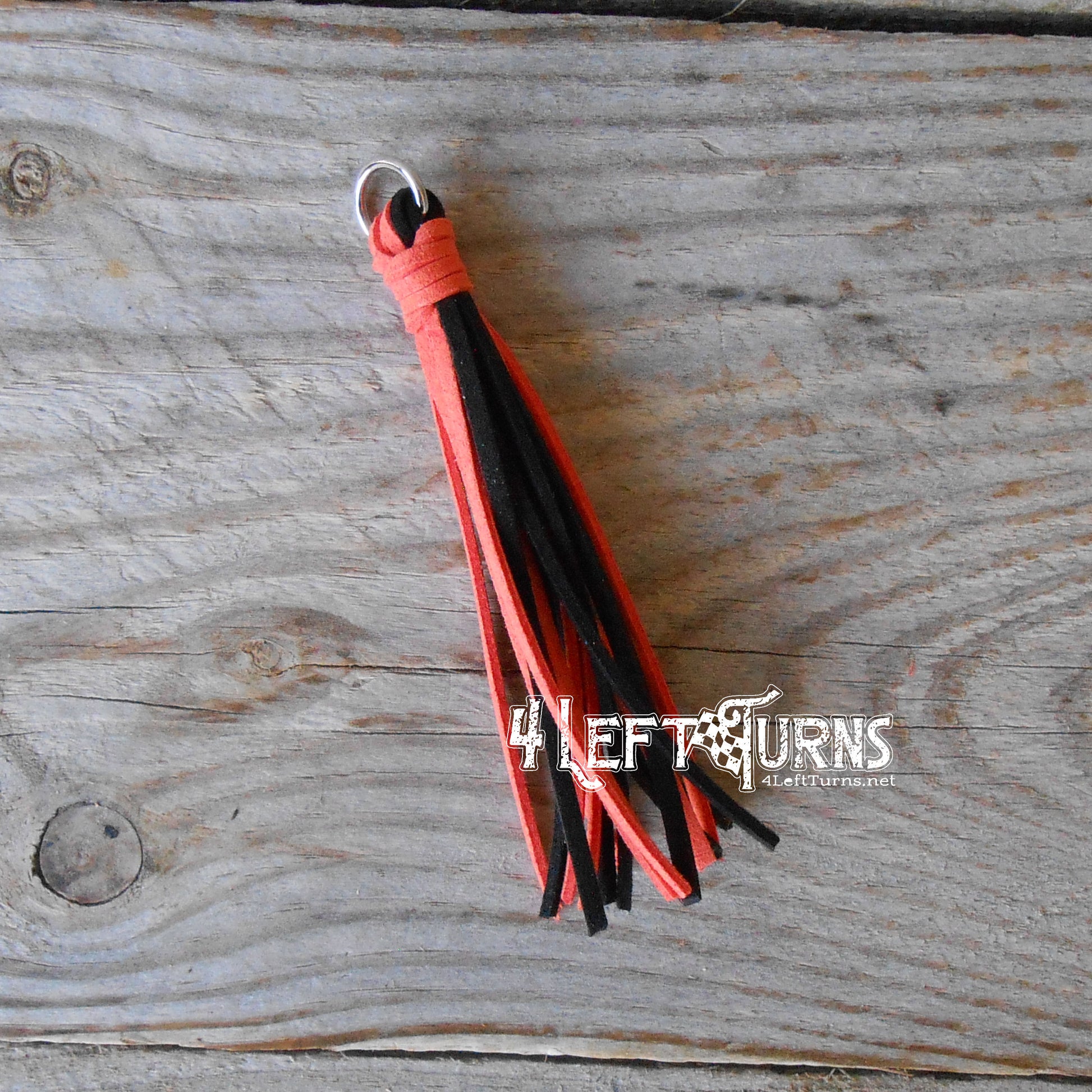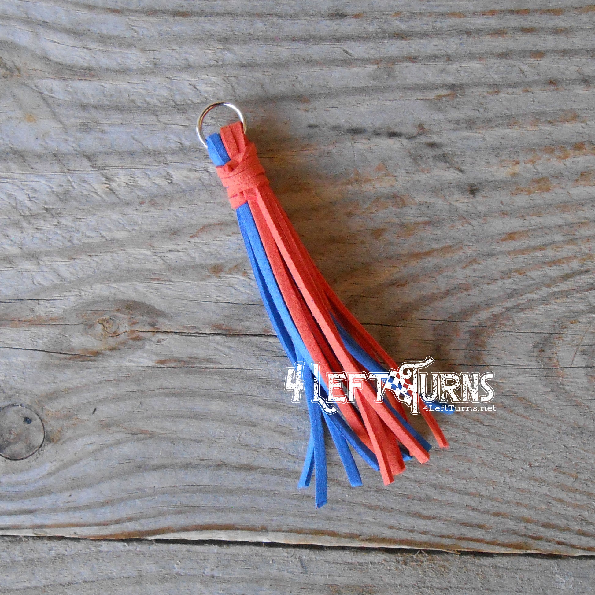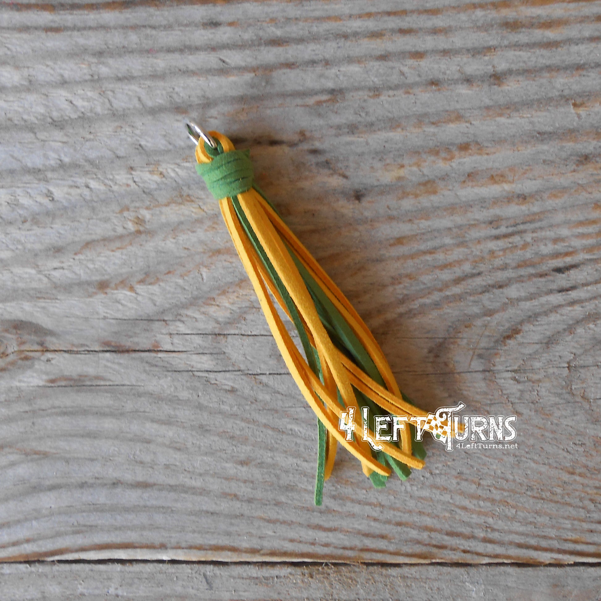 Tassles measure approximately four inches long and are made of vegan leather. Each comes with a ring for adding to your wristlet, key fob or lanyard.