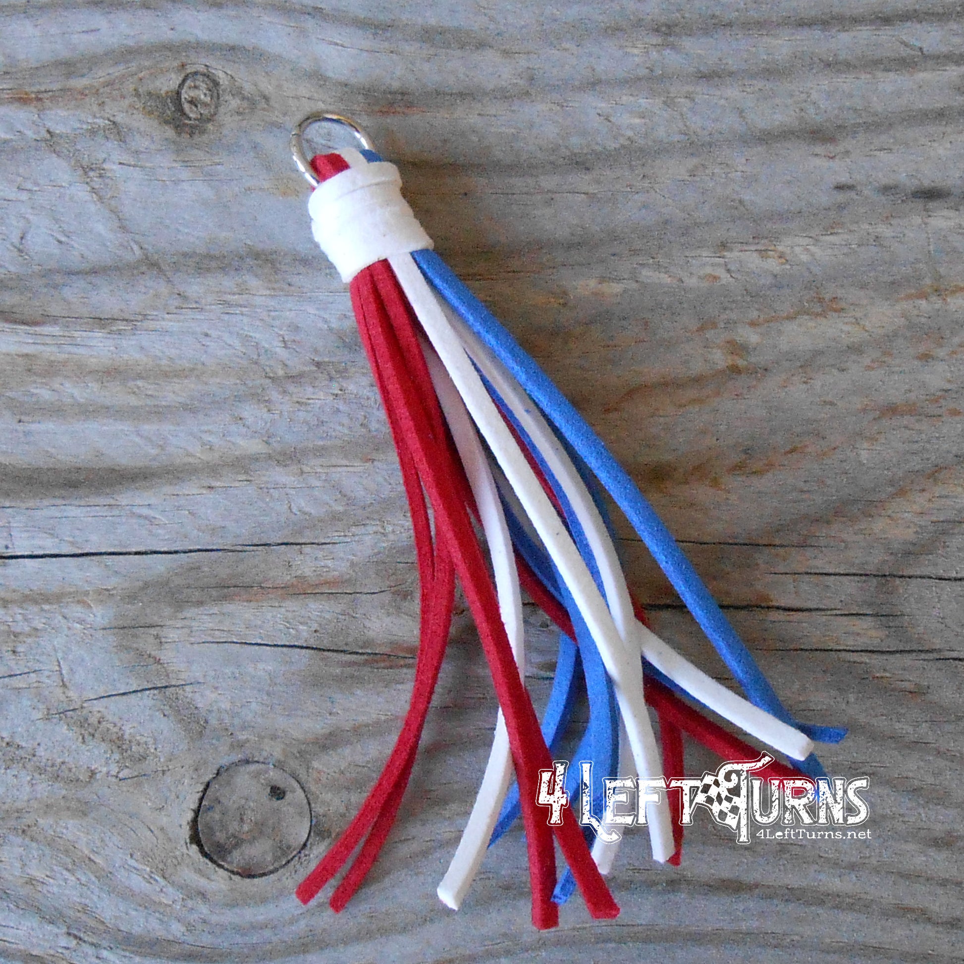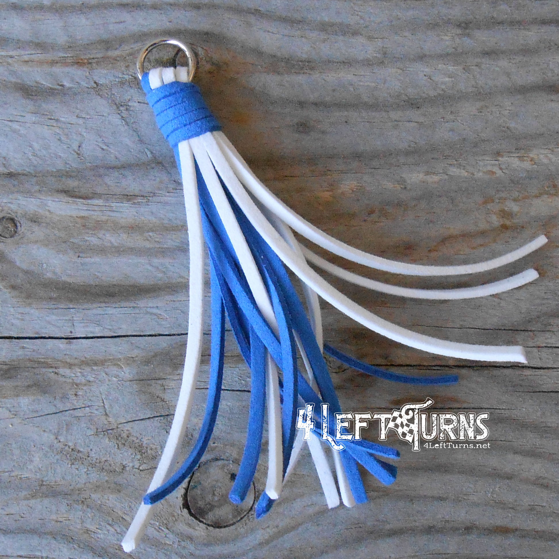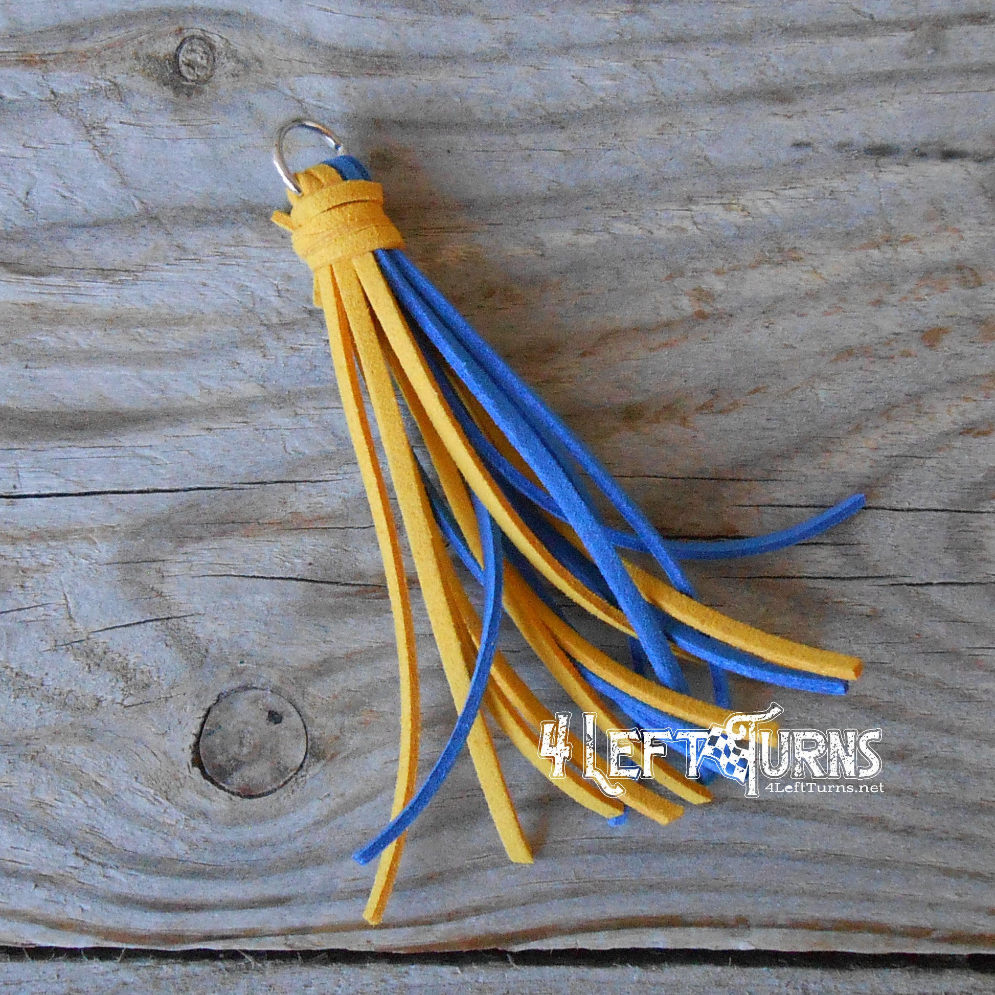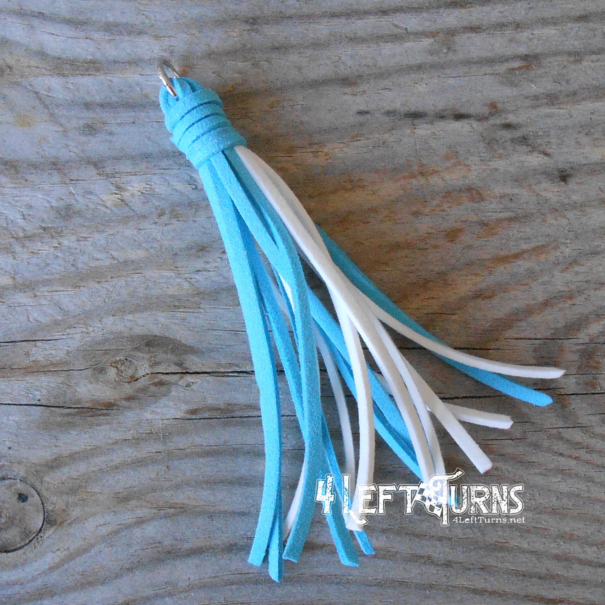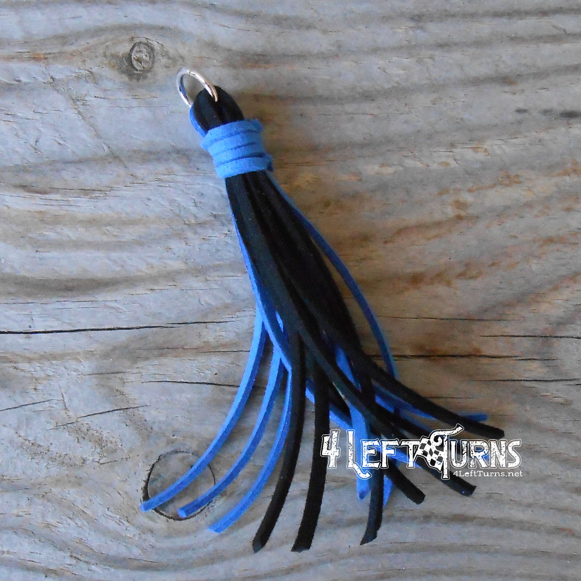 Tassles measure approximately four inches long and are made of vegan leather. Each comes with a ring for adding to your wristlet, key fob or lanyard.