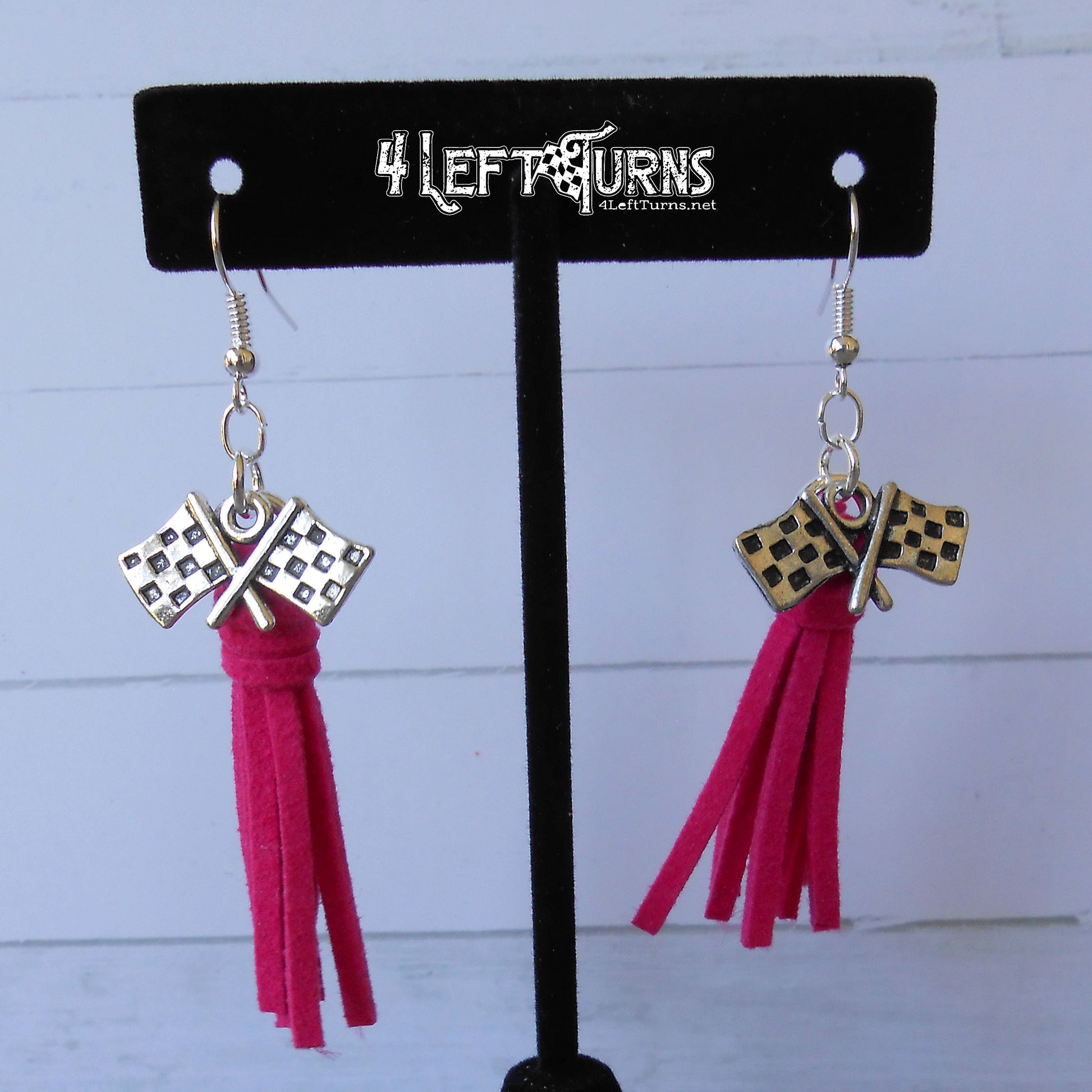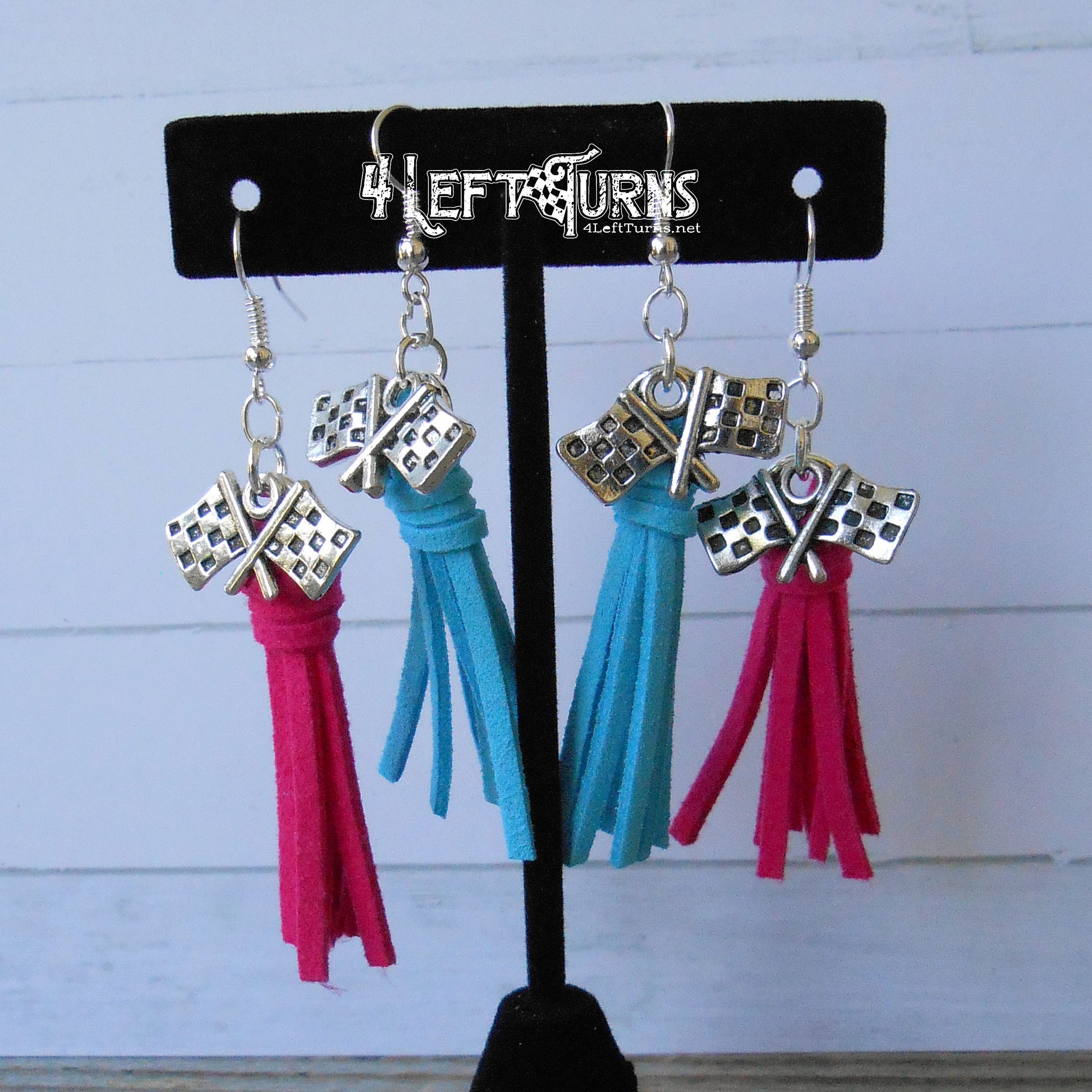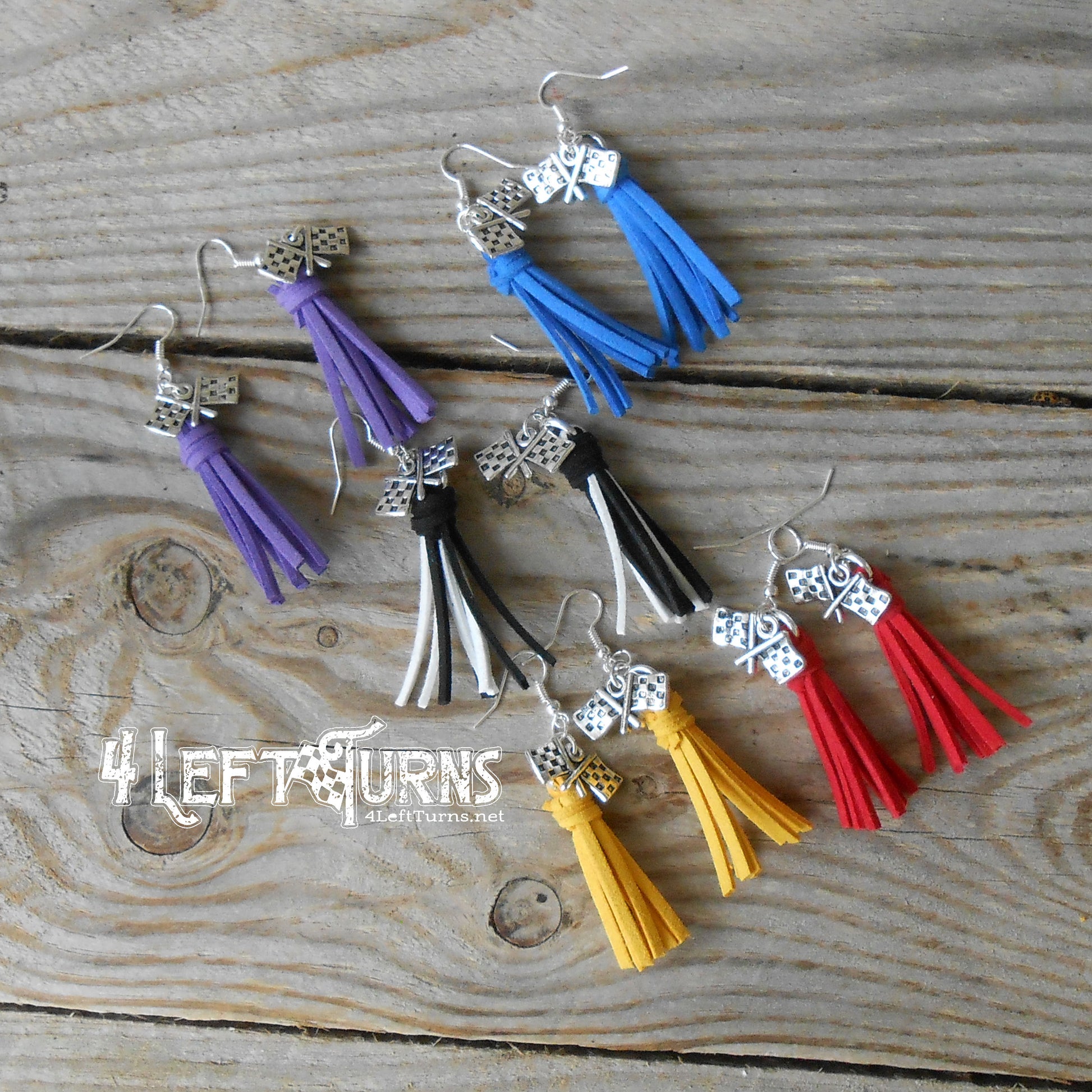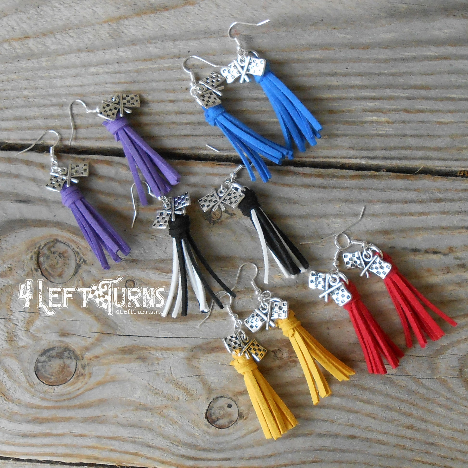 Our colorful tassel earrings with their silver tone checkered flag charms are the ultimate accessory for race night or any occasion. Tassels measure about 1.5 inches in length and are made by hand. Stainless steel earring wires.