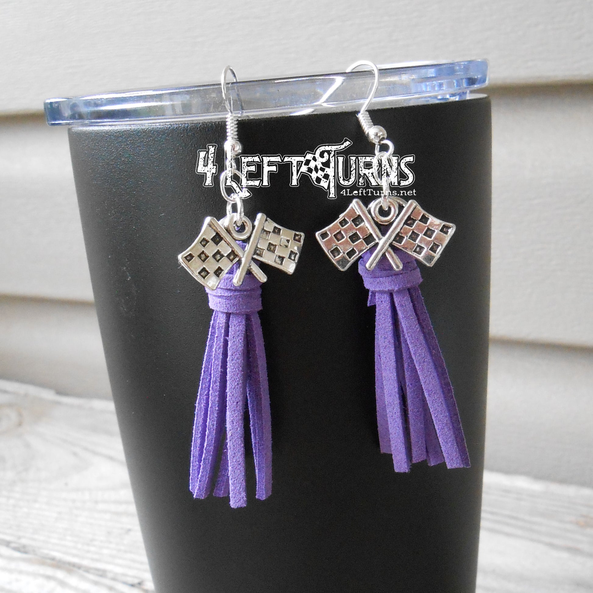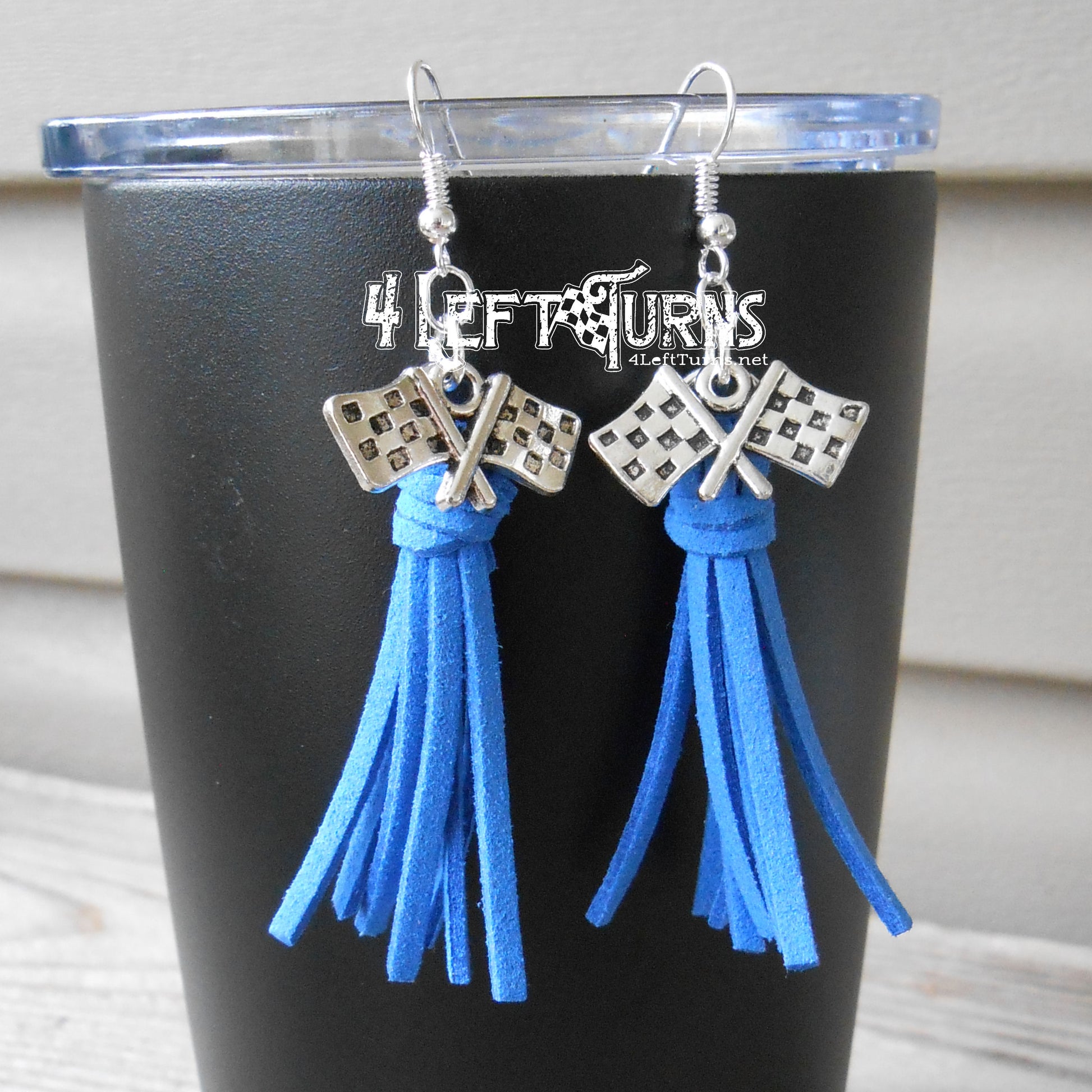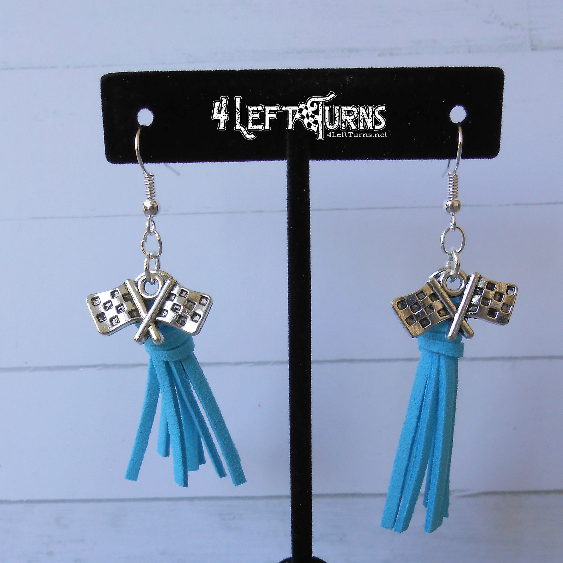 Our colorful tassel earrings with their silver tone checkered flag charms are the ultimate accessory for race night or any occasion. Tassels measure about 1.5 inches in length and are made by hand. Stainless steel earring wires.