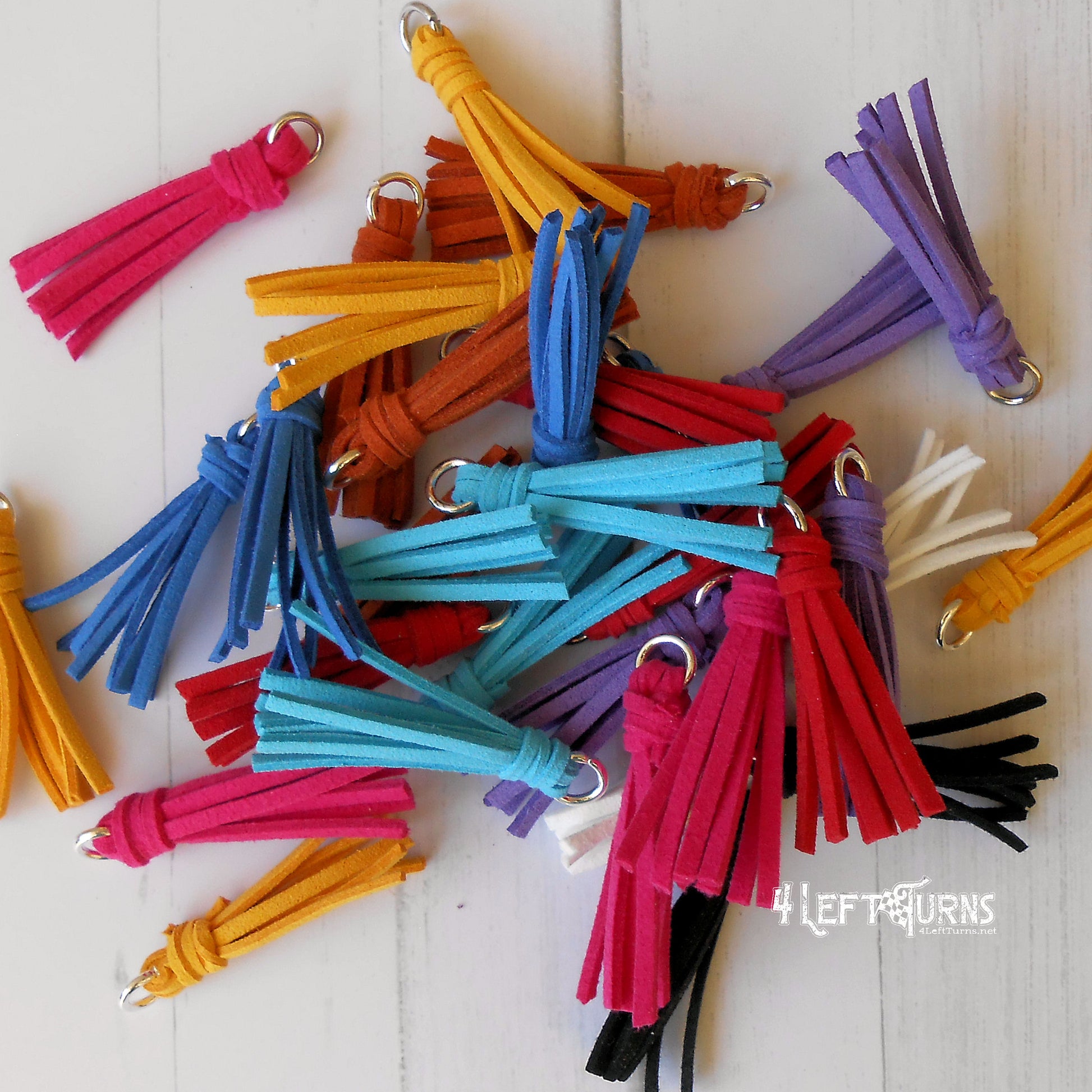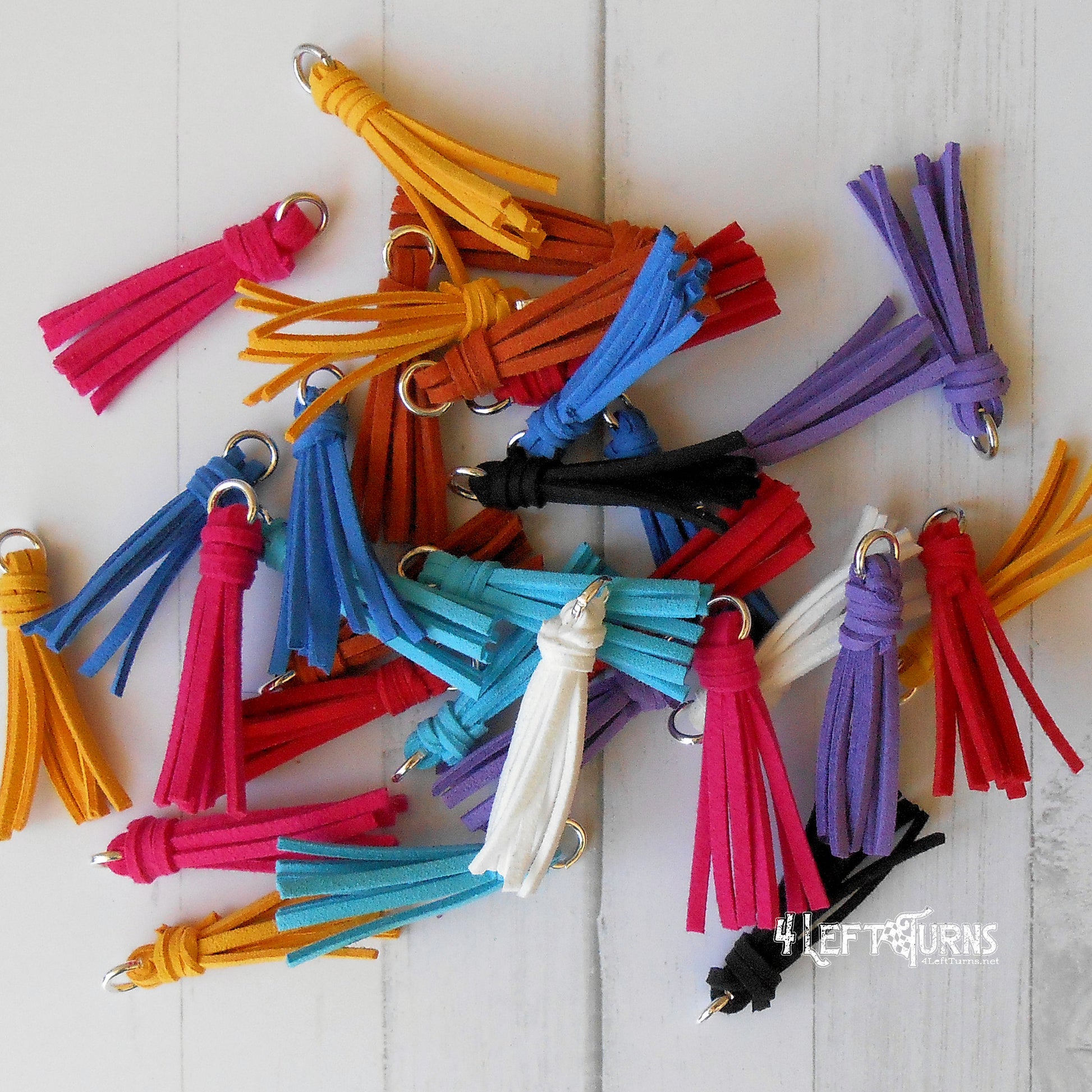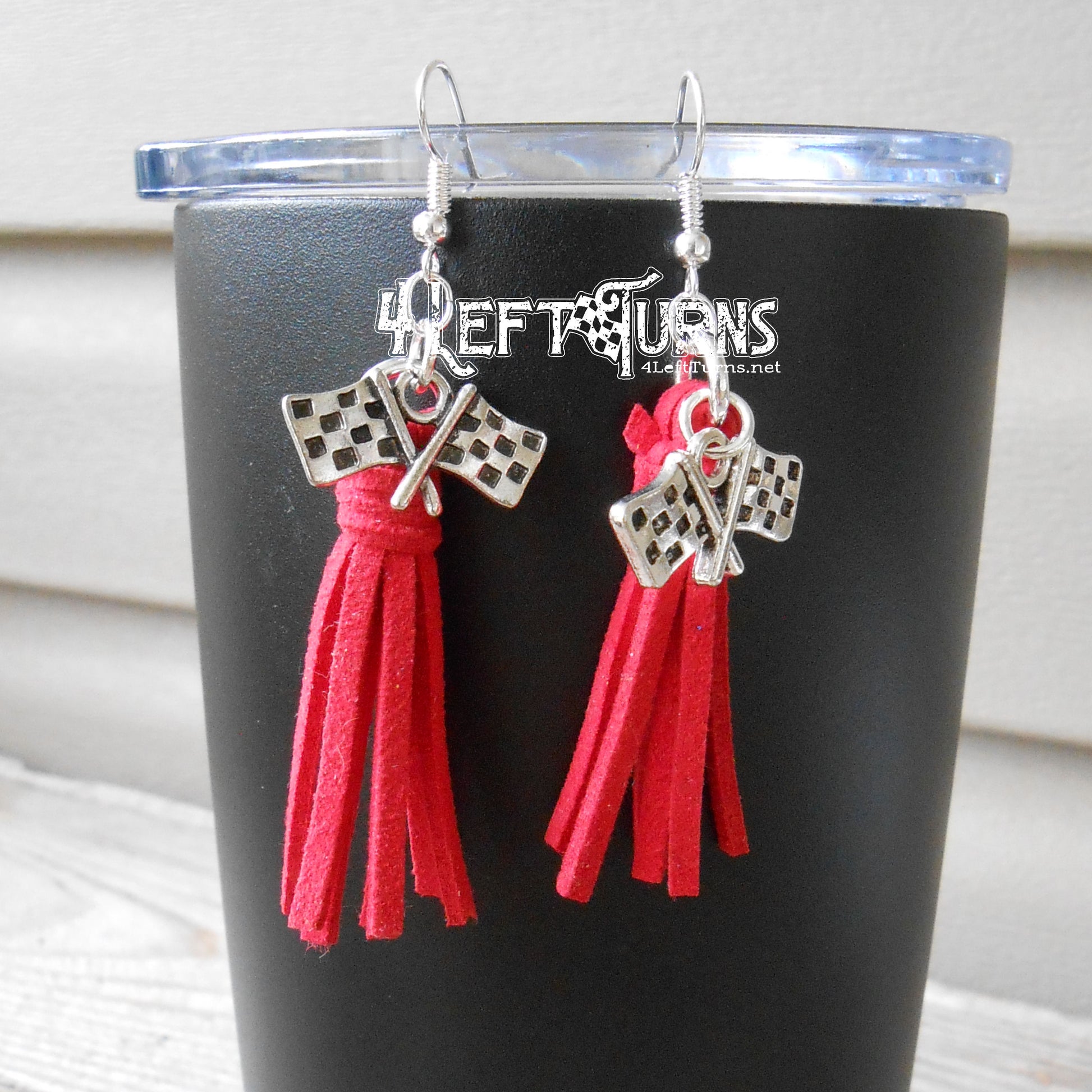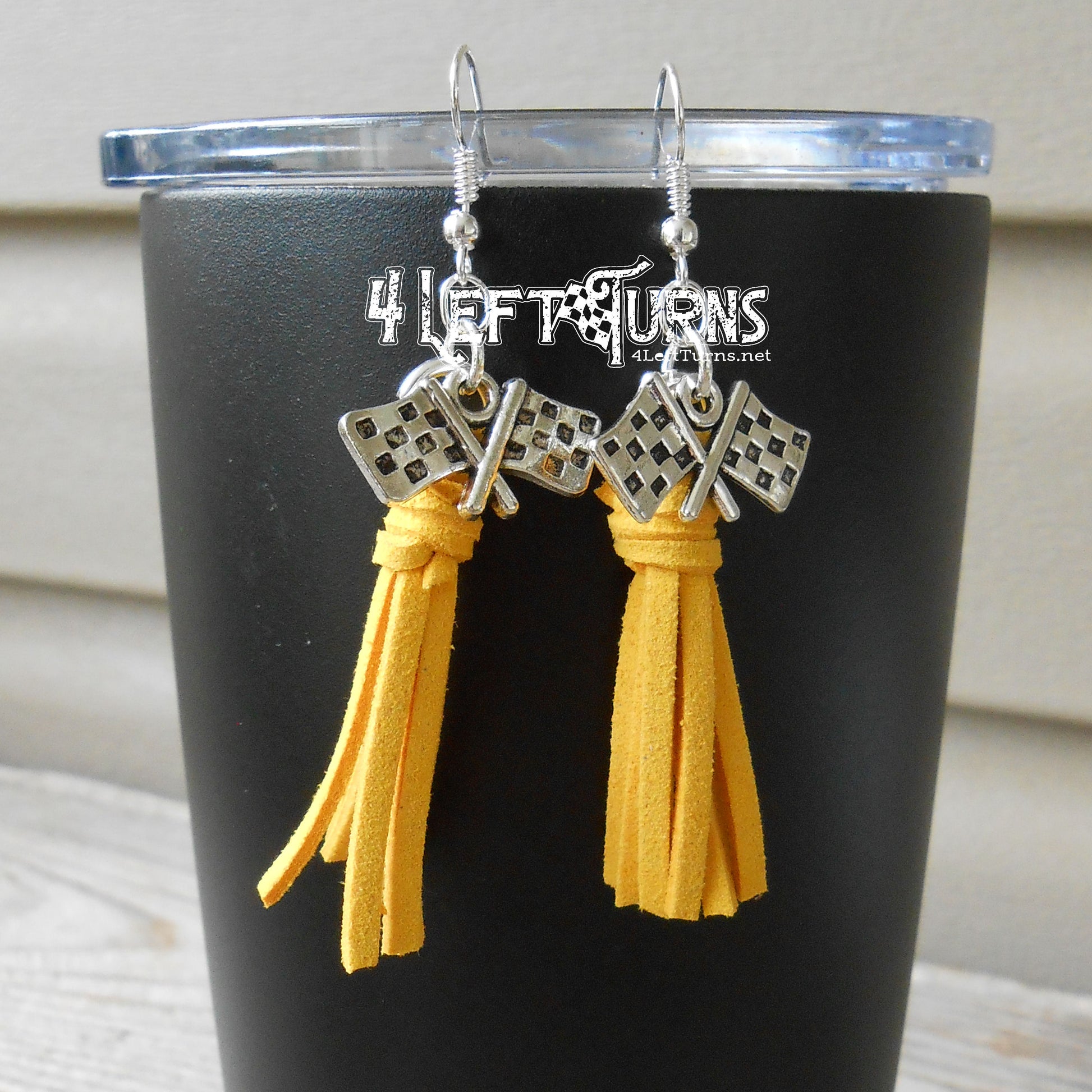 Our colorful tassel earrings with their silver tone checkered flag charms are the ultimate accessory for race night or any occasion. Tassels measure about 1.5 inches in length and are made by hand. Stainless steel earring wires.